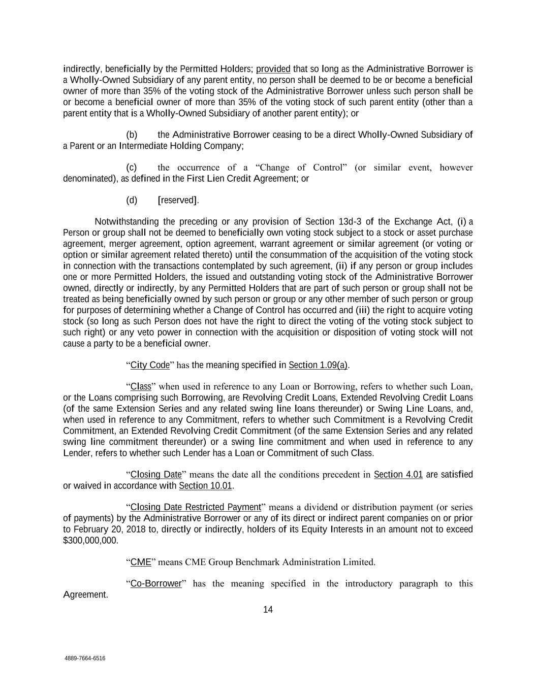 14 4889-7664-6516 indirectly, beneficially by the Permitted Holders; provided that so long as the Administrative Borrower is a Wholly-Owned Subsidiary of any parent entity, no person shall be deemed to be or become a beneficial owner of more than 35% of the voting stock of the Administrative Borrower unless such person shall be or become a beneficial owner of more than 35% of the voting stock of such parent entity (other than a parent entity that is a Wholly-Owned Subsidiary of another parent entity); or (b) the Administrative Borrower ceasing to be a direct Wholly-Owned Subsidiary of a Parent or an Intermediate Holding Company; (c) the occurrence of a “Change of Control” (or similar event, however denominated), as defined in the First Lien Credit Agreement; or (d) [reserved]. Notwithstanding the preceding or any provision of Section 13d-3 of the Exchange Act, (i) a Person or group shall not be deemed to beneficially own voting stock subject to a stock or asset purchase agreement, merger agreement, option agreement, warrant agreement or similar agreement (or voting or option or similar agreement related thereto) until the consummation of the acquisition of the voting stock in connection with the transactions contemplated by such agreement, (ii) if any person or group includes one or more Permitted Holders, the issued and outstanding voting stock of the Administrative Borrower owned, directly or indirectly, by any Permitted Holders that are part of such person or group shall not be treated as being beneficially owned by such person or group or any other member of such person or group for purposes of determining whether a Change of Control has occurred and (iii) the right to acquire voting stock (so long as such Person does not have the right to direct the voting of the voting stock subject to such right) or any veto power in connection with the acquisition or disposition of voting stock will not cause a party to be a beneficial owner. “City Code” has the meaning specified in Section 1.09(a). “Class” when used in reference to any Loan or Borrowing, refers to whether such Loan, or the Loans comprising such Borrowing, are Revolving Credit Loans, Extended Revolving Credit Loans (of the same Extension Series and any related swing line loans thereunder) or Swing Line Loans, and, when used in reference to any Commitment, refers to whether such Commitment is a Revolving Credit Commitment, an Extended Revolving Credit Commitment (of the same Extension Series and any related swing line commitment thereunder) or a swing line commitment and when used in reference to any Lender, refers to whether such Lender has a Loan or Commitment of such Class. “Closing Date” means the date all the conditions precedent in Section 4.01 are satisfied or waived in accordance with Section 10.01. “Closing Date Restricted Payment” means a dividend or distribution payment (or series of payments) by the Administrative Borrower or any of its direct or indirect parent companies on or prior to February 20, 2018 to, directly or indirectly, holders of its Equity Interests in an amount not to exceed $300,000,000. “CME” means CME Group Benchmark Administration Limited. “Co-Borrower” has the meaning specified in the introductory paragraph to this Agreement.