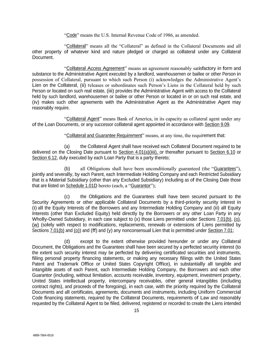 15 4889-7664-6516 “Code” means the U.S. Internal Revenue Code of 1986, as amended. “Collateral” means all the “Collateral” as defined in the Collateral Documents and all other property of whatever kind and nature pledged or charged as collateral under any Collateral Document. “Collateral Access Agreement” means an agreement reasonably satisfactory in form and substance to the Administrative Agent executed by a landlord, warehousemen or bailee or other Person in possession of Collateral, pursuant to which such Person (i) acknowledges the Administrative Agent’s Lien on the Collateral, (ii) releases or subordinates such Person’s Liens in the Collateral held by such Person or located on such real estate, (iii) provides the Administrative Agent with access to the Collateral held by such landlord, warehousemen or bailee or other Person or located in or on such real estate, and (iv) makes such other agreements with the Administrative Agent as the Administrative Agent may reasonably require. “Collateral Agent” means Bank of America, in its capacity as collateral agent under any of the Loan Documents, or any successor collateral agent appointed in accordance with Section 9.09. “Collateral and Guarantee Requirement” means, at any time, the requirement that: (a) the Collateral Agent shall have received each Collateral Document required to be delivered on the Closing Date pursuant to Section 4.01(a)(iii), or thereafter pursuant to Section 6.10 or Section 6.12, duly executed by each Loan Party that is a party thereto; (b) all Obligations shall have been unconditionally guaranteed (the “Guarantees”), jointly and severally, by each Parent, each Intermediate Holding Company and each Restricted Subsidiary that is a Material Subsidiary (other than any Excluded Subsidiary) including as of the Closing Date those that are listed on Schedule 1.01D hereto (each, a “Guarantor”); (c) the Obligations and the Guarantees shall have been secured pursuant to the Security Agreements or other applicable Collateral Documents by a third-priority security interest in (i) all the Equity Interests of the Borrowers and any Intermediate Holding Company and (ii) all Equity Interests (other than Excluded Equity) held directly by the Borrowers or any other Loan Party in any Wholly-Owned Subsidiary, in each case subject to (x) those Liens permitted under Sections 7.01(b), (o), (w) (solely with respect to modifications, replacements, renewals or extensions of Liens permitted by Sections 7.01(b) and (o)) and (ff) and (y) any nonconsensual Lien that is permitted under Section 7.01; (d) except to the extent otherwise provided hereunder or under any Collateral Document, the Obligations and the Guarantees shall have been secured by a perfected security interest (to the extent such security interest may be perfected by delivering certificated securities and instruments, filing personal property financing statements, or making any necessary filings with the United States Patent and Trademark Office or United States Copyright Office), in substantially all tangible and intangible assets of each Parent, each Intermediate Holding Company, the Borrowers and each other Guarantor (including, without limitation, accounts receivable, inventory, equipment, investment property, United States intellectual property, intercompany receivables, other general intangibles (including contract rights), and proceeds of the foregoing), in each case, with the priority required by the Collateral Documents and all certificates, agreements, documents and instruments, including Uniform Commercial Code financing statements, required by the Collateral Documents, requirements of Law and reasonably requested by the Collateral Agent to be filed, delivered, registered or recorded to create the Liens intended