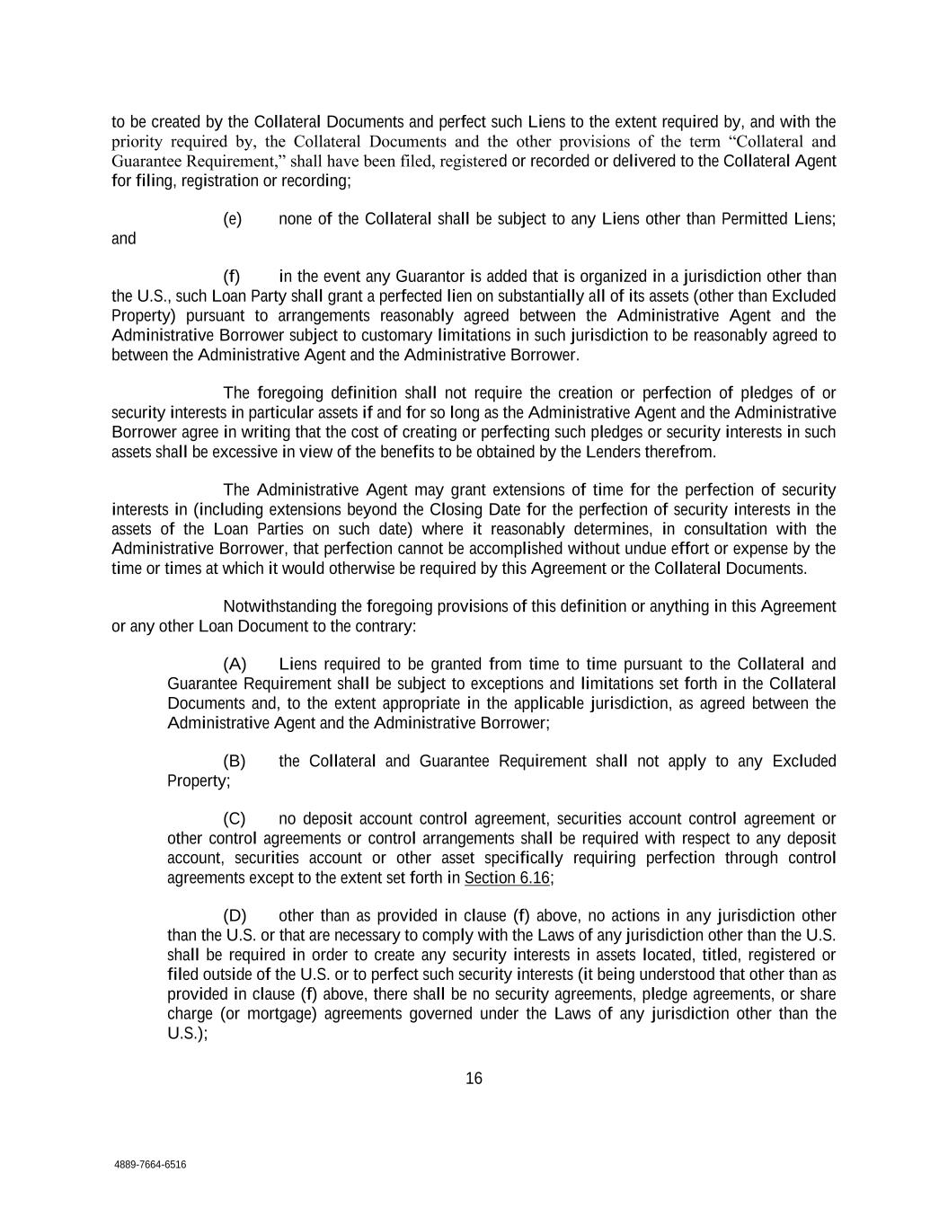 16 4889-7664-6516 to be created by the Collateral Documents and perfect such Liens to the extent required by, and with the priority required by, the Collateral Documents and the other provisions of the term “Collateral and Guarantee Requirement,” shall have been filed, registered or recorded or delivered to the Collateral Agent for filing, registration or recording; (e) none of the Collateral shall be subject to any Liens other than Permitted Liens; and (f) in the event any Guarantor is added that is organized in a jurisdiction other than the U.S., such Loan Party shall grant a perfected lien on substantially all of its assets (other than Excluded Property) pursuant to arrangements reasonably agreed between the Administrative Agent and the Administrative Borrower subject to customary limitations in such jurisdiction to be reasonably agreed to between the Administrative Agent and the Administrative Borrower. The foregoing definition shall not require the creation or perfection of pledges of or security interests in particular assets if and for so long as the Administrative Agent and the Administrative Borrower agree in writing that the cost of creating or perfecting such pledges or security interests in such assets shall be excessive in view of the benefits to be obtained by the Lenders therefrom. The Administrative Agent may grant extensions of time for the perfection of security interests in (including extensions beyond the Closing Date for the perfection of security interests in the assets of the Loan Parties on such date) where it reasonably determines, in consultation with the Administrative Borrower, that perfection cannot be accomplished without undue effort or expense by the time or times at which it would otherwise be required by this Agreement or the Collateral Documents. Notwithstanding the foregoing provisions of this definition or anything in this Agreement or any other Loan Document to the contrary: (A) Liens required to be granted from time to time pursuant to the Collateral and Guarantee Requirement shall be subject to exceptions and limitations set forth in the Collateral Documents and, to the extent appropriate in the applicable jurisdiction, as agreed between the Administrative Agent and the Administrative Borrower; (B) the Collateral and Guarantee Requirement shall not apply to any Excluded Property; (C) no deposit account control agreement, securities account control agreement or other control agreements or control arrangements shall be required with respect to any deposit account, securities account or other asset specifically requiring perfection through control agreements except to the extent set forth in Section 6.16; (D) other than as provided in clause (f) above, no actions in any jurisdiction other than the U.S. or that are necessary to comply with the Laws of any jurisdiction other than the U.S. shall be required in order to create any security interests in assets located, titled, registered or filed outside of the U.S. or to perfect such security interests (it being understood that other than as provided in clause (f) above, there shall be no security agreements, pledge agreements, or share charge (or mortgage) agreements governed under the Laws of any jurisdiction other than the U.S.);