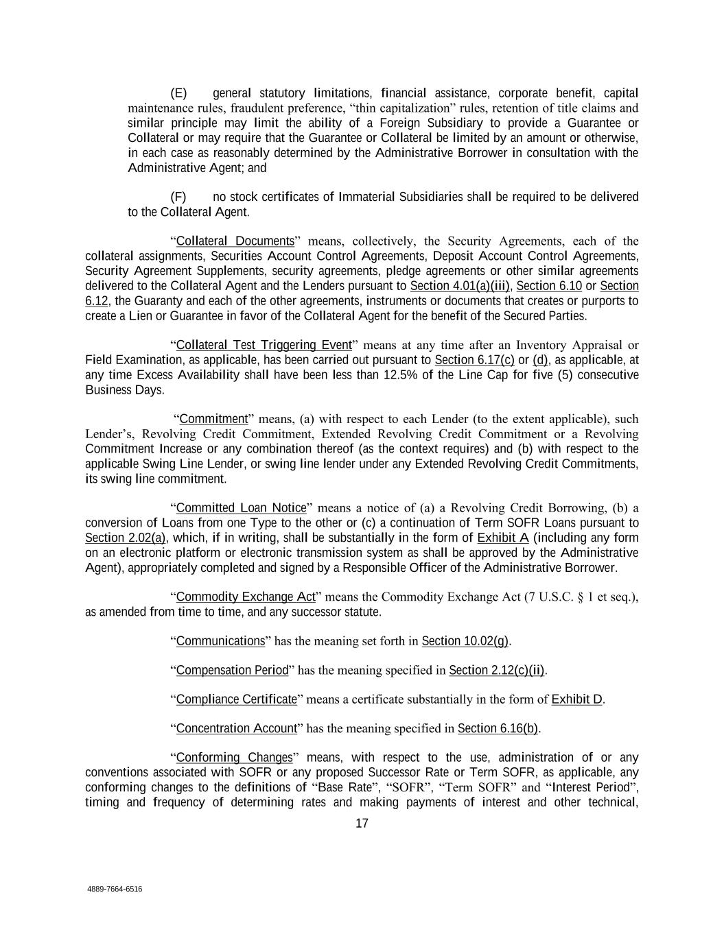 17 4889-7664-6516 (E) general statutory limitations, financial assistance, corporate benefit, capital maintenance rules, fraudulent preference, “thin capitalization” rules, retention of title claims and similar principle may limit the ability of a Foreign Subsidiary to provide a Guarantee or Collateral or may require that the Guarantee or Collateral be limited by an amount or otherwise, in each case as reasonably determined by the Administrative Borrower in consultation with the Administrative Agent; and (F) no stock certificates of Immaterial Subsidiaries shall be required to be delivered to the Collateral Agent. “Collateral Documents” means, collectively, the Security Agreements, each of the collateral assignments, Securities Account Control Agreements, Deposit Account Control Agreements, Security Agreement Supplements, security agreements, pledge agreements or other similar agreements delivered to the Collateral Agent and the Lenders pursuant to Section 4.01(a)(iii), Section 6.10 or Section 6.12, the Guaranty and each of the other agreements, instruments or documents that creates or purports to create a Lien or Guarantee in favor of the Collateral Agent for the benefit of the Secured Parties. “Collateral Test Triggering Event” means at any time after an Inventory Appraisal or Field Examination, as applicable, has been carried out pursuant to Section 6.17(c) or (d), as applicable, at any time Excess Availability shall have been less than 12.5% of the Line Cap for five (5) consecutive Business Days. “Commitment” means, (a) with respect to each Lender (to the extent applicable), such Lender’s, Revolving Credit Commitment, Extended Revolving Credit Commitment or a Revolving Commitment Increase or any combination thereof (as the context requires) and (b) with respect to the applicable Swing Line Lender, or swing line lender under any Extended Revolving Credit Commitments, its swing line commitment. “Committed Loan Notice” means a notice of (a) a Revolving Credit Borrowing, (b) a conversion of Loans from one Type to the other or (c) a continuation of Term SOFR Loans pursuant to Section 2.02(a), which, if in writing, shall be substantially in the form of Exhibit A (including any form on an electronic platform or electronic transmission system as shall be approved by the Administrative Agent), appropriately completed and signed by a Responsible Officer of the Administrative Borrower. “Commodity Exchange Act” means the Commodity Exchange Act (7 U.S.C. § 1 et seq.), as amended from time to time, and any successor statute. “Communications” has the meaning set forth in Section 10.02(g). “Compensation Period” has the meaning specified in Section 2.12(c)(ii). “Compliance Certificate” means a certificate substantially in the form of Exhibit D. “Concentration Account” has the meaning specified in Section 6.16(b). “Conforming Changes” means, with respect to the use, administration of or any conventions associated with SOFR or any proposed Successor Rate or Term SOFR, as applicable, any conforming changes to the definitions of “Base Rate”, “SOFR”, “Term SOFR” and “Interest Period”, timing and frequency of determining rates and making payments of interest and other technical,
