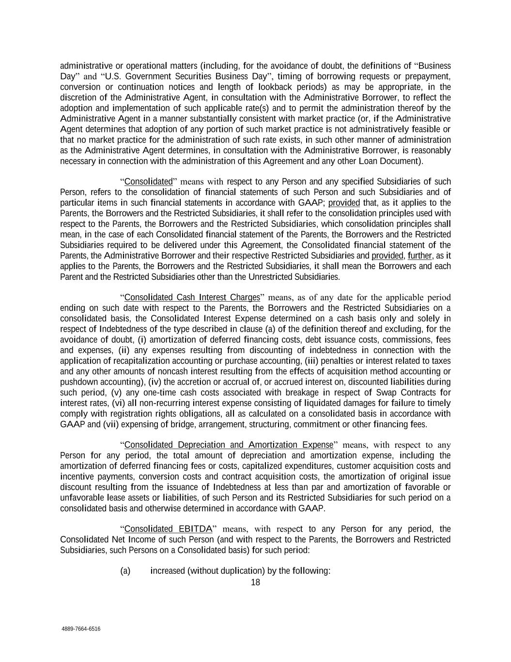18 4889-7664-6516 administrative or operational matters (including, for the avoidance of doubt, the definitions of “Business Day” and “U.S. Government Securities Business Day”, timing of borrowing requests or prepayment, conversion or continuation notices and length of lookback periods) as may be appropriate, in the discretion of the Administrative Agent, in consultation with the Administrative Borrower, to reflect the adoption and implementation of such applicable rate(s) and to permit the administration thereof by the Administrative Agent in a manner substantially consistent with market practice (or, if the Administrative Agent determines that adoption of any portion of such market practice is not administratively feasible or that no market practice for the administration of such rate exists, in such other manner of administration as the Administrative Agent determines, in consultation with the Administrative Borrower, is reasonably necessary in connection with the administration of this Agreement and any other Loan Document). “Consolidated” means with respect to any Person and any specified Subsidiaries of such Person, refers to the consolidation of financial statements of such Person and such Subsidiaries and of particular items in such financial statements in accordance with GAAP; provided that, as it applies to the Parents, the Borrowers and the Restricted Subsidiaries, it shall refer to the consolidation principles used with respect to the Parents, the Borrowers and the Restricted Subsidiaries, which consolidation principles shall mean, in the case of each Consolidated financial statement of the Parents, the Borrowers and the Restricted Subsidiaries required to be delivered under this Agreement, the Consolidated financial statement of the Parents, the Administrative Borrower and their respective Restricted Subsidiaries and provided, further, as it applies to the Parents, the Borrowers and the Restricted Subsidiaries, it shall mean the Borrowers and each Parent and the Restricted Subsidiaries other than the Unrestricted Subsidiaries. “Consolidated Cash Interest Charges” means, as of any date for the applicable period ending on such date with respect to the Parents, the Borrowers and the Restricted Subsidiaries on a consolidated basis, the Consolidated Interest Expense determined on a cash basis only and solely in respect of Indebtedness of the type described in clause (a) of the definition thereof and excluding, for the avoidance of doubt, (i) amortization of deferred financing costs, debt issuance costs, commissions, fees and expenses, (ii) any expenses resulting from discounting of indebtedness in connection with the application of recapitalization accounting or purchase accounting, (iii) penalties or interest related to taxes and any other amounts of noncash interest resulting from the effects of acquisition method accounting or pushdown accounting), (iv) the accretion or accrual of, or accrued interest on, discounted liabilities during such period, (v) any one-time cash costs associated with breakage in respect of Swap Contracts for interest rates, (vi) all non-recurring interest expense consisting of liquidated damages for failure to timely comply with registration rights obligations, all as calculated on a consolidated basis in accordance with GAAP and (vii) expensing of bridge, arrangement, structuring, commitment or other financing fees. “Consolidated Depreciation and Amortization Expense” means, with respect to any Person for any period, the total amount of depreciation and amortization expense, including the amortization of deferred financing fees or costs, capitalized expenditures, customer acquisition costs and incentive payments, conversion costs and contract acquisition costs, the amortization of original issue discount resulting from the issuance of Indebtedness at less than par and amortization of favorable or unfavorable lease assets or liabilities, of such Person and its Restricted Subsidiaries for such period on a consolidated basis and otherwise determined in accordance with GAAP. “Consolidated EBITDA” means, with respect to any Person for any period, the Consolidated Net Income of such Person (and with respect to the Parents, the Borrowers and Restricted Subsidiaries, such Persons on a Consolidated basis) for such period: (a) increased (without duplication) by the following: