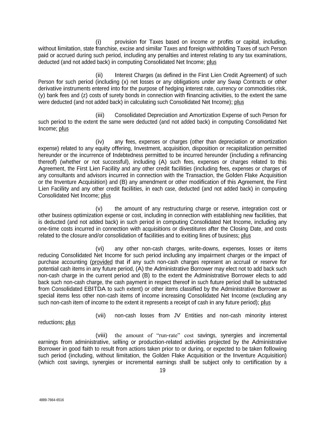 19 4889-7664-6516 (i) provision for Taxes based on income or profits or capital, including, without limitation, state franchise, excise and similar Taxes and foreign withholding Taxes of such Person paid or accrued during such period, including any penalties and interest relating to any tax examinations, deducted (and not added back) in computing Consolidated Net Income; plus (ii) Interest Charges (as defined in the First Lien Credit Agreement) of such Person for such period (including (x) net losses or any obligations under any Swap Contracts or other derivative instruments entered into for the purpose of hedging interest rate, currency or commodities risk, (y) bank fees and (z) costs of surety bonds in connection with financing activities, to the extent the same were deducted (and not added back) in calculating such Consolidated Net Income); plus (iii) Consolidated Depreciation and Amortization Expense of such Person for such period to the extent the same were deducted (and not added back) in computing Consolidated Net Income; plus (iv) any fees, expenses or charges (other than depreciation or amortization expense) related to any equity offering, Investment, acquisition, disposition or recapitalization permitted hereunder or the incurrence of Indebtedness permitted to be incurred hereunder (including a refinancing thereof) (whether or not successful), including (A) such fees, expenses or charges related to this Agreement, the First Lien Facility and any other credit facilities (including fees, expenses or charges of any consultants and advisors incurred in connection with the Transaction, the Golden Flake Acquisition or the Inventure Acquisition) and (B) any amendment or other modification of this Agreement, the First Lien Facility and any other credit facilities, in each case, deducted (and not added back) in computing Consolidated Net Income; plus (v) the amount of any restructuring charge or reserve, integration cost or other business optimization expense or cost, including in connection with establishing new facilities, that is deducted (and not added back) in such period in computing Consolidated Net Income, including any one-time costs incurred in connection with acquisitions or divestitures after the Closing Date, and costs related to the closure and/or consolidation of facilities and to exiting lines of business; plus (vi) any other non-cash charges, write-downs, expenses, losses or items reducing Consolidated Net Income for such period including any impairment charges or the impact of purchase accounting (provided that if any such non-cash charges represent an accrual or reserve for potential cash items in any future period, (A) the Administrative Borrower may elect not to add back such non-cash charge in the current period and (B) to the extent the Administrative Borrower elects to add back such non-cash charge, the cash payment in respect thereof in such future period shall be subtracted from Consolidated EBITDA to such extent) or other items classified by the Administrative Borrower as special items less other non-cash items of income increasing Consolidated Net Income (excluding any such non-cash item of income to the extent it represents a receipt of cash in any future period); plus (vii) non-cash losses from JV Entities and non-cash minority interest reductions; plus (viii) the amount of “run-rate” cost savings, synergies and incremental earnings from administrative, selling or production-related activities projected by the Administrative Borrower in good faith to result from actions taken prior to or during, or expected to be taken following such period (including, without limitation, the Golden Flake Acquisition or the Inventure Acquisition) (which cost savings, synergies or incremental earnings shall be subject only to certification by a