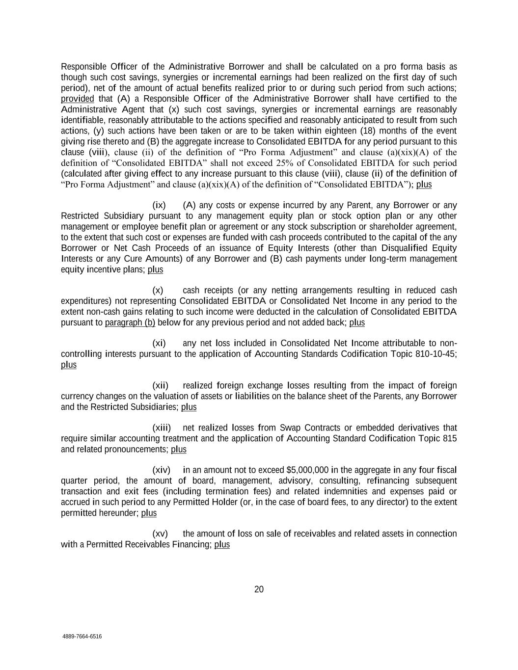 20 4889-7664-6516 Responsible Officer of the Administrative Borrower and shall be calculated on a pro forma basis as though such cost savings, synergies or incremental earnings had been realized on the first day of such period), net of the amount of actual benefits realized prior to or during such period from such actions; provided that (A) a Responsible Officer of the Administrative Borrower shall have certified to the Administrative Agent that (x) such cost savings, synergies or incremental earnings are reasonably identifiable, reasonably attributable to the actions specified and reasonably anticipated to result from such actions, (y) such actions have been taken or are to be taken within eighteen (18) months of the event giving rise thereto and (B) the aggregate increase to Consolidated EBITDA for any period pursuant to this clause (viii), clause (ii) of the definition of “Pro Forma Adjustment” and clause (a)(xix)(A) of the definition of “Consolidated EBITDA” shall not exceed 25% of Consolidated EBITDA for such period (calculated after giving effect to any increase pursuant to this clause (viii), clause (ii) of the definition of “Pro Forma Adjustment” and clause (a)(xix)(A) of the definition of “Consolidated EBITDA”); plus (ix) (A) any costs or expense incurred by any Parent, any Borrower or any Restricted Subsidiary pursuant to any management equity plan or stock option plan or any other management or employee benefit plan or agreement or any stock subscription or shareholder agreement, to the extent that such cost or expenses are funded with cash proceeds contributed to the capital of the any Borrower or Net Cash Proceeds of an issuance of Equity Interests (other than Disqualified Equity Interests or any Cure Amounts) of any Borrower and (B) cash payments under long-term management equity incentive plans; plus (x) cash receipts (or any netting arrangements resulting in reduced cash expenditures) not representing Consolidated EBITDA or Consolidated Net Income in any period to the extent non-cash gains relating to such income were deducted in the calculation of Consolidated EBITDA pursuant to paragraph (b) below for any previous period and not added back; plus (xi) any net loss included in Consolidated Net Income attributable to non- controlling interests pursuant to the application of Accounting Standards Codification Topic 810-10-45; plus (xii) realized foreign exchange losses resulting from the impact of foreign currency changes on the valuation of assets or liabilities on the balance sheet of the Parents, any Borrower and the Restricted Subsidiaries; plus (xiii) net realized losses from Swap Contracts or embedded derivatives that require similar accounting treatment and the application of Accounting Standard Codification Topic 815 and related pronouncements; plus (xiv) in an amount not to exceed $5,000,000 in the aggregate in any four fiscal quarter period, the amount of board, management, advisory, consulting, refinancing subsequent transaction and exit fees (including termination fees) and related indemnities and expenses paid or accrued in such period to any Permitted Holder (or, in the case of board fees, to any director) to the extent permitted hereunder; plus (xv) the amount of loss on sale of receivables and related assets in connection with a Permitted Receivables Financing; plus