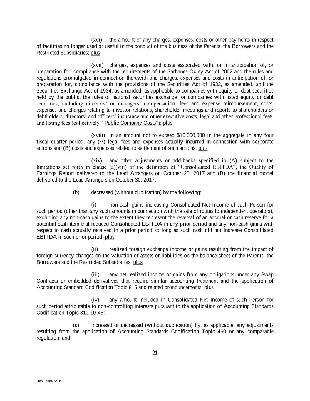 21 4889-7664-6516 (xvi) the amount of any charges, expenses, costs or other payments in respect of facilities no longer used or useful in the conduct of the business of the Parents, the Borrowers and the Restricted Subsidiaries; plus (xvii) charges, expenses and costs associated with, or in anticipation of, or preparation for, compliance with the requirements of the Sarbanes-Oxley Act of 2002 and the rules and regulations promulgated in connection therewith and charges, expenses and costs in anticipation of, or preparation for, compliance with the provisions of the Securities Act of 1933, as amended, and the Securities Exchange Act of 1934, as amended, as applicable to companies with equity or debt securities held by the public, the rules of national securities exchange for companies with listed equity or debt securities, including directors’ or managers’ compensation, fees and expense reimbursement, costs, expenses and charges relating to investor relations, shareholder meetings and reports to shareholders or debtholders, directors’ and officers’ insurance and other executive costs, legal and other professional fees, and listing fees (collectively, “Public Company Costs”); plus (xviii) in an amount not to exceed $10,000,000 in the aggregate in any four fiscal quarter period, any (A) legal fees and expenses actually incurred in connection with corporate actions and (B) costs and expenses related to settlement of such actions; plus (xix) any other adjustments or add-backs specified in (A) subject to the limitations set forth in clause (a)(viii) of the definition of “Consolidated EBITDA”, the Quality of Earnings Report delivered to the Lead Arrangers on October 20, 2017 and (B) the financial model delivered to the Lead Arrangers on October 30, 2017; (b) decreased (without duplication) by the following: (i) non-cash gains increasing Consolidated Net Income of such Person for such period (other than any such amounts in connection with the sale of routes to independent operators), excluding any non-cash gains to the extent they represent the reversal of an accrual or cash reserve for a potential cash item that reduced Consolidated EBITDA in any prior period and any non-cash gains with respect to cash actually received in a prior period so long as such cash did not increase Consolidated EBITDA in such prior period; plus (ii) realized foreign exchange income or gains resulting from the impact of foreign currency changes on the valuation of assets or liabilities on the balance sheet of the Parents, the Borrowers and the Restricted Subsidiaries; plus (iii) any net realized income or gains from any obligations under any Swap Contracts or embedded derivatives that require similar accounting treatment and the application of Accounting Standard Codification Topic 815 and related pronouncements; plus (iv) any amount included in Consolidated Net Income of such Person for such period attributable to non-controlling interests pursuant to the application of Accounting Standards Codification Topic 810-10-45; (c) increased or decreased (without duplication) by, as applicable, any adjustments resulting from the application of Accounting Standards Codification Topic 460 or any comparable regulation; and