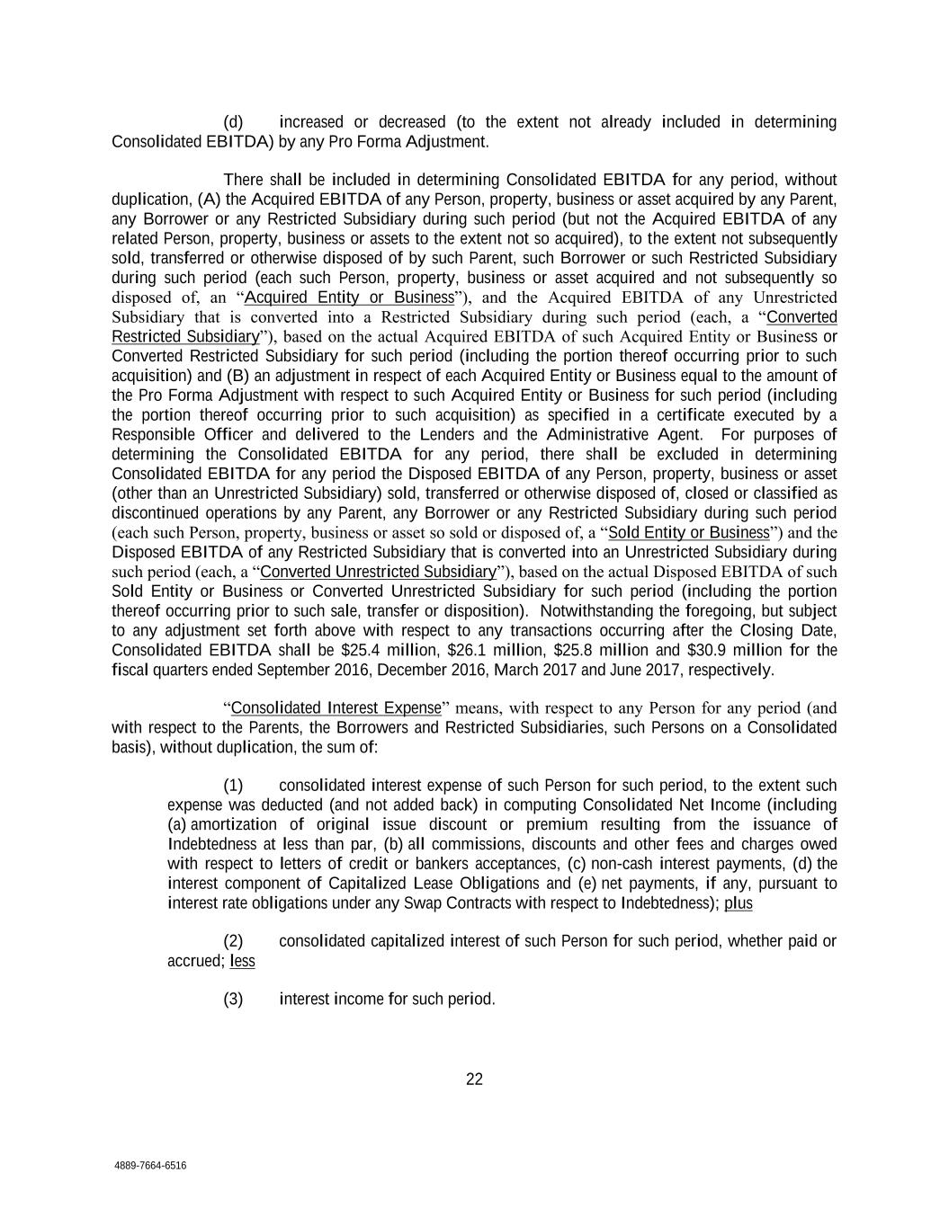 22 4889-7664-6516 (d) increased or decreased (to the extent not already included in determining Consolidated EBITDA) by any Pro Forma Adjustment. There shall be included in determining Consolidated EBITDA for any period, without duplication, (A) the Acquired EBITDA of any Person, property, business or asset acquired by any Parent, any Borrower or any Restricted Subsidiary during such period (but not the Acquired EBITDA of any related Person, property, business or assets to the extent not so acquired), to the extent not subsequently sold, transferred or otherwise disposed of by such Parent, such Borrower or such Restricted Subsidiary during such period (each such Person, property, business or asset acquired and not subsequently so disposed of, an “Acquired Entity or Business”), and the Acquired EBITDA of any Unrestricted Subsidiary that is converted into a Restricted Subsidiary during such period (each, a “Converted Restricted Subsidiary”), based on the actual Acquired EBITDA of such Acquired Entity or Business or Converted Restricted Subsidiary for such period (including the portion thereof occurring prior to such acquisition) and (B) an adjustment in respect of each Acquired Entity or Business equal to the amount of the Pro Forma Adjustment with respect to such Acquired Entity or Business for such period (including the portion thereof occurring prior to such acquisition) as specified in a certificate executed by a Responsible Officer and delivered to the Lenders and the Administrative Agent. For purposes of determining the Consolidated EBITDA for any period, there shall be excluded in determining Consolidated EBITDA for any period the Disposed EBITDA of any Person, property, business or asset (other than an Unrestricted Subsidiary) sold, transferred or otherwise disposed of, closed or classified as discontinued operations by any Parent, any Borrower or any Restricted Subsidiary during such period (each such Person, property, business or asset so sold or disposed of, a “Sold Entity or Business”) and the Disposed EBITDA of any Restricted Subsidiary that is converted into an Unrestricted Subsidiary during such period (each, a “Converted Unrestricted Subsidiary”), based on the actual Disposed EBITDA of such Sold Entity or Business or Converted Unrestricted Subsidiary for such period (including the portion thereof occurring prior to such sale, transfer or disposition). Notwithstanding the foregoing, but subject to any adjustment set forth above with respect to any transactions occurring after the Closing Date, Consolidated EBITDA shall be $25.4 million, $26.1 million, $25.8 million and $30.9 million for the fiscal quarters ended September 2016, December 2016, March 2017 and June 2017, respectively. “Consolidated Interest Expense” means, with respect to any Person for any period (and with respect to the Parents, the Borrowers and Restricted Subsidiaries, such Persons on a Consolidated basis), without duplication, the sum of: (1) consolidated interest expense of such Person for such period, to the extent such expense was deducted (and not added back) in computing Consolidated Net Income (including (a) amortization of original issue discount or premium resulting from the issuance of Indebtedness at less than par, (b) all commissions, discounts and other fees and charges owed with respect to letters of credit or bankers acceptances, (c) non-cash interest payments, (d) the interest component of Capitalized Lease Obligations and (e) net payments, if any, pursuant to interest rate obligations under any Swap Contracts with respect to Indebtedness); plus (2) consolidated capitalized interest of such Person for such period, whether paid or accrued; less (3) interest income for such period.