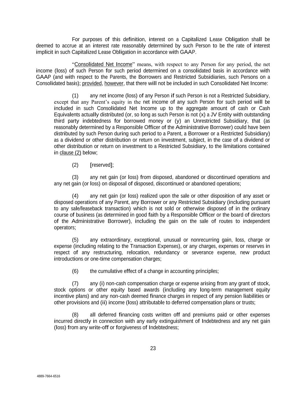 23 4889-7664-6516 For purposes of this definition, interest on a Capitalized Lease Obligation shall be deemed to accrue at an interest rate reasonably determined by such Person to be the rate of interest implicit in such Capitalized Lease Obligation in accordance with GAAP. “Consolidated Net Income” means, with respect to any Person for any period, the net income (loss) of such Person for such period determined on a consolidated basis in accordance with GAAP (and with respect to the Parents, the Borrowers and Restricted Subsidiaries, such Persons on a Consolidated basis); provided, however, that there will not be included in such Consolidated Net Income: (1) any net income (loss) of any Person if such Person is not a Restricted Subsidiary, except that any Parent’s equity in the net income of any such Person for such period will be included in such Consolidated Net Income up to the aggregate amount of cash or Cash Equivalents actually distributed (or, so long as such Person is not (x) a JV Entity with outstanding third party indebtedness for borrowed money or (y) an Unrestricted Subsidiary, that (as reasonably determined by a Responsible Officer of the Administrative Borrower) could have been distributed by such Person during such period to a Parent, a Borrower or a Restricted Subsidiary) as a dividend or other distribution or return on investment, subject, in the case of a dividend or other distribution or return on investment to a Restricted Subsidiary, to the limitations contained in clause (2) below; (2) [reserved]; (3) any net gain (or loss) from disposed, abandoned or discontinued operations and any net gain (or loss) on disposal of disposed, discontinued or abandoned operations; (4) any net gain (or loss) realized upon the sale or other disposition of any asset or disposed operations of any Parent, any Borrower or any Restricted Subsidiary (including pursuant to any sale/leaseback transaction) which is not sold or otherwise disposed of in the ordinary course of business (as determined in good faith by a Responsible Officer or the board of directors of the Administrative Borrower), including the gain on the sale of routes to independent operators; (5) any extraordinary, exceptional, unusual or nonrecurring gain, loss, charge or expense (including relating to the Transaction Expenses), or any charges, expenses or reserves in respect of any restructuring, relocation, redundancy or severance expense, new product introductions or one-time compensation charges; (6) the cumulative effect of a change in accounting principles; (7) any (i) non-cash compensation charge or expense arising from any grant of stock, stock options or other equity based awards (including any long-term management equity incentive plans) and any non-cash deemed finance charges in respect of any pension liabilities or other provisions and (ii) income (loss) attributable to deferred compensation plans or trusts; (8) all deferred financing costs written off and premiums paid or other expenses incurred directly in connection with any early extinguishment of Indebtedness and any net gain (loss) from any write-off or forgiveness of Indebtedness;