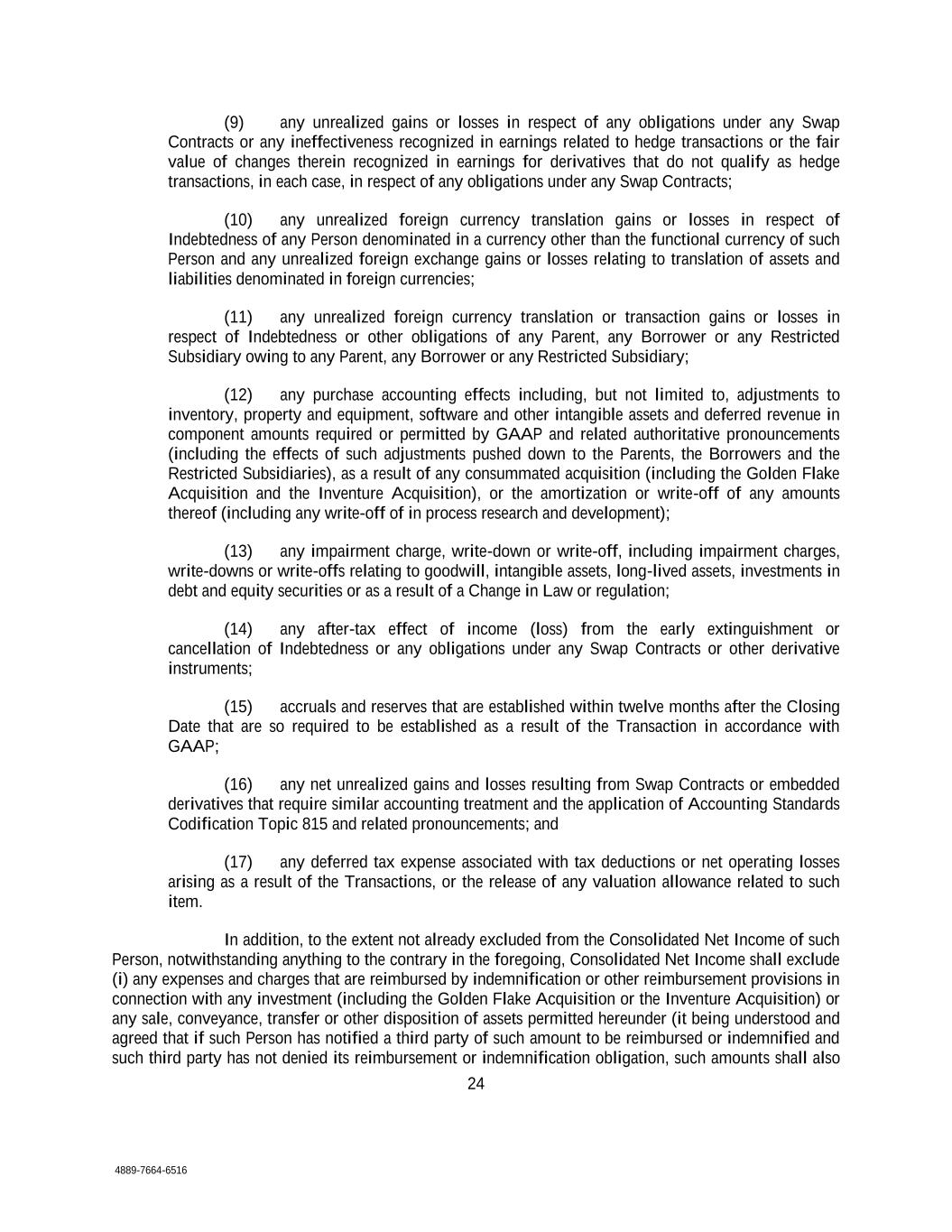 24 4889-7664-6516 (9) any unrealized gains or losses in respect of any obligations under any Swap Contracts or any ineffectiveness recognized in earnings related to hedge transactions or the fair value of changes therein recognized in earnings for derivatives that do not qualify as hedge transactions, in each case, in respect of any obligations under any Swap Contracts; (10) any unrealized foreign currency translation gains or losses in respect of Indebtedness of any Person denominated in a currency other than the functional currency of such Person and any unrealized foreign exchange gains or losses relating to translation of assets and liabilities denominated in foreign currencies; (11) any unrealized foreign currency translation or transaction gains or losses in respect of Indebtedness or other obligations of any Parent, any Borrower or any Restricted Subsidiary owing to any Parent, any Borrower or any Restricted Subsidiary; (12) any purchase accounting effects including, but not limited to, adjustments to inventory, property and equipment, software and other intangible assets and deferred revenue in component amounts required or permitted by GAAP and related authoritative pronouncements (including the effects of such adjustments pushed down to the Parents, the Borrowers and the Restricted Subsidiaries), as a result of any consummated acquisition (including the Golden Flake Acquisition and the Inventure Acquisition), or the amortization or write-off of any amounts thereof (including any write-off of in process research and development); (13) any impairment charge, write-down or write-off, including impairment charges, write-downs or write-offs relating to goodwill, intangible assets, long-lived assets, investments in debt and equity securities or as a result of a Change in Law or regulation; (14) any after-tax effect of income (loss) from the early extinguishment or cancellation of Indebtedness or any obligations under any Swap Contracts or other derivative instruments; (15) accruals and reserves that are established within twelve months after the Closing Date that are so required to be established as a result of the Transaction in accordance with GAAP; (16) any net unrealized gains and losses resulting from Swap Contracts or embedded derivatives that require similar accounting treatment and the application of Accounting Standards Codification Topic 815 and related pronouncements; and (17) any deferred tax expense associated with tax deductions or net operating losses arising as a result of the Transactions, or the release of any valuation allowance related to such item. In addition, to the extent not already excluded from the Consolidated Net Income of such Person, notwithstanding anything to the contrary in the foregoing, Consolidated Net Income shall exclude (i) any expenses and charges that are reimbursed by indemnification or other reimbursement provisions in connection with any investment (including the Golden Flake Acquisition or the Inventure Acquisition) or any sale, conveyance, transfer or other disposition of assets permitted hereunder (it being understood and agreed that if such Person has notified a third party of such amount to be reimbursed or indemnified and such third party has not denied its reimbursement or indemnification obligation, such amounts shall also