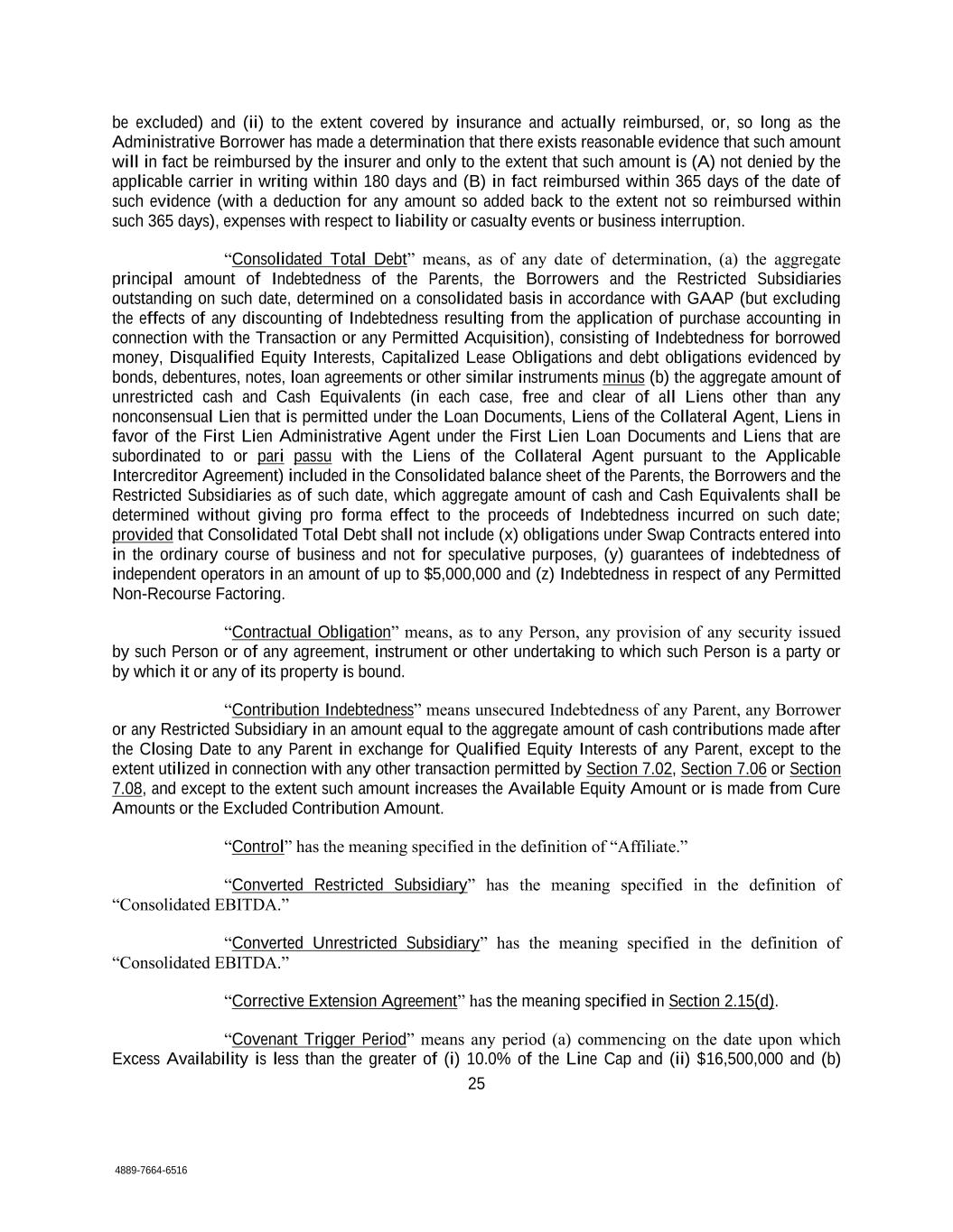 25 4889-7664-6516 be excluded) and (ii) to the extent covered by insurance and actually reimbursed, or, so long as the Administrative Borrower has made a determination that there exists reasonable evidence that such amount will in fact be reimbursed by the insurer and only to the extent that such amount is (A) not denied by the applicable carrier in writing within 180 days and (B) in fact reimbursed within 365 days of the date of such evidence (with a deduction for any amount so added back to the extent not so reimbursed within such 365 days), expenses with respect to liability or casualty events or business interruption. “Consolidated Total Debt” means, as of any date of determination, (a) the aggregate principal amount of Indebtedness of the Parents, the Borrowers and the Restricted Subsidiaries outstanding on such date, determined on a consolidated basis in accordance with GAAP (but excluding the effects of any discounting of Indebtedness resulting from the application of purchase accounting in connection with the Transaction or any Permitted Acquisition), consisting of Indebtedness for borrowed money, Disqualified Equity Interests, Capitalized Lease Obligations and debt obligations evidenced by bonds, debentures, notes, loan agreements or other similar instruments minus (b) the aggregate amount of unrestricted cash and Cash Equivalents (in each case, free and clear of all Liens other than any nonconsensual Lien that is permitted under the Loan Documents, Liens of the Collateral Agent, Liens in favor of the First Lien Administrative Agent under the First Lien Loan Documents and Liens that are subordinated to or pari passu with the Liens of the Collateral Agent pursuant to the Applicable Intercreditor Agreement) included in the Consolidated balance sheet of the Parents, the Borrowers and the Restricted Subsidiaries as of such date, which aggregate amount of cash and Cash Equivalents shall be determined without giving pro forma effect to the proceeds of Indebtedness incurred on such date; provided that Consolidated Total Debt shall not include (x) obligations under Swap Contracts entered into in the ordinary course of business and not for speculative purposes, (y) guarantees of indebtedness of independent operators in an amount of up to $5,000,000 and (z) Indebtedness in respect of any Permitted Non-Recourse Factoring. “Contractual Obligation” means, as to any Person, any provision of any security issued by such Person or of any agreement, instrument or other undertaking to which such Person is a party or by which it or any of its property is bound. “Contribution Indebtedness” means unsecured Indebtedness of any Parent, any Borrower or any Restricted Subsidiary in an amount equal to the aggregate amount of cash contributions made after the Closing Date to any Parent in exchange for Qualified Equity Interests of any Parent, except to the extent utilized in connection with any other transaction permitted by Section 7.02, Section 7.06 or Section 7.08, and except to the extent such amount increases the Available Equity Amount or is made from Cure Amounts or the Excluded Contribution Amount. “Control” has the meaning specified in the definition of “Affiliate.” “Converted Restricted Subsidiary” has the meaning specified in the definition of “Consolidated EBITDA.” “Converted Unrestricted Subsidiary” has the meaning specified in the definition of “Consolidated EBITDA.” “Corrective Extension Agreement” has the meaning specified in Section 2.15(d). “Covenant Trigger Period” means any period (a) commencing on the date upon which Excess Availability is less than the greater of (i) 10.0% of the Line Cap and (ii) $16,500,000 and (b)