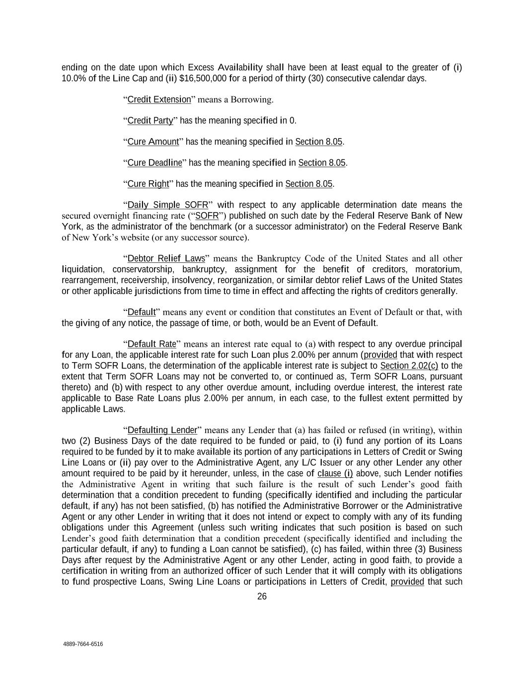 26 4889-7664-6516 ending on the date upon which Excess Availability shall have been at least equal to the greater of (i) 10.0% of the Line Cap and (ii) $16,500,000 for a period of thirty (30) consecutive calendar days. “Credit Extension” means a Borrowing. “Credit Party” has the meaning specified in 0. “Cure Amount” has the meaning specified in Section 8.05. “Cure Deadline” has the meaning specified in Section 8.05. “Cure Right” has the meaning specified in Section 8.05. “Daily Simple SOFR” with respect to any applicable determination date means the secured overnight financing rate (“SOFR”) published on such date by the Federal Reserve Bank of New York, as the administrator of the benchmark (or a successor administrator) on the Federal Reserve Bank of New York’s website (or any successor source). “Debtor Relief Laws” means the Bankruptcy Code of the United States and all other liquidation, conservatorship, bankruptcy, assignment for the benefit of creditors, moratorium, rearrangement, receivership, insolvency, reorganization, or similar debtor relief Laws of the United States or other applicable jurisdictions from time to time in effect and affecting the rights of creditors generally. “Default” means any event or condition that constitutes an Event of Default or that, with the giving of any notice, the passage of time, or both, would be an Event of Default. “Default Rate” means an interest rate equal to (a) with respect to any overdue principal for any Loan, the applicable interest rate for such Loan plus 2.00% per annum (provided that with respect to Term SOFR Loans, the determination of the applicable interest rate is subject to Section 2.02(c) to the extent that Term SOFR Loans may not be converted to, or continued as, Term SOFR Loans, pursuant thereto) and (b) with respect to any other overdue amount, including overdue interest, the interest rate applicable to Base Rate Loans plus 2.00% per annum, in each case, to the fullest extent permitted by applicable Laws. “Defaulting Lender” means any Lender that (a) has failed or refused (in writing), within two (2) Business Days of the date required to be funded or paid, to (i) fund any portion of its Loans required to be funded by it to make available its portion of any participations in Letters of Credit or Swing Line Loans or (ii) pay over to the Administrative Agent, any L/C Issuer or any other Lender any other amount required to be paid by it hereunder, unless, in the case of clause (i) above, such Lender notifies the Administrative Agent in writing that such failure is the result of such Lender’s good faith determination that a condition precedent to funding (specifically identified and including the particular default, if any) has not been satisfied, (b) has notified the Administrative Borrower or the Administrative Agent or any other Lender in writing that it does not intend or expect to comply with any of its funding obligations under this Agreement (unless such writing indicates that such position is based on such Lender’s good faith determination that a condition precedent (specifically identified and including the particular default, if any) to funding a Loan cannot be satisfied), (c) has failed, within three (3) Business Days after request by the Administrative Agent or any other Lender, acting in good faith, to provide a certification in writing from an authorized officer of such Lender that it will comply with its obligations to fund prospective Loans, Swing Line Loans or participations in Letters of Credit, provided that such