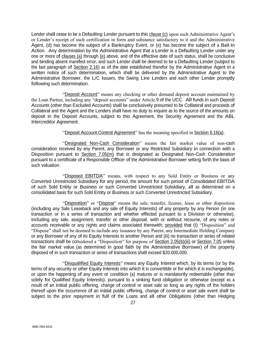 27 4889-7664-6516 Lender shall cease to be a Defaulting Lender pursuant to this clause (c) upon such Administrative Agent’s or Lender’s receipt of such certification in form and substance satisfactory to it and the Administrative Agent, (d) has become the subject of a Bankruptcy Event, or (e) has become the subject of a Bail-In Action. Any determination by the Administrative Agent that a Lender is a Defaulting Lender under any one or more of clauses (a) through (e) above, and of the effective date of such status, shall be conclusive and binding absent manifest error, and such Lender shall be deemed to be a Defaulting Lender (subject to the last paragraph of Section 2.16) as of the date established therefor by the Administrative Agent in a written notice of such determination, which shall be delivered by the Administrative Agent to the Administrative Borrower, the L/C Issuers, the Swing Line Lenders and each other Lender promptly following such determination. “Deposit Account” means any checking or other demand deposit account maintained by the Loan Parties, including any “deposit accounts” under Article 9 of the UCC. All funds in such Deposit Accounts (other than Excluded Accounts) shall be conclusively presumed to be Collateral and proceeds of Collateral and the Agent and the Lenders shall have no duty to inquire as to the source of the amounts on deposit in the Deposit Accounts, subject to this Agreement, the Security Agreement and the ABL Intercreditor Agreement. “Deposit Account Control Agreement” has the meaning specified in Section 6.16(a). “Designated Non-Cash Consideration” means the fair market value of non-cash consideration received by any Parent, any Borrower or any Restricted Subsidiary in connection with a Disposition pursuant to Section 7.05(m) that is designated as Designated Non-Cash Consideration pursuant to a certificate of a Responsible Officer of the Administrative Borrower setting forth the basis of such valuation. “Disposed EBITDA” means, with respect to any Sold Entity or Business or any Converted Unrestricted Subsidiary for any period, the amount for such period of Consolidated EBITDA of such Sold Entity or Business or such Converted Unrestricted Subsidiary, all as determined on a consolidated basis for such Sold Entity or Business or such Converted Unrestricted Subsidiary. “Disposition” or “Dispose” means the sale, transfer, license, lease or other disposition (including any Sale Leaseback and any sale of Equity Interests) of any property by any Person (in one transaction or in a series of transaction and whether effected pursuant to a Division or otherwise), including any sale, assignment, transfer or other disposal, with or without recourse, of any notes or accounts receivable or any rights and claims associated therewith; provided that (i) “Disposition” and “Dispose” shall not be deemed to include any issuance by any Parent, any Intermediate Holding Company or any Borrower of any of its Equity Interests to another Person and (ii) no transaction or series of related transactions shall be considered a “Disposition” for purpose of Section 2.05(b)(ii) or Section 7.05 unless the fair market value (as determined in good faith by the Administrative Borrower) of the property disposed of in such transaction or series of transactions shall exceed $20,000,000. “Disqualified Equity Interests” means any Equity Interest which, by its terms (or by the terms of any security or other Equity Interests into which it is convertible or for which it is exchangeable), or upon the happening of any event or condition (a) matures or is mandatorily redeemable (other than solely for Qualified Equity Interests), pursuant to a sinking fund obligation or otherwise (except as a result of an initial public offering, change of control or asset sale so long as any rights of the holders thereof upon the occurrence of an initial public offering, change of control or asset sale event shall be subject to the prior repayment in full of the Loans and all other Obligations (other than Hedging