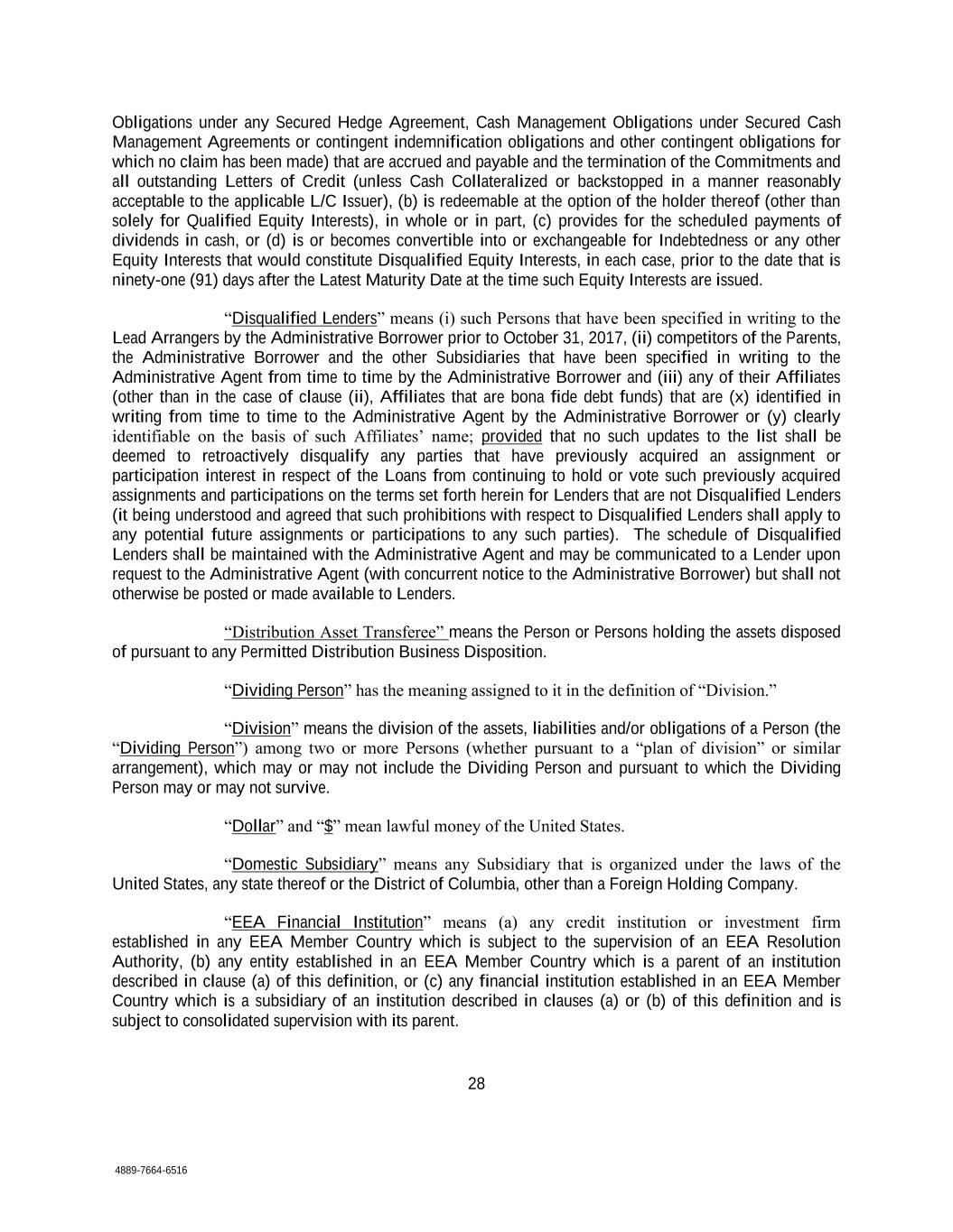28 4889-7664-6516 Obligations under any Secured Hedge Agreement, Cash Management Obligations under Secured Cash Management Agreements or contingent indemnification obligations and other contingent obligations for which no claim has been made) that are accrued and payable and the termination of the Commitments and all outstanding Letters of Credit (unless Cash Collateralized or backstopped in a manner reasonably acceptable to the applicable L/C Issuer), (b) is redeemable at the option of the holder thereof (other than solely for Qualified Equity Interests), in whole or in part, (c) provides for the scheduled payments of dividends in cash, or (d) is or becomes convertible into or exchangeable for Indebtedness or any other Equity Interests that would constitute Disqualified Equity Interests, in each case, prior to the date that is ninety-one (91) days after the Latest Maturity Date at the time such Equity Interests are issued. “Disqualified Lenders” means (i) such Persons that have been specified in writing to the Lead Arrangers by the Administrative Borrower prior to October 31, 2017, (ii) competitors of the Parents, the Administrative Borrower and the other Subsidiaries that have been specified in writing to the Administrative Agent from time to time by the Administrative Borrower and (iii) any of their Affiliates (other than in the case of clause (ii), Affiliates that are bona fide debt funds) that are (x) identified in writing from time to time to the Administrative Agent by the Administrative Borrower or (y) clearly identifiable on the basis of such Affiliates’ name; provided that no such updates to the list shall be deemed to retroactively disqualify any parties that have previously acquired an assignment or participation interest in respect of the Loans from continuing to hold or vote such previously acquired assignments and participations on the terms set forth herein for Lenders that are not Disqualified Lenders (it being understood and agreed that such prohibitions with respect to Disqualified Lenders shall apply to any potential future assignments or participations to any such parties). The schedule of Disqualified Lenders shall be maintained with the Administrative Agent and may be communicated to a Lender upon request to the Administrative Agent (with concurrent notice to the Administrative Borrower) but shall not otherwise be posted or made available to Lenders. “Distribution Asset Transferee” means the Person or Persons holding the assets disposed of pursuant to any Permitted Distribution Business Disposition. “Dividing Person” has the meaning assigned to it in the definition of “Division.” “Division” means the division of the assets, liabilities and/or obligations of a Person (the “Dividing Person”) among two or more Persons (whether pursuant to a “plan of division” or similar arrangement), which may or may not include the Dividing Person and pursuant to which the Dividing Person may or may not survive. “Dollar” and “$” mean lawful money of the United States. “Domestic Subsidiary” means any Subsidiary that is organized under the laws of the United States, any state thereof or the District of Columbia, other than a Foreign Holding Company. “EEA Financial Institution” means (a) any credit institution or investment firm established in any EEA Member Country which is subject to the supervision of an EEA Resolution Authority, (b) any entity established in an EEA Member Country which is a parent of an institution described in clause (a) of this definition, or (c) any financial institution established in an EEA Member Country which is a subsidiary of an institution described in clauses (a) or (b) of this definition and is subject to consolidated supervision with its parent.