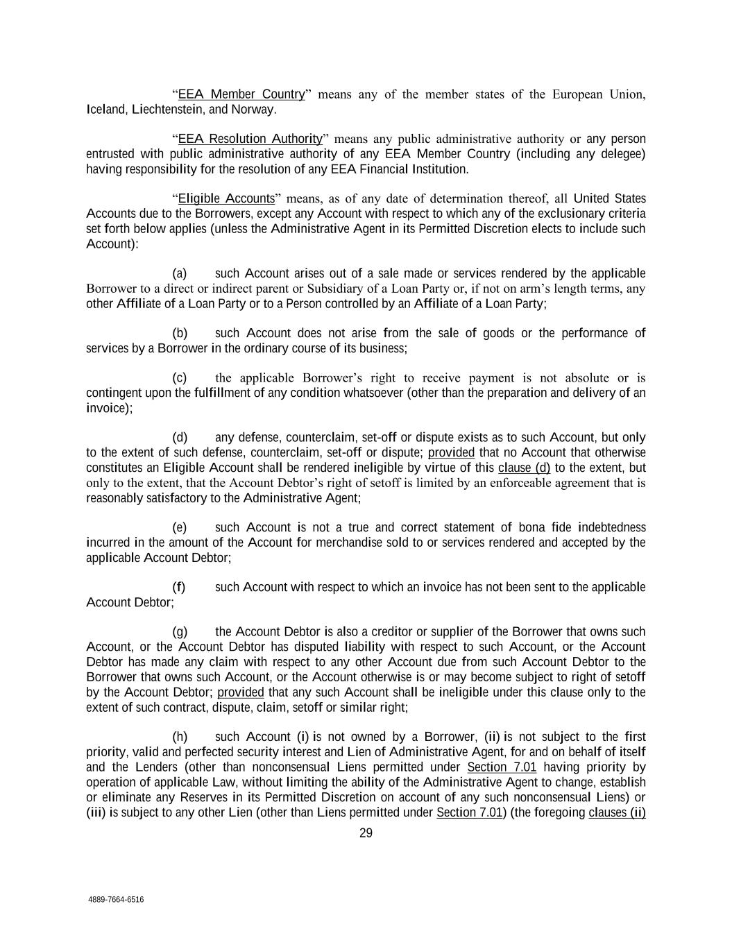 29 4889-7664-6516 “EEA Member Country” means any of the member states of the European Union, Iceland, Liechtenstein, and Norway. “EEA Resolution Authority” means any public administrative authority or any person entrusted with public administrative authority of any EEA Member Country (including any delegee) having responsibility for the resolution of any EEA Financial Institution. “Eligible Accounts” means, as of any date of determination thereof, all United States Accounts due to the Borrowers, except any Account with respect to which any of the exclusionary criteria set forth below applies (unless the Administrative Agent in its Permitted Discretion elects to include such Account): (a) such Account arises out of a sale made or services rendered by the applicable Borrower to a direct or indirect parent or Subsidiary of a Loan Party or, if not on arm’s length terms, any other Affiliate of a Loan Party or to a Person controlled by an Affiliate of a Loan Party; (b) such Account does not arise from the sale of goods or the performance of services by a Borrower in the ordinary course of its business; (c) the applicable Borrower’s right to receive payment is not absolute or is contingent upon the fulfillment of any condition whatsoever (other than the preparation and delivery of an invoice); (d) any defense, counterclaim, set-off or dispute exists as to such Account, but only to the extent of such defense, counterclaim, set-off or dispute; provided that no Account that otherwise constitutes an Eligible Account shall be rendered ineligible by virtue of this clause (d) to the extent, but only to the extent, that the Account Debtor’s right of setoff is limited by an enforceable agreement that is reasonably satisfactory to the Administrative Agent; (e) such Account is not a true and correct statement of bona fide indebtedness incurred in the amount of the Account for merchandise sold to or services rendered and accepted by the applicable Account Debtor; (f) such Account with respect to which an invoice has not been sent to the applicable Account Debtor; (g) the Account Debtor is also a creditor or supplier of the Borrower that owns such Account, or the Account Debtor has disputed liability with respect to such Account, or the Account Debtor has made any claim with respect to any other Account due from such Account Debtor to the Borrower that owns such Account, or the Account otherwise is or may become subject to right of setoff by the Account Debtor; provided that any such Account shall be ineligible under this clause only to the extent of such contract, dispute, claim, setoff or similar right; (h) such Account (i) is not owned by a Borrower, (ii) is not subject to the first priority, valid and perfected security interest and Lien of Administrative Agent, for and on behalf of itself and the Lenders (other than nonconsensual Liens permitted under Section 7.01 having priority by operation of applicable Law, without limiting the ability of the Administrative Agent to change, establish or eliminate any Reserves in its Permitted Discretion on account of any such nonconsensual Liens) or (iii) is subject to any other Lien (other than Liens permitted under Section 7.01) (the foregoing clauses (ii)