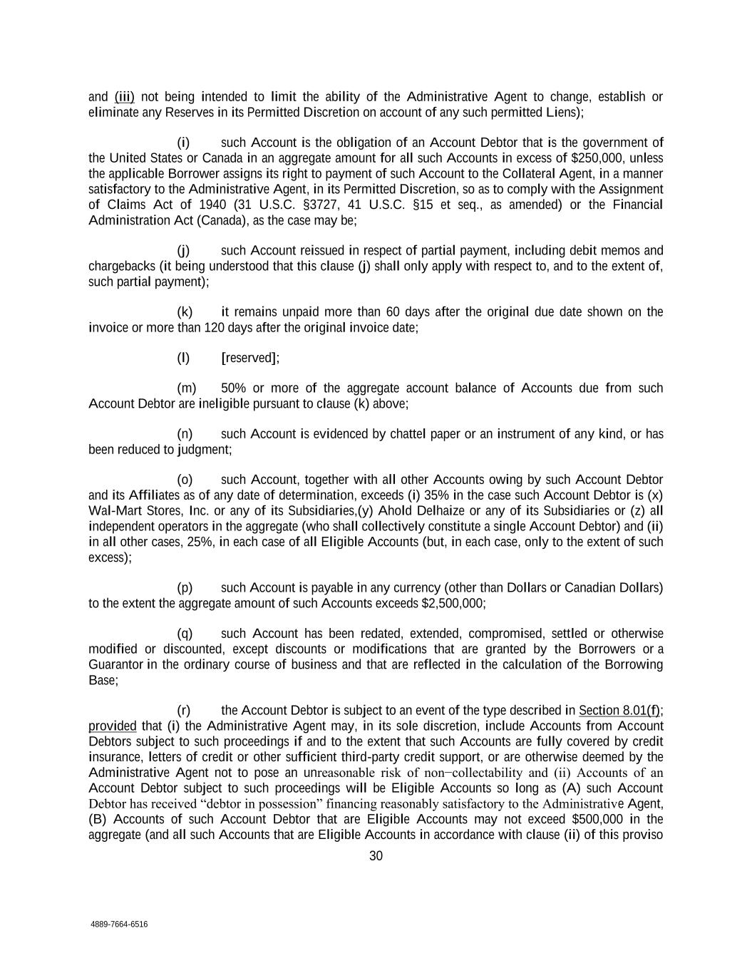 30 4889-7664-6516 and (iii) not being intended to limit the ability of the Administrative Agent to change, establish or eliminate any Reserves in its Permitted Discretion on account of any such permitted Liens); (i) such Account is the obligation of an Account Debtor that is the government of the United States or Canada in an aggregate amount for all such Accounts in excess of $250,000, unless the applicable Borrower assigns its right to payment of such Account to the Collateral Agent, in a manner satisfactory to the Administrative Agent, in its Permitted Discretion, so as to comply with the Assignment of Claims Act of 1940 (31 U.S.C. §3727, 41 U.S.C. §15 et seq., as amended) or the Financial Administration Act (Canada), as the case may be; (j) such Account reissued in respect of partial payment, including debit memos and chargebacks (it being understood that this clause (j) shall only apply with respect to, and to the extent of, such partial payment); (k) it remains unpaid more than 60 days after the original due date shown on the invoice or more than 120 days after the original invoice date; (l) [reserved]; (m) 50% or more of the aggregate account balance of Accounts due from such Account Debtor are ineligible pursuant to clause (k) above; (n) such Account is evidenced by chattel paper or an instrument of any kind, or has been reduced to judgment; (o) such Account, together with all other Accounts owing by such Account Debtor and its Affiliates as of any date of determination, exceeds (i) 35% in the case such Account Debtor is (x) Wal-Mart Stores, Inc. or any of its Subsidiaries,(y) Ahold Delhaize or any of its Subsidiaries or (z) all independent operators in the aggregate (who shall collectively constitute a single Account Debtor) and (ii) in all other cases, 25%, in each case of all Eligible Accounts (but, in each case, only to the extent of such excess); (p) such Account is payable in any currency (other than Dollars or Canadian Dollars) to the extent the aggregate amount of such Accounts exceeds $2,500,000; (q) such Account has been redated, extended, compromised, settled or otherwise modified or discounted, except discounts or modifications that are granted by the Borrowers or a Guarantor in the ordinary course of business and that are reflected in the calculation of the Borrowing Base; (r) the Account Debtor is subject to an event of the type described in Section 8.01(f); provided that (i) the Administrative Agent may, in its sole discretion, include Accounts from Account Debtors subject to such proceedings if and to the extent that such Accounts are fully covered by credit insurance, letters of credit or other sufficient third-party credit support, or are otherwise deemed by the Administrative Agent not to pose an unreasonable risk of non−collectability and (ii) Accounts of an Account Debtor subject to such proceedings will be Eligible Accounts so long as (A) such Account Debtor has received “debtor in possession” financing reasonably satisfactory to the Administrative Agent, (B) Accounts of such Account Debtor that are Eligible Accounts may not exceed $500,000 in the aggregate (and all such Accounts that are Eligible Accounts in accordance with clause (ii) of this proviso