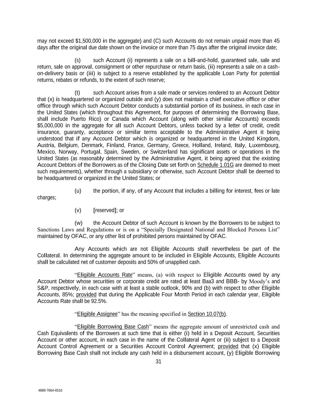 31 4889-7664-6516 may not exceed $1,500,000 in the aggregate) and (C) such Accounts do not remain unpaid more than 45 days after the original due date shown on the invoice or more than 75 days after the original invoice date; (s) such Account (i) represents a sale on a bill-and-hold, guaranteed sale, sale and return, sale on approval, consignment or other repurchase or return basis, (ii) represents a sale on a cash- on-delivery basis or (iii) is subject to a reserve established by the applicable Loan Party for potential returns, rebates or refunds, to the extent of such reserve; (t) such Account arises from a sale made or services rendered to an Account Debtor that (x) is headquartered or organized outside and (y) does not maintain a chief executive office or other office through which such Account Debtor conducts a substantial portion of its business, in each case in the United States (which throughout this Agreement, for purposes of determining the Borrowing Base, shall include Puerto Rico) or Canada which Account (along with other similar Accounts) exceeds $5,000,000 in the aggregate for all such Account Debtors, unless backed by a letter of credit, credit insurance, guaranty, acceptance or similar terms acceptable to the Administrative Agent it being understood that if any Account Debtor which is organized or headquartered in the United Kingdom, Austria, Belgium, Denmark, Finland, France, Germany, Greece, Holland, Ireland, Italy, Luxembourg, Mexico, Norway, Portugal, Spain, Sweden, or Switzerland has significant assets or operations in the United States (as reasonably determined by the Administrative Agent, it being agreed that the existing Account Debtors of the Borrowers as of the Closing Date set forth on Schedule 1.01G are deemed to meet such requirements), whether through a subsidiary or otherwise, such Account Debtor shall be deemed to be headquartered or organized in the United States; or (u) the portion, if any, of any Account that includes a billing for interest, fees or late charges; (v) [reserved]; or (w) the Account Debtor of such Account is known by the Borrowers to be subject to Sanctions Laws and Regulations or is on a “Specially Designated National and Blocked Persons List” maintained by OFAC, or any other list of prohibited persons maintained by OFAC. Any Accounts which are not Eligible Accounts shall nevertheless be part of the Collateral. In determining the aggregate amount to be included in Eligible Accounts, Eligible Accounts shall be calculated net of customer deposits and 50% of unapplied cash. “Eligible Accounts Rate” means, (a) with respect to Eligible Accounts owed by any Account Debtor whose securities or corporate credit are rated at least Baa3 and BBB- by Moody’s and S&P, respectively, in each case with at least a stable outlook, 90% and (b) with respect to other Eligible Accounts, 85%; provided that during the Applicable Four Month Period in each calendar year, Eligible Accounts Rate shall be 92.5%. “Eligible Assignee” has the meaning specified in Section 10.07(b). “Eligible Borrowing Base Cash” means the aggregate amount of unrestricted cash and Cash Equivalents of the Borrowers at such time that is either (i) held in a Deposit Account, Securities Account or other account, in each case in the name of the Collateral Agent or (ii) subject to a Deposit Account Control Agreement or a Securities Account Control Agreement; provided that (x) Eligible Borrowing Base Cash shall not include any cash held in a disbursement account, (y) Eligible Borrowing