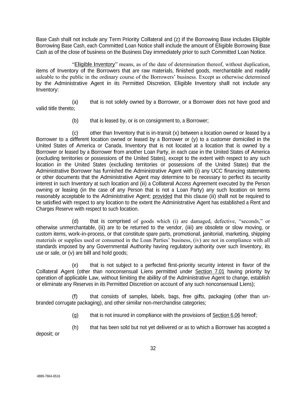 32 4889-7664-6516 Base Cash shall not include any Term Priority Collateral and (z) if the Borrowing Base includes Eligible Borrowing Base Cash, each Committed Loan Notice shall include the amount of Eligible Borrowing Base Cash as of the close of business on the Business Day immediately prior to such Committed Loan Notice. “Eligible Inventory” means, as of the date of determination thereof, without duplication, items of Inventory of the Borrowers that are raw materials, finished goods, merchantable and readily saleable to the public in the ordinary course of the Borrowers’ business. Except as otherwise determined by the Administrative Agent in its Permitted Discretion, Eligible Inventory shall not include any Inventory: (a) that is not solely owned by a Borrower, or a Borrower does not have good and valid title thereto; (b) that is leased by, or is on consignment to, a Borrower; (c) other than Inventory that is in-transit (x) between a location owned or leased by a Borrower to a different location owned or leased by a Borrower or (y) to a customer domiciled in the United States of America or Canada, Inventory that is not located at a location that is owned by a Borrower or leased by a Borrower from another Loan Party, in each case in the United States of America (excluding territories or possessions of the United States), except to the extent with respect to any such location in the United States (excluding territories or possessions of the United States) that the Administrative Borrower has furnished the Administrative Agent with (i) any UCC financing statements or other documents that the Administrative Agent may determine to be necessary to perfect its security interest in such Inventory at such location and (ii) a Collateral Access Agreement executed by the Person owning or leasing (in the case of any Person that is not a Loan Party) any such location on terms reasonably acceptable to the Administrative Agent; provided that this clause (ii) shall not be required to be satisfied with respect to any location to the extent the Administrative Agent has established a Rent and Charges Reserve with respect to such location. (d) that is comprised of goods which (i) are damaged, defective, “seconds,” or otherwise unmerchantable, (ii) are to be returned to the vendor, (iii) are obsolete or slow moving, or custom items, work-in-process, or that constitute spare parts, promotional, janitorial, marketing, shipping materials or supplies used or consumed in the Loan Parties’ business, (iv) are not in compliance with all standards imposed by any Governmental Authority having regulatory authority over such Inventory, its use or sale, or (v) are bill and hold goods; (e) that is not subject to a perfected first-priority security interest in favor of the Collateral Agent (other than nonconsensual Liens permitted under Section 7.01 having priority by operation of applicable Law, without limiting the ability of the Administrative Agent to change, establish or eliminate any Reserves in its Permitted Discretion on account of any such nonconsensual Liens); (f) that consists of samples, labels, bags, free gifts, packaging (other than un- branded corrugate packaging), and other similar non-merchandise categories; (g) that is not insured in compliance with the provisions of Section 6.06 hereof; (h) that has been sold but not yet delivered or as to which a Borrower has accepted a deposit; or