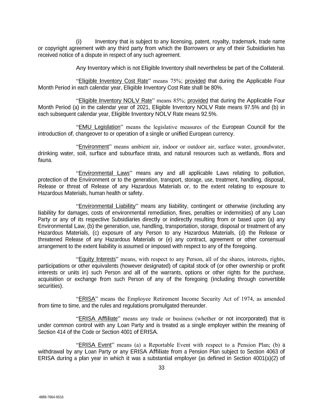 33 4889-7664-6516 (i) Inventory that is subject to any licensing, patent, royalty, trademark, trade name or copyright agreement with any third party from which the Borrowers or any of their Subsidiaries has received notice of a dispute in respect of any such agreement. Any Inventory which is not Eligible Inventory shall nevertheless be part of the Collateral. “Eligible Inventory Cost Rate” means 75%; provided that during the Applicable Four Month Period in each calendar year, Eligible Inventory Cost Rate shall be 80%. “Eligible Inventory NOLV Rate” means 85%; provided that during the Applicable Four Month Period (a) in the calendar year of 2021, Eligible Inventory NOLV Rate means 97.5% and (b) in each subsequent calendar year, Eligible Inventory NOLV Rate means 92.5%. “EMU Legislation” means the legislative measures of the European Council for the introduction of, changeover to or operation of a single or unified European currency. “Environment” means ambient air, indoor or outdoor air, surface water, groundwater, drinking water, soil, surface and subsurface strata, and natural resources such as wetlands, flora and fauna. “Environmental Laws” means any and all applicable Laws relating to pollution, protection of the Environment or to the generation, transport, storage, use, treatment, handling, disposal, Release or threat of Release of any Hazardous Materials or, to the extent relating to exposure to Hazardous Materials, human health or safety. “Environmental Liability” means any liability, contingent or otherwise (including any liability for damages, costs of environmental remediation, fines, penalties or indemnities) of any Loan Party or any of its respective Subsidiaries directly or indirectly resulting from or based upon (a) any Environmental Law, (b) the generation, use, handling, transportation, storage, disposal or treatment of any Hazardous Materials, (c) exposure of any Person to any Hazardous Materials, (d) the Release or threatened Release of any Hazardous Materials or (e) any contract, agreement or other consensual arrangement to the extent liability is assumed or imposed with respect to any of the foregoing. “Equity Interests” means, with respect to any Person, all of the shares, interests, rights, participations or other equivalents (however designated) of capital stock of (or other ownership or profit interests or units in) such Person and all of the warrants, options or other rights for the purchase, acquisition or exchange from such Person of any of the foregoing (including through convertible securities). “ERISA” means the Employee Retirement Income Security Act of 1974, as amended from time to time, and the rules and regulations promulgated thereunder. “ERISA Affiliate” means any trade or business (whether or not incorporated) that is under common control with any Loan Party and is treated as a single employer within the meaning of Section 414 of the Code or Section 4001 of ERISA. “ERISA Event” means (a) a Reportable Event with respect to a Pension Plan; (b) a withdrawal by any Loan Party or any ERISA Affiliate from a Pension Plan subject to Section 4063 of ERISA during a plan year in which it was a substantial employer (as defined in Section 4001(a)(2) of