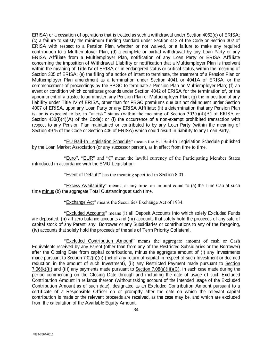 34 4889-7664-6516 ERISA) or a cessation of operations that is treated as such a withdrawal under Section 4062(e) of ERISA; (c) a failure to satisfy the minimum funding standard under Section 412 of the Code or Section 302 of ERISA with respect to a Pension Plan, whether or not waived, or a failure to make any required contribution to a Multiemployer Plan; (d) a complete or partial withdrawal by any Loan Party or any ERISA Affiliate from a Multiemployer Plan, notification of any Loan Party or ERISA Affiliate concerning the imposition of Withdrawal Liability or notification that a Multiemployer Plan is insolvent within the meaning of Title IV of ERISA or in endangered status or critical status, within the meaning of Section 305 of ERISA; (e) the filing of a notice of intent to terminate, the treatment of a Pension Plan or Multiemployer Plan amendment as a termination under Section 4041 or 4041A of ERISA, or the commencement of proceedings by the PBGC to terminate a Pension Plan or Multiemployer Plan; (f) an event or condition which constitutes grounds under Section 4042 of ERISA for the termination of, or the appointment of a trustee to administer, any Pension Plan or Multiemployer Plan; (g) the imposition of any liability under Title IV of ERISA, other than for PBGC premiums due but not delinquent under Section 4007 of ERISA, upon any Loan Party or any ERISA Affiliate; (h) a determination that any Pension Plan is, or is expected to be, in “at-risk” status (within the meaning of Section 303(i)(4)(A) of ERISA or Section 430(i)(4)(A) of the Code); or (i) the occurrence of a non-exempt prohibited transaction with respect to any Pension Plan maintained or contributed to by any Loan Party (within the meaning of Section 4975 of the Code or Section 406 of ERISA) which could result in liability to any Loan Party. “EU Bail-In Legislation Schedule” means the EU Bail-In Legislation Schedule published by the Loan Market Association (or any successor person), as in effect from time to time. “Euro”, “EUR” and “€” mean the lawful currency of the Participating Member States introduced in accordance with the EMU Legislation. “Event of Default” has the meaning specified in Section 8.01. “Excess Availability” means, at any time, an amount equal to (a) the Line Cap at such time minus (b) the aggregate Total Outstandings at such time. “Exchange Act” means the Securities Exchange Act of 1934. “Excluded Accounts” means (i) all Deposit Accounts into which solely Excluded Funds are deposited, (ii) all zero balance accounts and (iii) accounts that solely hold the proceeds of any sale of capital stock of any Parent, any Borrower or any Subsidiaries or contributions to any of the foregoing, (iv) accounts that solely hold the proceeds of the sale of Term Priority Collateral. “Excluded Contribution Amount” means the aggregate amount of cash or Cash Equivalents received by any Parent (other than from any of the Restricted Subsidiaries or the Borrower) after the Closing Date from capital contributions, minus the aggregate amount of (i) any Investments made pursuant to Section 7.02(n)(ii) (net of any return of capital in respect of such Investment or deemed reduction in the amount of such Investment), (ii) any Restricted Payment made pursuant to Section 7.06(k)(ii) and (iii) any payments made pursuant to Section 7.08(a)(iii)(C), in each case made during the period commencing on the Closing Date through and including the date of usage of such Excluded Contribution Amount in reliance thereon (without taking account of the intended usage of the Excluded Contribution Amount as of such date), designated as an Excluded Contribution Amount pursuant to a certificate of a Responsible Officer on or promptly after the date on which the relevant capital contribution is made or the relevant proceeds are received, as the case may be, and which are excluded from the calculation of the Available Equity Amount.