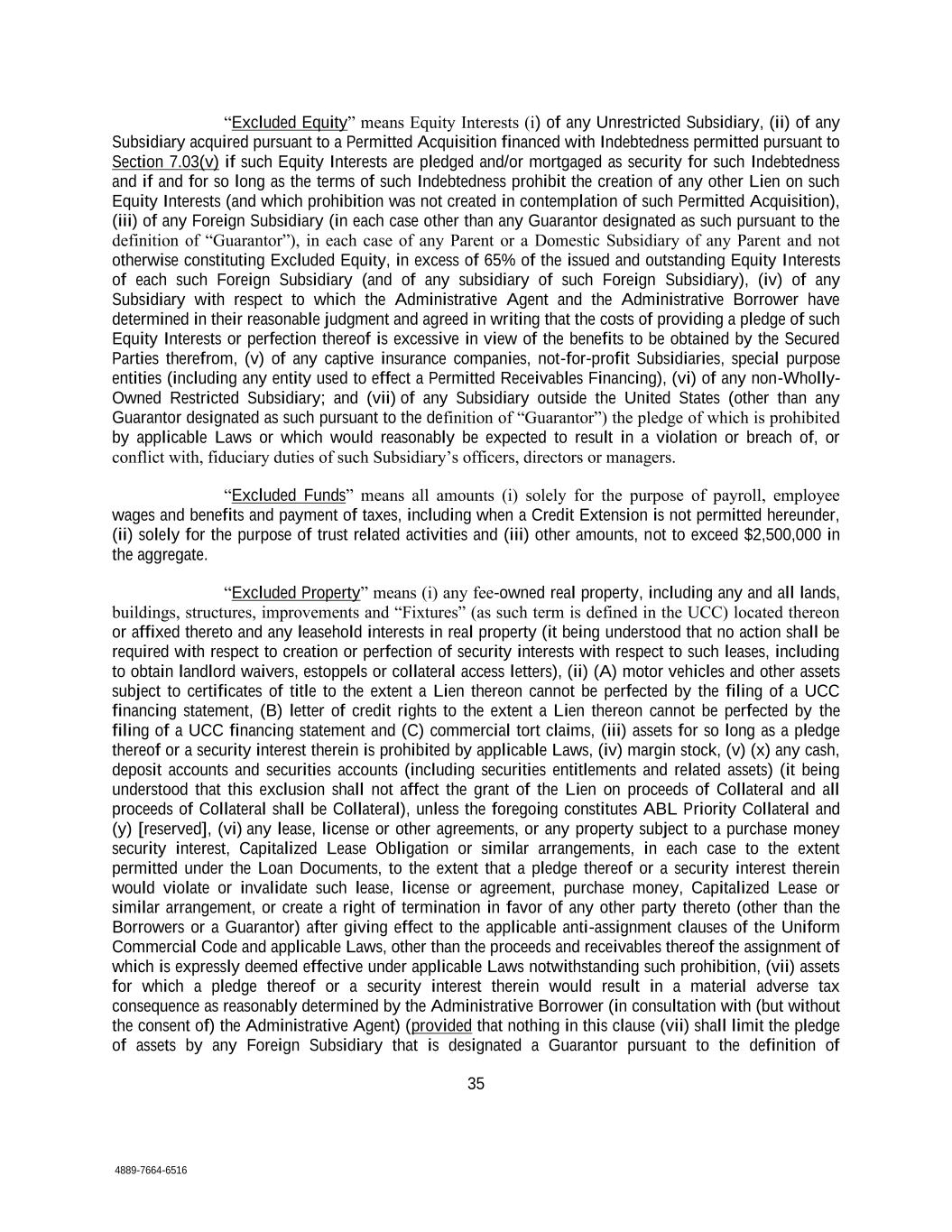35 4889-7664-6516 “Excluded Equity” means Equity Interests (i) of any Unrestricted Subsidiary, (ii) of any Subsidiary acquired pursuant to a Permitted Acquisition financed with Indebtedness permitted pursuant to Section 7.03(v) if such Equity Interests are pledged and/or mortgaged as security for such Indebtedness and if and for so long as the terms of such Indebtedness prohibit the creation of any other Lien on such Equity Interests (and which prohibition was not created in contemplation of such Permitted Acquisition), (iii) of any Foreign Subsidiary (in each case other than any Guarantor designated as such pursuant to the definition of “Guarantor”), in each case of any Parent or a Domestic Subsidiary of any Parent and not otherwise constituting Excluded Equity, in excess of 65% of the issued and outstanding Equity Interests of each such Foreign Subsidiary (and of any subsidiary of such Foreign Subsidiary), (iv) of any Subsidiary with respect to which the Administrative Agent and the Administrative Borrower have determined in their reasonable judgment and agreed in writing that the costs of providing a pledge of such Equity Interests or perfection thereof is excessive in view of the benefits to be obtained by the Secured Parties therefrom, (v) of any captive insurance companies, not-for-profit Subsidiaries, special purpose entities (including any entity used to effect a Permitted Receivables Financing), (vi) of any non-Wholly- Owned Restricted Subsidiary; and (vii) of any Subsidiary outside the United States (other than any Guarantor designated as such pursuant to the definition of “Guarantor”) the pledge of which is prohibited by applicable Laws or which would reasonably be expected to result in a violation or breach of, or conflict with, fiduciary duties of such Subsidiary’s officers, directors or managers. “Excluded Funds” means all amounts (i) solely for the purpose of payroll, employee wages and benefits and payment of taxes, including when a Credit Extension is not permitted hereunder, (ii) solely for the purpose of trust related activities and (iii) other amounts, not to exceed $2,500,000 in the aggregate. “Excluded Property” means (i) any fee-owned real property, including any and all lands, buildings, structures, improvements and “Fixtures” (as such term is defined in the UCC) located thereon or affixed thereto and any leasehold interests in real property (it being understood that no action shall be required with respect to creation or perfection of security interests with respect to such leases, including to obtain landlord waivers, estoppels or collateral access letters), (ii) (A) motor vehicles and other assets subject to certificates of title to the extent a Lien thereon cannot be perfected by the filing of a UCC financing statement, (B) letter of credit rights to the extent a Lien thereon cannot be perfected by the filing of a UCC financing statement and (C) commercial tort claims, (iii) assets for so long as a pledge thereof or a security interest therein is prohibited by applicable Laws, (iv) margin stock, (v) (x) any cash, deposit accounts and securities accounts (including securities entitlements and related assets) (it being understood that this exclusion shall not affect the grant of the Lien on proceeds of Collateral and all proceeds of Collateral shall be Collateral), unless the foregoing constitutes ABL Priority Collateral and (y) [reserved], (vi) any lease, license or other agreements, or any property subject to a purchase money security interest, Capitalized Lease Obligation or similar arrangements, in each case to the extent permitted under the Loan Documents, to the extent that a pledge thereof or a security interest therein would violate or invalidate such lease, license or agreement, purchase money, Capitalized Lease or similar arrangement, or create a right of termination in favor of any other party thereto (other than the Borrowers or a Guarantor) after giving effect to the applicable anti-assignment clauses of the Uniform Commercial Code and applicable Laws, other than the proceeds and receivables thereof the assignment of which is expressly deemed effective under applicable Laws notwithstanding such prohibition, (vii) assets for which a pledge thereof or a security interest therein would result in a material adverse tax consequence as reasonably determined by the Administrative Borrower (in consultation with (but without the consent of) the Administrative Agent) (provided that nothing in this clause (vii) shall limit the pledge of assets by any Foreign Subsidiary that is designated a Guarantor pursuant to the definition of