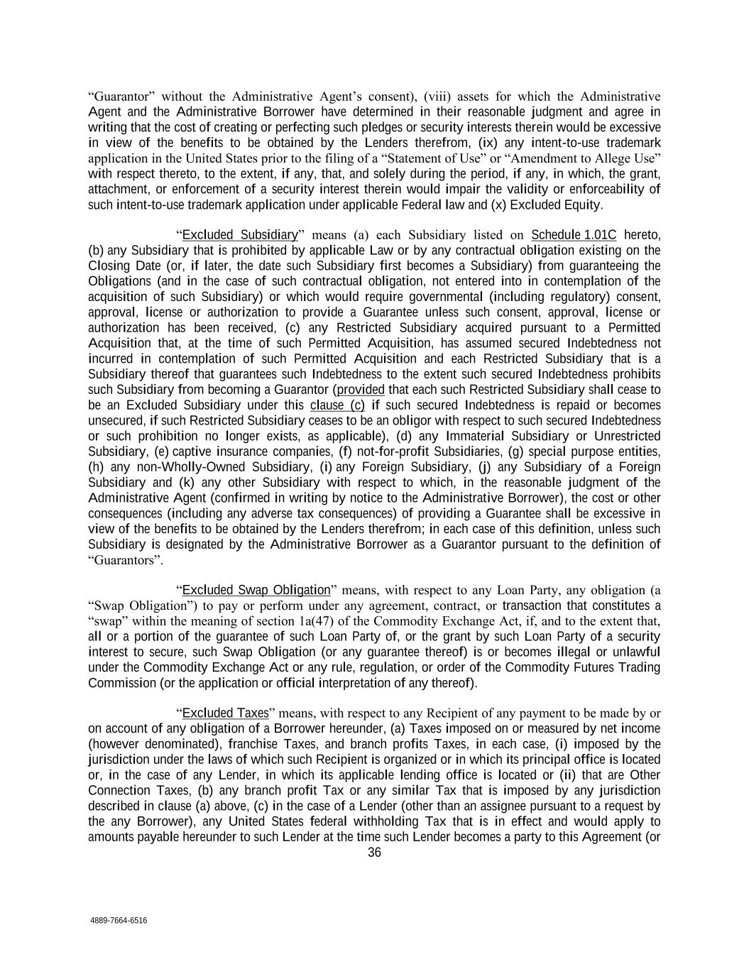 36 4889-7664-6516 “Guarantor” without the Administrative Agent’s consent), (viii) assets for which the Administrative Agent and the Administrative Borrower have determined in their reasonable judgment and agree in writing that the cost of creating or perfecting such pledges or security interests therein would be excessive in view of the benefits to be obtained by the Lenders therefrom, (ix) any intent-to-use trademark application in the United States prior to the filing of a “Statement of Use” or “Amendment to Allege Use” with respect thereto, to the extent, if any, that, and solely during the period, if any, in which, the grant, attachment, or enforcement of a security interest therein would impair the validity or enforceability of such intent-to-use trademark application under applicable Federal law and (x) Excluded Equity. “Excluded Subsidiary” means (a) each Subsidiary listed on Schedule 1.01C hereto, (b) any Subsidiary that is prohibited by applicable Law or by any contractual obligation existing on the Closing Date (or, if later, the date such Subsidiary first becomes a Subsidiary) from guaranteeing the Obligations (and in the case of such contractual obligation, not entered into in contemplation of the acquisition of such Subsidiary) or which would require governmental (including regulatory) consent, approval, license or authorization to provide a Guarantee unless such consent, approval, license or authorization has been received, (c) any Restricted Subsidiary acquired pursuant to a Permitted Acquisition that, at the time of such Permitted Acquisition, has assumed secured Indebtedness not incurred in contemplation of such Permitted Acquisition and each Restricted Subsidiary that is a Subsidiary thereof that guarantees such Indebtedness to the extent such secured Indebtedness prohibits such Subsidiary from becoming a Guarantor (provided that each such Restricted Subsidiary shall cease to be an Excluded Subsidiary under this clause (c) if such secured Indebtedness is repaid or becomes unsecured, if such Restricted Subsidiary ceases to be an obligor with respect to such secured Indebtedness or such prohibition no longer exists, as applicable), (d) any Immaterial Subsidiary or Unrestricted Subsidiary, (e) captive insurance companies, (f) not-for-profit Subsidiaries, (g) special purpose entities, (h) any non-Wholly-Owned Subsidiary, (i) any Foreign Subsidiary, (j) any Subsidiary of a Foreign Subsidiary and (k) any other Subsidiary with respect to which, in the reasonable judgment of the Administrative Agent (confirmed in writing by notice to the Administrative Borrower), the cost or other consequences (including any adverse tax consequences) of providing a Guarantee shall be excessive in view of the benefits to be obtained by the Lenders therefrom; in each case of this definition, unless such Subsidiary is designated by the Administrative Borrower as a Guarantor pursuant to the definition of “Guarantors”. “Excluded Swap Obligation” means, with respect to any Loan Party, any obligation (a “Swap Obligation”) to pay or perform under any agreement, contract, or transaction that constitutes a “swap” within the meaning of section 1a(47) of the Commodity Exchange Act, if, and to the extent that, all or a portion of the guarantee of such Loan Party of, or the grant by such Loan Party of a security interest to secure, such Swap Obligation (or any guarantee thereof) is or becomes illegal or unlawful under the Commodity Exchange Act or any rule, regulation, or order of the Commodity Futures Trading Commission (or the application or official interpretation of any thereof). “Excluded Taxes” means, with respect to any Recipient of any payment to be made by or on account of any obligation of a Borrower hereunder, (a) Taxes imposed on or measured by net income (however denominated), franchise Taxes, and branch profits Taxes, in each case, (i) imposed by the jurisdiction under the laws of which such Recipient is organized or in which its principal office is located or, in the case of any Lender, in which its applicable lending office is located or (ii) that are Other Connection Taxes, (b) any branch profit Tax or any similar Tax that is imposed by any jurisdiction described in clause (a) above, (c) in the case of a Lender (other than an assignee pursuant to a request by the any Borrower), any United States federal withholding Tax that is in effect and would apply to amounts payable hereunder to such Lender at the time such Lender becomes a party to this Agreement (or