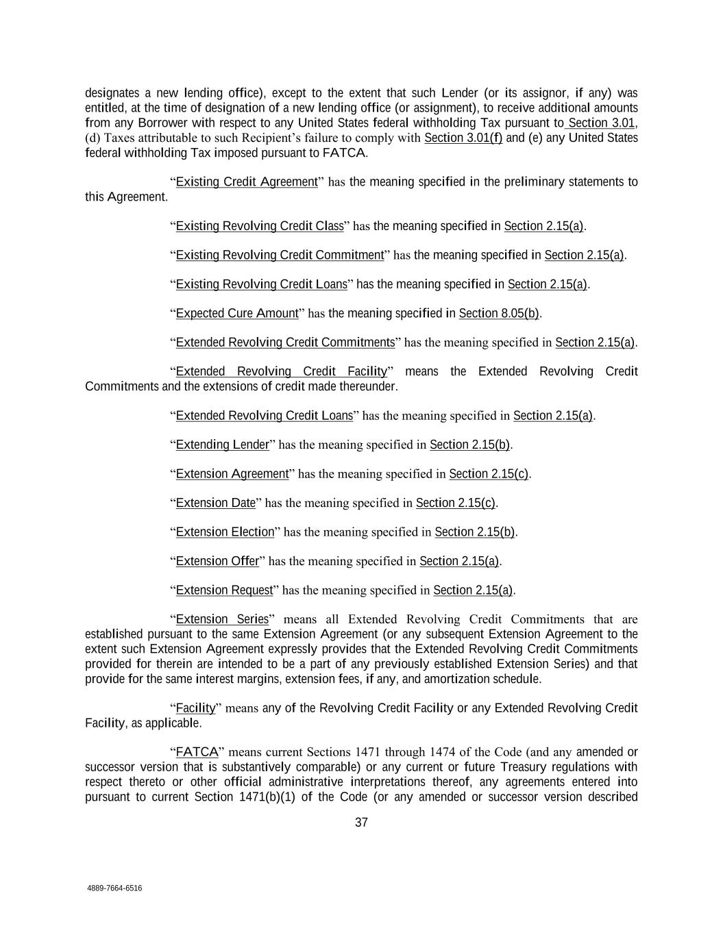 37 4889-7664-6516 designates a new lending office), except to the extent that such Lender (or its assignor, if any) was entitled, at the time of designation of a new lending office (or assignment), to receive additional amounts from any Borrower with respect to any United States federal withholding Tax pursuant to Section 3.01, (d) Taxes attributable to such Recipient’s failure to comply with Section 3.01(f) and (e) any United States federal withholding Tax imposed pursuant to FATCA. “Existing Credit Agreement” has the meaning specified in the preliminary statements to this Agreement. “Existing Revolving Credit Class” has the meaning specified in Section 2.15(a). “Existing Revolving Credit Commitment” has the meaning specified in Section 2.15(a). “Existing Revolving Credit Loans” has the meaning specified in Section 2.15(a). “Expected Cure Amount” has the meaning specified in Section 8.05(b). “Extended Revolving Credit Commitments” has the meaning specified in Section 2.15(a). “Extended Revolving Credit Facility” means the Extended Revolving Credit Commitments and the extensions of credit made thereunder. “Extended Revolving Credit Loans” has the meaning specified in Section 2.15(a). “Extending Lender” has the meaning specified in Section 2.15(b). “Extension Agreement” has the meaning specified in Section 2.15(c). “Extension Date” has the meaning specified in Section 2.15(c). “Extension Election” has the meaning specified in Section 2.15(b). “Extension Offer” has the meaning specified in Section 2.15(a). “Extension Request” has the meaning specified in Section 2.15(a). “Extension Series” means all Extended Revolving Credit Commitments that are established pursuant to the same Extension Agreement (or any subsequent Extension Agreement to the extent such Extension Agreement expressly provides that the Extended Revolving Credit Commitments provided for therein are intended to be a part of any previously established Extension Series) and that provide for the same interest margins, extension fees, if any, and amortization schedule. “Facility” means any of the Revolving Credit Facility or any Extended Revolving Credit Facility, as applicable. “FATCA” means current Sections 1471 through 1474 of the Code (and any amended or successor version that is substantively comparable) or any current or future Treasury regulations with respect thereto or other official administrative interpretations thereof, any agreements entered into pursuant to current Section 1471(b)(1) of the Code (or any amended or successor version described