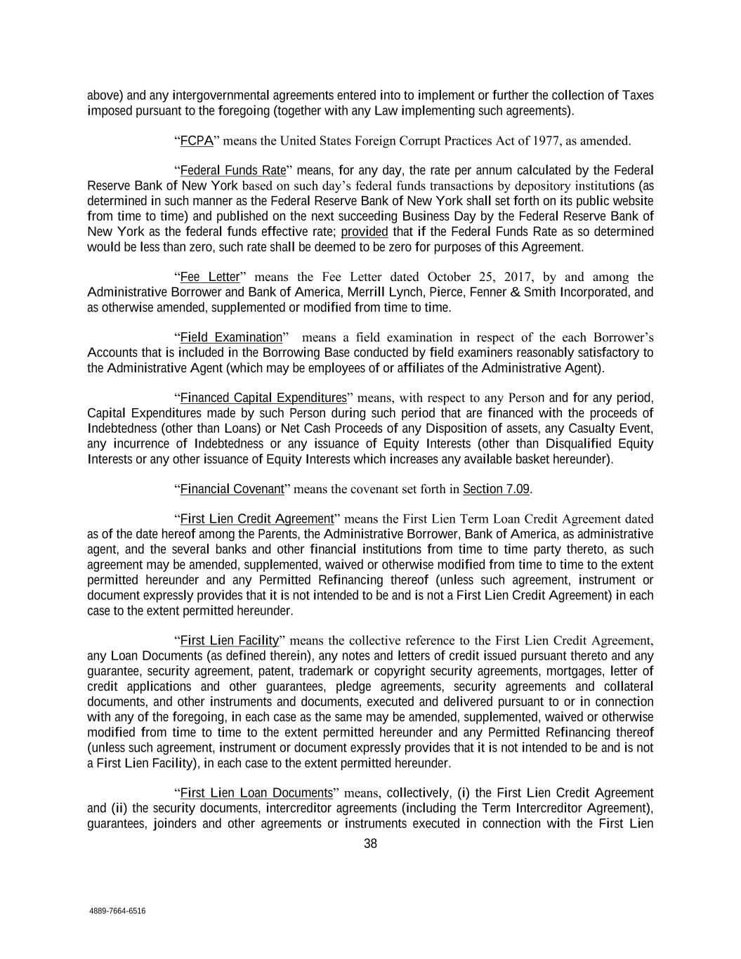 38 4889-7664-6516 above) and any intergovernmental agreements entered into to implement or further the collection of Taxes imposed pursuant to the foregoing (together with any Law implementing such agreements). “FCPA” means the United States Foreign Corrupt Practices Act of 1977, as amended. “Federal Funds Rate” means, for any day, the rate per annum calculated by the Federal Reserve Bank of New York based on such day’s federal funds transactions by depository institutions (as determined in such manner as the Federal Reserve Bank of New York shall set forth on its public website from time to time) and published on the next succeeding Business Day by the Federal Reserve Bank of New York as the federal funds effective rate; provided that if the Federal Funds Rate as so determined would be less than zero, such rate shall be deemed to be zero for purposes of this Agreement. “Fee Letter” means the Fee Letter dated October 25, 2017, by and among the Administrative Borrower and Bank of America, Merrill Lynch, Pierce, Fenner & Smith Incorporated, and as otherwise amended, supplemented or modified from time to time. “Field Examination” means a field examination in respect of the each Borrower’s Accounts that is included in the Borrowing Base conducted by field examiners reasonably satisfactory to the Administrative Agent (which may be employees of or affiliates of the Administrative Agent). “Financed Capital Expenditures” means, with respect to any Person and for any period, Capital Expenditures made by such Person during such period that are financed with the proceeds of Indebtedness (other than Loans) or Net Cash Proceeds of any Disposition of assets, any Casualty Event, any incurrence of Indebtedness or any issuance of Equity Interests (other than Disqualified Equity Interests or any other issuance of Equity Interests which increases any available basket hereunder). “Financial Covenant” means the covenant set forth in Section 7.09. “First Lien Credit Agreement” means the First Lien Term Loan Credit Agreement dated as of the date hereof among the Parents, the Administrative Borrower, Bank of America, as administrative agent, and the several banks and other financial institutions from time to time party thereto, as such agreement may be amended, supplemented, waived or otherwise modified from time to time to the extent permitted hereunder and any Permitted Refinancing thereof (unless such agreement, instrument or document expressly provides that it is not intended to be and is not a First Lien Credit Agreement) in each case to the extent permitted hereunder. “First Lien Facility” means the collective reference to the First Lien Credit Agreement, any Loan Documents (as defined therein), any notes and letters of credit issued pursuant thereto and any guarantee, security agreement, patent, trademark or copyright security agreements, mortgages, letter of credit applications and other guarantees, pledge agreements, security agreements and collateral documents, and other instruments and documents, executed and delivered pursuant to or in connection with any of the foregoing, in each case as the same may be amended, supplemented, waived or otherwise modified from time to time to the extent permitted hereunder and any Permitted Refinancing thereof (unless such agreement, instrument or document expressly provides that it is not intended to be and is not a First Lien Facility), in each case to the extent permitted hereunder. “First Lien Loan Documents” means, collectively, (i) the First Lien Credit Agreement and (ii) the security documents, intercreditor agreements (including the Term Intercreditor Agreement), guarantees, joinders and other agreements or instruments executed in connection with the First Lien