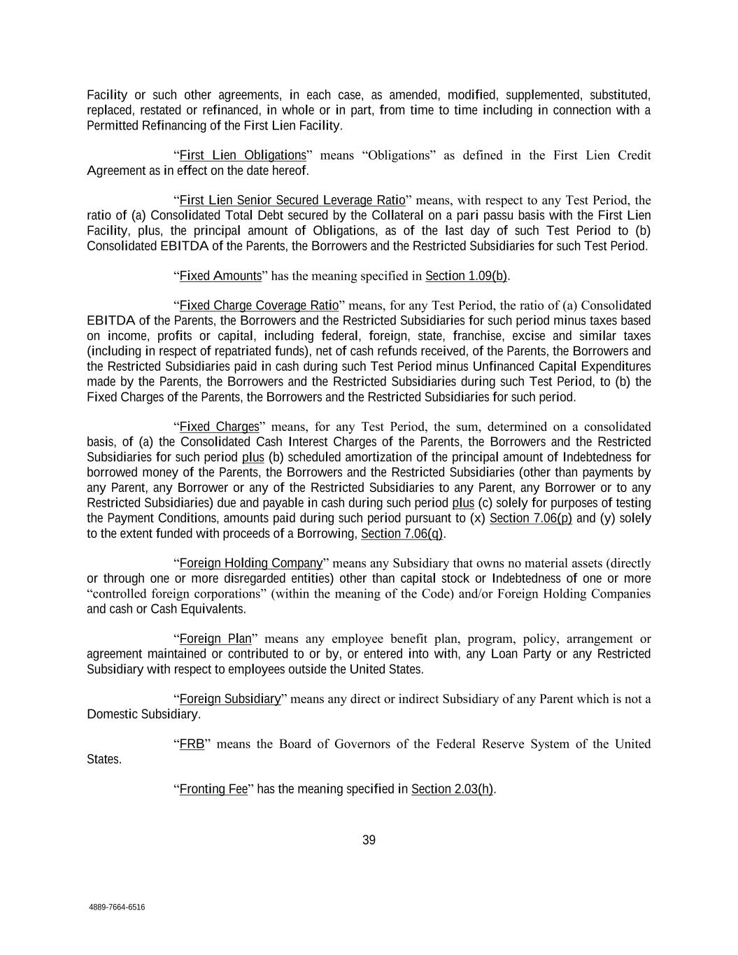 39 4889-7664-6516 Facility or such other agreements, in each case, as amended, modified, supplemented, substituted, replaced, restated or refinanced, in whole or in part, from time to time including in connection with a Permitted Refinancing of the First Lien Facility. “First Lien Obligations” means “Obligations” as defined in the First Lien Credit Agreement as in effect on the date hereof. “First Lien Senior Secured Leverage Ratio” means, with respect to any Test Period, the ratio of (a) Consolidated Total Debt secured by the Collateral on a pari passu basis with the First Lien Facility, plus, the principal amount of Obligations, as of the last day of such Test Period to (b) Consolidated EBITDA of the Parents, the Borrowers and the Restricted Subsidiaries for such Test Period. “Fixed Amounts” has the meaning specified in Section 1.09(b). “Fixed Charge Coverage Ratio” means, for any Test Period, the ratio of (a) Consolidated EBITDA of the Parents, the Borrowers and the Restricted Subsidiaries for such period minus taxes based on income, profits or capital, including federal, foreign, state, franchise, excise and similar taxes (including in respect of repatriated funds), net of cash refunds received, of the Parents, the Borrowers and the Restricted Subsidiaries paid in cash during such Test Period minus Unfinanced Capital Expenditures made by the Parents, the Borrowers and the Restricted Subsidiaries during such Test Period, to (b) the Fixed Charges of the Parents, the Borrowers and the Restricted Subsidiaries for such period. “Fixed Charges” means, for any Test Period, the sum, determined on a consolidated basis, of (a) the Consolidated Cash Interest Charges of the Parents, the Borrowers and the Restricted Subsidiaries for such period plus (b) scheduled amortization of the principal amount of Indebtedness for borrowed money of the Parents, the Borrowers and the Restricted Subsidiaries (other than payments by any Parent, any Borrower or any of the Restricted Subsidiaries to any Parent, any Borrower or to any Restricted Subsidiaries) due and payable in cash during such period plus (c) solely for purposes of testing the Payment Conditions, amounts paid during such period pursuant to (x) Section 7.06(p) and (y) solely to the extent funded with proceeds of a Borrowing, Section 7.06(q). “Foreign Holding Company” means any Subsidiary that owns no material assets (directly or through one or more disregarded entities) other than capital stock or Indebtedness of one or more “controlled foreign corporations” (within the meaning of the Code) and/or Foreign Holding Companies and cash or Cash Equivalents. “Foreign Plan” means any employee benefit plan, program, policy, arrangement or agreement maintained or contributed to or by, or entered into with, any Loan Party or any Restricted Subsidiary with respect to employees outside the United States. “Foreign Subsidiary” means any direct or indirect Subsidiary of any Parent which is not a Domestic Subsidiary. “FRB” means the Board of Governors of the Federal Reserve System of the United States. “Fronting Fee” has the meaning specified in Section 2.03(h).