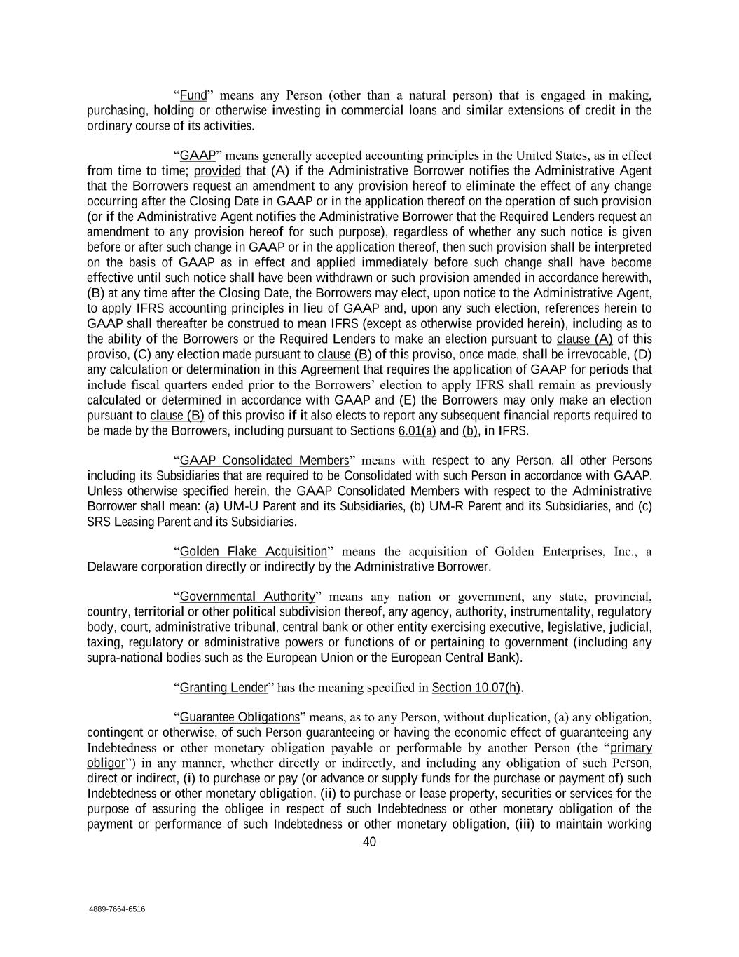 40 4889-7664-6516 “Fund” means any Person (other than a natural person) that is engaged in making, purchasing, holding or otherwise investing in commercial loans and similar extensions of credit in the ordinary course of its activities. “GAAP” means generally accepted accounting principles in the United States, as in effect from time to time; provided that (A) if the Administrative Borrower notifies the Administrative Agent that the Borrowers request an amendment to any provision hereof to eliminate the effect of any change occurring after the Closing Date in GAAP or in the application thereof on the operation of such provision (or if the Administrative Agent notifies the Administrative Borrower that the Required Lenders request an amendment to any provision hereof for such purpose), regardless of whether any such notice is given before or after such change in GAAP or in the application thereof, then such provision shall be interpreted on the basis of GAAP as in effect and applied immediately before such change shall have become effective until such notice shall have been withdrawn or such provision amended in accordance herewith, (B) at any time after the Closing Date, the Borrowers may elect, upon notice to the Administrative Agent, to apply IFRS accounting principles in lieu of GAAP and, upon any such election, references herein to GAAP shall thereafter be construed to mean IFRS (except as otherwise provided herein), including as to the ability of the Borrowers or the Required Lenders to make an election pursuant to clause (A) of this proviso, (C) any election made pursuant to clause (B) of this proviso, once made, shall be irrevocable, (D) any calculation or determination in this Agreement that requires the application of GAAP for periods that include fiscal quarters ended prior to the Borrowers’ election to apply IFRS shall remain as previously calculated or determined in accordance with GAAP and (E) the Borrowers may only make an election pursuant to clause (B) of this proviso if it also elects to report any subsequent financial reports required to be made by the Borrowers, including pursuant to Sections 6.01(a) and (b), in IFRS. “GAAP Consolidated Members” means with respect to any Person, all other Persons including its Subsidiaries that are required to be Consolidated with such Person in accordance with GAAP. Unless otherwise specified herein, the GAAP Consolidated Members with respect to the Administrative Borrower shall mean: (a) UM-U Parent and its Subsidiaries, (b) UM-R Parent and its Subsidiaries, and (c) SRS Leasing Parent and its Subsidiaries. “Golden Flake Acquisition” means the acquisition of Golden Enterprises, Inc., a Delaware corporation directly or indirectly by the Administrative Borrower. “Governmental Authority” means any nation or government, any state, provincial, country, territorial or other political subdivision thereof, any agency, authority, instrumentality, regulatory body, court, administrative tribunal, central bank or other entity exercising executive, legislative, judicial, taxing, regulatory or administrative powers or functions of or pertaining to government (including any supra-national bodies such as the European Union or the European Central Bank). “Granting Lender” has the meaning specified in Section 10.07(h). “Guarantee Obligations” means, as to any Person, without duplication, (a) any obligation, contingent or otherwise, of such Person guaranteeing or having the economic effect of guaranteeing any Indebtedness or other monetary obligation payable or performable by another Person (the “primary obligor”) in any manner, whether directly or indirectly, and including any obligation of such Person, direct or indirect, (i) to purchase or pay (or advance or supply funds for the purchase or payment of) such Indebtedness or other monetary obligation, (ii) to purchase or lease property, securities or services for the purpose of assuring the obligee in respect of such Indebtedness or other monetary obligation of the payment or performance of such Indebtedness or other monetary obligation, (iii) to maintain working