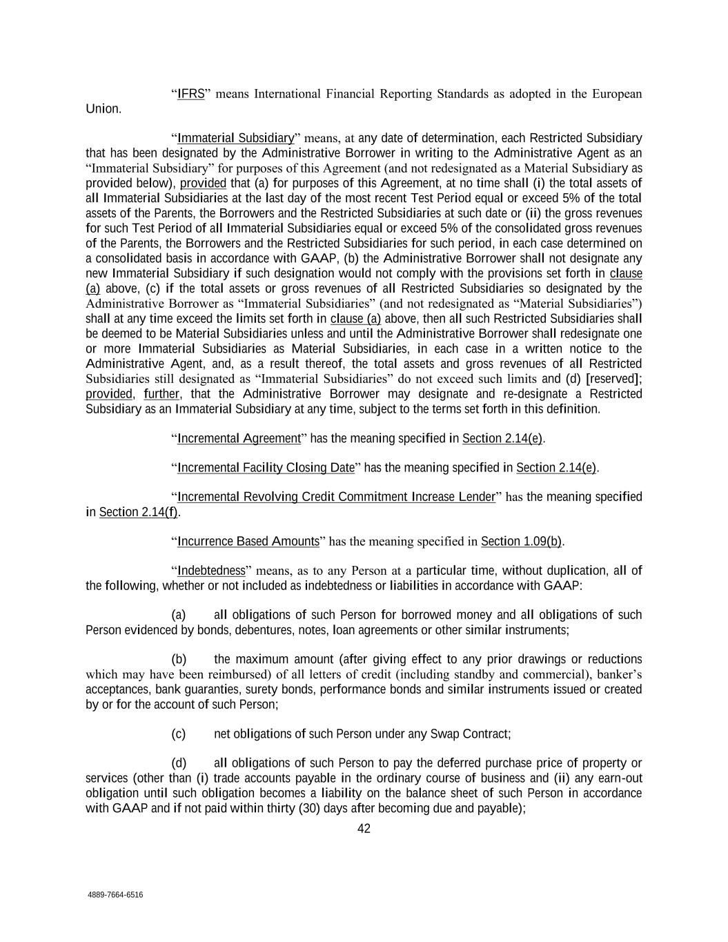 42 4889-7664-6516 “IFRS” means International Financial Reporting Standards as adopted in the European Union. “Immaterial Subsidiary” means, at any date of determination, each Restricted Subsidiary that has been designated by the Administrative Borrower in writing to the Administrative Agent as an “Immaterial Subsidiary” for purposes of this Agreement (and not redesignated as a Material Subsidiary as provided below), provided that (a) for purposes of this Agreement, at no time shall (i) the total assets of all Immaterial Subsidiaries at the last day of the most recent Test Period equal or exceed 5% of the total assets of the Parents, the Borrowers and the Restricted Subsidiaries at such date or (ii) the gross revenues for such Test Period of all Immaterial Subsidiaries equal or exceed 5% of the consolidated gross revenues of the Parents, the Borrowers and the Restricted Subsidiaries for such period, in each case determined on a consolidated basis in accordance with GAAP, (b) the Administrative Borrower shall not designate any new Immaterial Subsidiary if such designation would not comply with the provisions set forth in clause (a) above, (c) if the total assets or gross revenues of all Restricted Subsidiaries so designated by the Administrative Borrower as “Immaterial Subsidiaries” (and not redesignated as “Material Subsidiaries”) shall at any time exceed the limits set forth in clause (a) above, then all such Restricted Subsidiaries shall be deemed to be Material Subsidiaries unless and until the Administrative Borrower shall redesignate one or more Immaterial Subsidiaries as Material Subsidiaries, in each case in a written notice to the Administrative Agent, and, as a result thereof, the total assets and gross revenues of all Restricted Subsidiaries still designated as “Immaterial Subsidiaries” do not exceed such limits and (d) [reserved]; provided, further, that the Administrative Borrower may designate and re-designate a Restricted Subsidiary as an Immaterial Subsidiary at any time, subject to the terms set forth in this definition. “Incremental Agreement” has the meaning specified in Section 2.14(e). “Incremental Facility Closing Date” has the meaning specified in Section 2.14(e). “Incremental Revolving Credit Commitment Increase Lender” has the meaning specified in Section 2.14(f). “Incurrence Based Amounts” has the meaning specified in Section 1.09(b). “Indebtedness” means, as to any Person at a particular time, without duplication, all of the following, whether or not included as indebtedness or liabilities in accordance with GAAP: (a) all obligations of such Person for borrowed money and all obligations of such Person evidenced by bonds, debentures, notes, loan agreements or other similar instruments; (b) the maximum amount (after giving effect to any prior drawings or reductions which may have been reimbursed) of all letters of credit (including standby and commercial), banker’s acceptances, bank guaranties, surety bonds, performance bonds and similar instruments issued or created by or for the account of such Person; (c) net obligations of such Person under any Swap Contract; (d) all obligations of such Person to pay the deferred purchase price of property or services (other than (i) trade accounts payable in the ordinary course of business and (ii) any earn-out obligation until such obligation becomes a liability on the balance sheet of such Person in accordance with GAAP and if not paid within thirty (30) days after becoming due and payable);