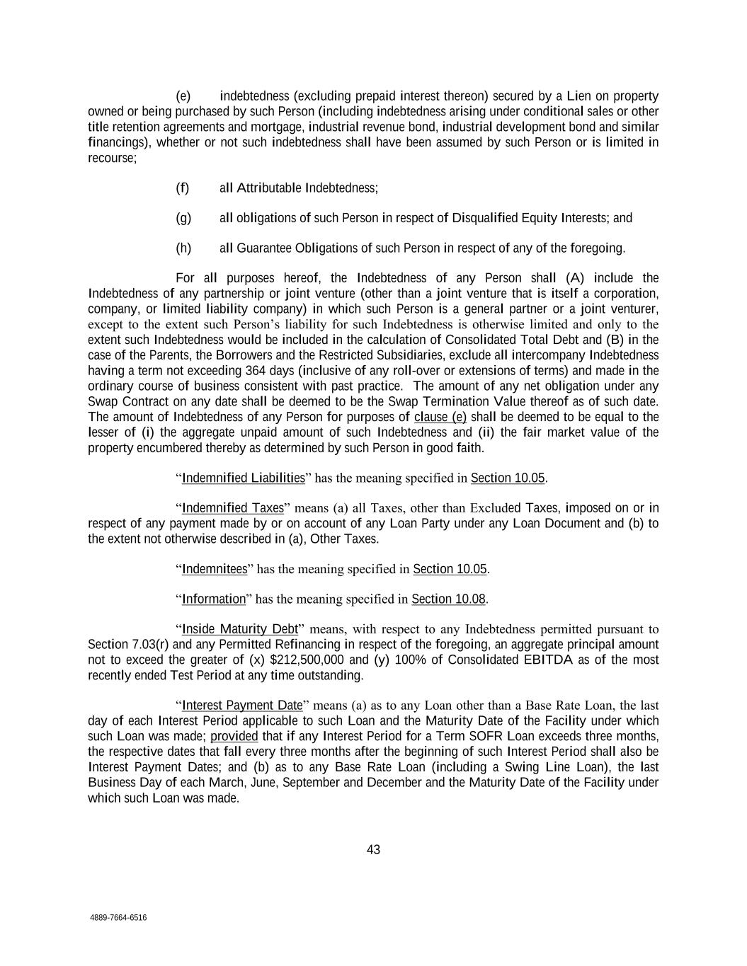 43 4889-7664-6516 (e) indebtedness (excluding prepaid interest thereon) secured by a Lien on property owned or being purchased by such Person (including indebtedness arising under conditional sales or other title retention agreements and mortgage, industrial revenue bond, industrial development bond and similar financings), whether or not such indebtedness shall have been assumed by such Person or is limited in recourse; (f) all Attributable Indebtedness; (g) all obligations of such Person in respect of Disqualified Equity Interests; and (h) all Guarantee Obligations of such Person in respect of any of the foregoing. For all purposes hereof, the Indebtedness of any Person shall (A) include the Indebtedness of any partnership or joint venture (other than a joint venture that is itself a corporation, company, or limited liability company) in which such Person is a general partner or a joint venturer, except to the extent such Person’s liability for such Indebtedness is otherwise limited and only to the extent such Indebtedness would be included in the calculation of Consolidated Total Debt and (B) in the case of the Parents, the Borrowers and the Restricted Subsidiaries, exclude all intercompany Indebtedness having a term not exceeding 364 days (inclusive of any roll-over or extensions of terms) and made in the ordinary course of business consistent with past practice. The amount of any net obligation under any Swap Contract on any date shall be deemed to be the Swap Termination Value thereof as of such date. The amount of Indebtedness of any Person for purposes of clause (e) shall be deemed to be equal to the lesser of (i) the aggregate unpaid amount of such Indebtedness and (ii) the fair market value of the property encumbered thereby as determined by such Person in good faith. “Indemnified Liabilities” has the meaning specified in Section 10.05. “Indemnified Taxes” means (a) all Taxes, other than Excluded Taxes, imposed on or in respect of any payment made by or on account of any Loan Party under any Loan Document and (b) to the extent not otherwise described in (a), Other Taxes. “Indemnitees” has the meaning specified in Section 10.05. “Information” has the meaning specified in Section 10.08. “Inside Maturity Debt” means, with respect to any Indebtedness permitted pursuant to Section 7.03(r) and any Permitted Refinancing in respect of the foregoing, an aggregate principal amount not to exceed the greater of (x) $212,500,000 and (y) 100% of Consolidated EBITDA as of the most recently ended Test Period at any time outstanding. “Interest Payment Date” means (a) as to any Loan other than a Base Rate Loan, the last day of each Interest Period applicable to such Loan and the Maturity Date of the Facility under which such Loan was made; provided that if any Interest Period for a Term SOFR Loan exceeds three months, the respective dates that fall every three months after the beginning of such Interest Period shall also be Interest Payment Dates; and (b) as to any Base Rate Loan (including a Swing Line Loan), the last Business Day of each March, June, September and December and the Maturity Date of the Facility under which such Loan was made.