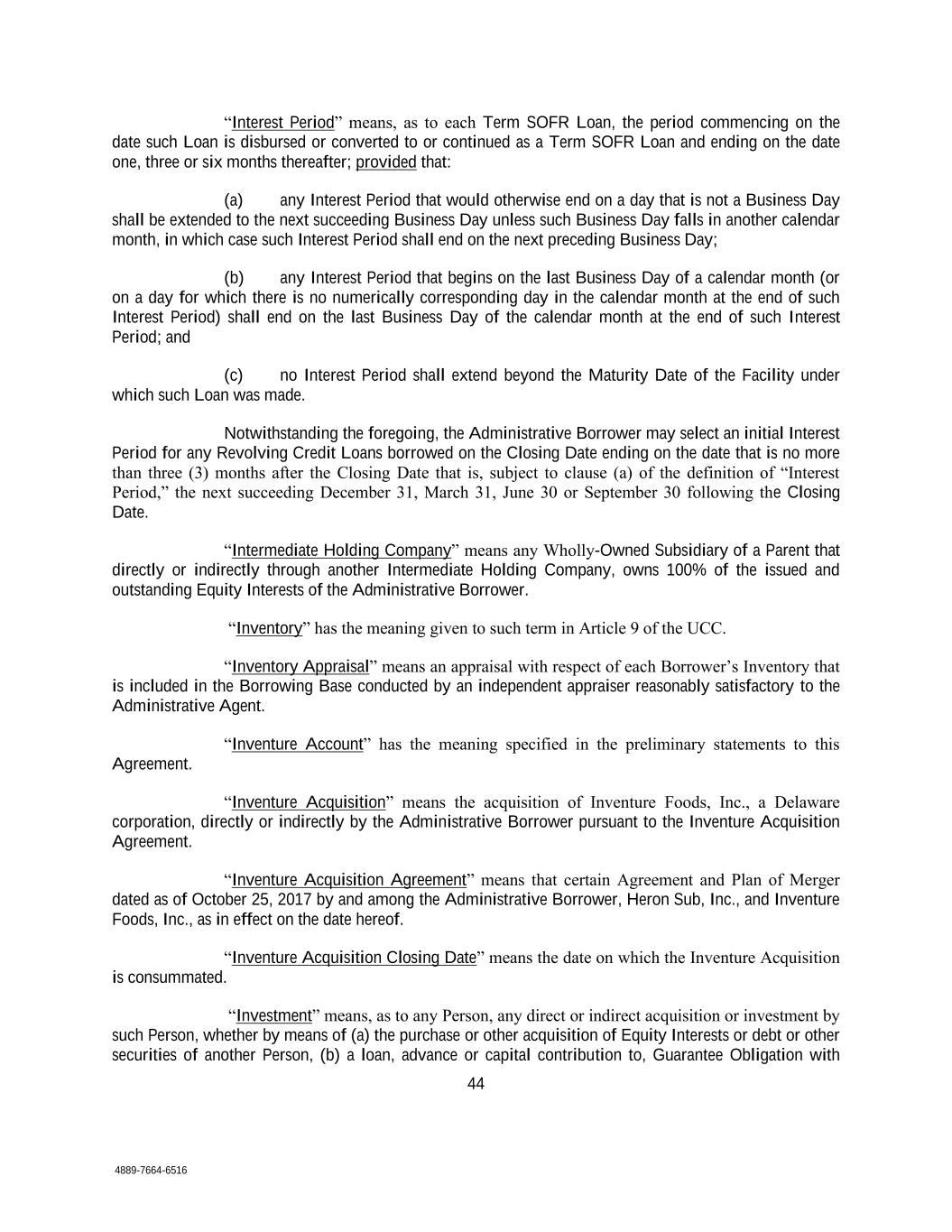 44 4889-7664-6516 “Interest Period” means, as to each Term SOFR Loan, the period commencing on the date such Loan is disbursed or converted to or continued as a Term SOFR Loan and ending on the date one, three or six months thereafter; provided that: (a) any Interest Period that would otherwise end on a day that is not a Business Day shall be extended to the next succeeding Business Day unless such Business Day falls in another calendar month, in which case such Interest Period shall end on the next preceding Business Day; (b) any Interest Period that begins on the last Business Day of a calendar month (or on a day for which there is no numerically corresponding day in the calendar month at the end of such Interest Period) shall end on the last Business Day of the calendar month at the end of such Interest Period; and (c) no Interest Period shall extend beyond the Maturity Date of the Facility under which such Loan was made. Notwithstanding the foregoing, the Administrative Borrower may select an initial Interest Period for any Revolving Credit Loans borrowed on the Closing Date ending on the date that is no more than three (3) months after the Closing Date that is, subject to clause (a) of the definition of “Interest Period,” the next succeeding December 31, March 31, June 30 or September 30 following the Closing Date. “Intermediate Holding Company” means any Wholly-Owned Subsidiary of a Parent that directly or indirectly through another Intermediate Holding Company, owns 100% of the issued and outstanding Equity Interests of the Administrative Borrower. “Inventory” has the meaning given to such term in Article 9 of the UCC. “Inventory Appraisal” means an appraisal with respect of each Borrower’s Inventory that is included in the Borrowing Base conducted by an independent appraiser reasonably satisfactory to the Administrative Agent. “Inventure Account” has the meaning specified in the preliminary statements to this Agreement. “Inventure Acquisition” means the acquisition of Inventure Foods, Inc., a Delaware corporation, directly or indirectly by the Administrative Borrower pursuant to the Inventure Acquisition Agreement. “Inventure Acquisition Agreement” means that certain Agreement and Plan of Merger dated as of October 25, 2017 by and among the Administrative Borrower, Heron Sub, Inc., and Inventure Foods, Inc., as in effect on the date hereof. “Inventure Acquisition Closing Date” means the date on which the Inventure Acquisition is consummated. “Investment” means, as to any Person, any direct or indirect acquisition or investment by such Person, whether by means of (a) the purchase or other acquisition of Equity Interests or debt or other securities of another Person, (b) a loan, advance or capital contribution to, Guarantee Obligation with