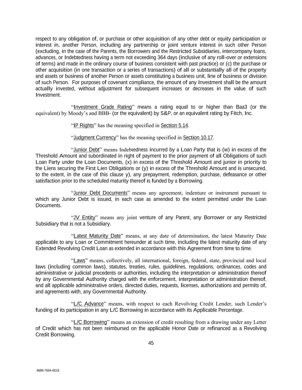 45 4889-7664-6516 respect to any obligation of, or purchase or other acquisition of any other debt or equity participation or interest in, another Person, including any partnership or joint venture interest in such other Person (excluding, in the case of the Parents, the Borrowers and the Restricted Subsidiaries, intercompany loans, advances, or Indebtedness having a term not exceeding 364 days (inclusive of any roll-over or extensions of terms) and made in the ordinary course of business consistent with past practice) or (c) the purchase or other acquisition (in one transaction or a series of transactions) of all or substantially all of the property and assets or business of another Person or assets constituting a business unit, line of business or division of such Person. For purposes of covenant compliance, the amount of any Investment shall be the amount actually invested, without adjustment for subsequent increases or decreases in the value of such Investment. “Investment Grade Rating” means a rating equal to or higher than Baa3 (or the equivalent) by Moody’s and BBB- (or the equivalent) by S&P, or an equivalent rating by Fitch, Inc. “IP Rights” has the meaning specified in Section 5.14. “Judgment Currency” has the meaning specified in Section 10.17. “Junior Debt” means Indebtedness incurred by a Loan Party that is (w) in excess of the Threshold Amount and subordinated in right of payment to the prior payment of all Obligations of such Loan Party under the Loan Documents, (x) in excess of the Threshold Amount and junior in priority to the Liens securing the First Lien Obligations or (y) in excess of the Threshold Amount and is unsecured, to the extent, in the case of this clause y), any prepayment, redemption, purchase, defeasance or other satisfaction prior to the scheduled maturity thereof is funded by a Borrowing. “Junior Debt Documents” means any agreement, indenture or instrument pursuant to which any Junior Debt is issued, in each case as amended to the extent permitted under the Loan Documents. “JV Entity” means any joint venture of any Parent, any Borrower or any Restricted Subsidiary that is not a Subsidiary. “Latest Maturity Date” means, at any date of determination, the latest Maturity Date applicable to any Loan or Commitment hereunder at such time, including the latest maturity date of any Extended Revolving Credit Loan as extended in accordance with this Agreement from time to time. “Laws” means, collectively, all international, foreign, federal, state, provincial and local laws (including common laws), statutes, treaties, rules, guidelines, regulations, ordinances, codes and administrative or judicial precedents or authorities, including the interpretation or administration thereof by any Governmental Authority charged with the enforcement, interpretation or administration thereof, and all applicable administrative orders, directed duties, requests, licenses, authorizations and permits of, and agreements with, any Governmental Authority. “L/C Advance” means, with respect to each Revolving Credit Lender, such Lender’s funding of its participation in any L/C Borrowing in accordance with its Applicable Percentage. “L/C Borrowing” means an extension of credit resulting from a drawing under any Letter of Credit which has not been reimbursed on the applicable Honor Date or refinanced as a Revolving Credit Borrowing.