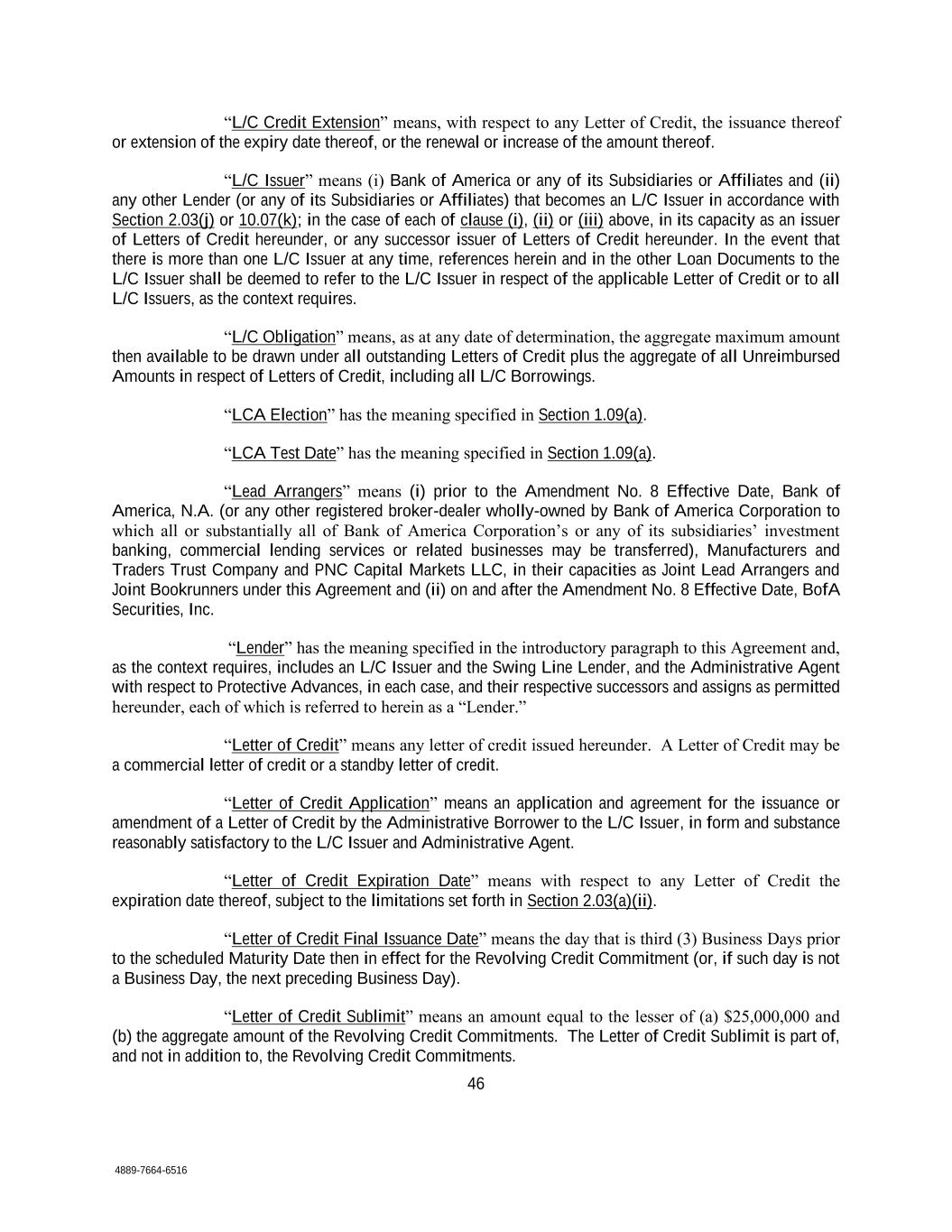 46 4889-7664-6516 “L/C Credit Extension” means, with respect to any Letter of Credit, the issuance thereof or extension of the expiry date thereof, or the renewal or increase of the amount thereof. “L/C Issuer” means (i) Bank of America or any of its Subsidiaries or Affiliates and (ii) any other Lender (or any of its Subsidiaries or Affiliates) that becomes an L/C Issuer in accordance with Section 2.03(j) or 10.07(k); in the case of each of clause (i), (ii) or (iii) above, in its capacity as an issuer of Letters of Credit hereunder, or any successor issuer of Letters of Credit hereunder. In the event that there is more than one L/C Issuer at any time, references herein and in the other Loan Documents to the L/C Issuer shall be deemed to refer to the L/C Issuer in respect of the applicable Letter of Credit or to all L/C Issuers, as the context requires. “L/C Obligation” means, as at any date of determination, the aggregate maximum amount then available to be drawn under all outstanding Letters of Credit plus the aggregate of all Unreimbursed Amounts in respect of Letters of Credit, including all L/C Borrowings. “LCA Election” has the meaning specified in Section 1.09(a). “LCA Test Date” has the meaning specified in Section 1.09(a). “Lead Arrangers” means (i) prior to the Amendment No. 8 Effective Date, Bank of America, N.A. (or any other registered broker-dealer wholly-owned by Bank of America Corporation to which all or substantially all of Bank of America Corporation’s or any of its subsidiaries’ investment banking, commercial lending services or related businesses may be transferred), Manufacturers and Traders Trust Company and PNC Capital Markets LLC, in their capacities as Joint Lead Arrangers and Joint Bookrunners under this Agreement and (ii) on and after the Amendment No. 8 Effective Date, BofA Securities, Inc. “Lender” has the meaning specified in the introductory paragraph to this Agreement and, as the context requires, includes an L/C Issuer and the Swing Line Lender, and the Administrative Agent with respect to Protective Advances, in each case, and their respective successors and assigns as permitted hereunder, each of which is referred to herein as a “Lender.” “Letter of Credit” means any letter of credit issued hereunder. A Letter of Credit may be a commercial letter of credit or a standby letter of credit. “Letter of Credit Application” means an application and agreement for the issuance or amendment of a Letter of Credit by the Administrative Borrower to the L/C Issuer, in form and substance reasonably satisfactory to the L/C Issuer and Administrative Agent. “Letter of Credit Expiration Date” means with respect to any Letter of Credit the expiration date thereof, subject to the limitations set forth in Section 2.03(a)(ii). “Letter of Credit Final Issuance Date” means the day that is third (3) Business Days prior to the scheduled Maturity Date then in effect for the Revolving Credit Commitment (or, if such day is not a Business Day, the next preceding Business Day). “Letter of Credit Sublimit” means an amount equal to the lesser of (a) $25,000,000 and (b) the aggregate amount of the Revolving Credit Commitments. The Letter of Credit Sublimit is part of, and not in addition to, the Revolving Credit Commitments.