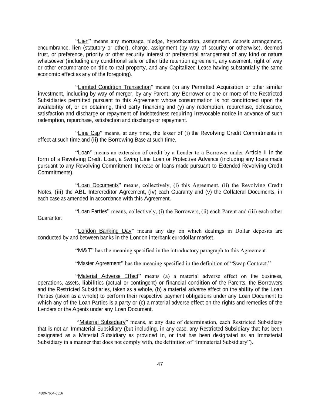 47 4889-7664-6516 “Lien” means any mortgage, pledge, hypothecation, assignment, deposit arrangement, encumbrance, lien (statutory or other), charge, assignment (by way of security or otherwise), deemed trust, or preference, priority or other security interest or preferential arrangement of any kind or nature whatsoever (including any conditional sale or other title retention agreement, any easement, right of way or other encumbrance on title to real property, and any Capitalized Lease having substantially the same economic effect as any of the foregoing). “Limited Condition Transaction” means (x) any Permitted Acquisition or other similar investment, including by way of merger, by any Parent, any Borrower or one or more of the Restricted Subsidiaries permitted pursuant to this Agreement whose consummation is not conditioned upon the availability of, or on obtaining, third party financing and (y) any redemption, repurchase, defeasance, satisfaction and discharge or repayment of indebtedness requiring irrevocable notice in advance of such redemption, repurchase, satisfaction and discharge or repayment. “Line Cap” means, at any time, the lesser of (i) the Revolving Credit Commitments in effect at such time and (ii) the Borrowing Base at such time. “Loan” means an extension of credit by a Lender to a Borrower under Article II in the form of a Revolving Credit Loan, a Swing Line Loan or Protective Advance (including any loans made pursuant to any Revolving Commitment Increase or loans made pursuant to Extended Revolving Credit Commitments). “Loan Documents” means, collectively, (i) this Agreement, (ii) the Revolving Credit Notes, (iii) the ABL Intercreditor Agreement, (iv) each Guaranty and (v) the Collateral Documents, in each case as amended in accordance with this Agreement. “Loan Parties” means, collectively, (i) the Borrowers, (ii) each Parent and (iii) each other Guarantor. “London Banking Day” means any day on which dealings in Dollar deposits are conducted by and between banks in the London interbank eurodollar market. “M&T” has the meaning specified in the introductory paragraph to this Agreement. “Master Agreement” has the meaning specified in the definition of “Swap Contract.” “Material Adverse Effect” means (a) a material adverse effect on the business, operations, assets, liabilities (actual or contingent) or financial condition of the Parents, the Borrowers and the Restricted Subsidiaries, taken as a whole, (b) a material adverse effect on the ability of the Loan Parties (taken as a whole) to perform their respective payment obligations under any Loan Document to which any of the Loan Parties is a party or (c) a material adverse effect on the rights and remedies of the Lenders or the Agents under any Loan Document. “Material Subsidiary” means, at any date of determination, each Restricted Subsidiary that is not an Immaterial Subsidiary (but including, in any case, any Restricted Subsidiary that has been designated as a Material Subsidiary as provided in, or that has been designated as an Immaterial Subsidiary in a manner that does not comply with, the definition of “Immaterial Subsidiary”).