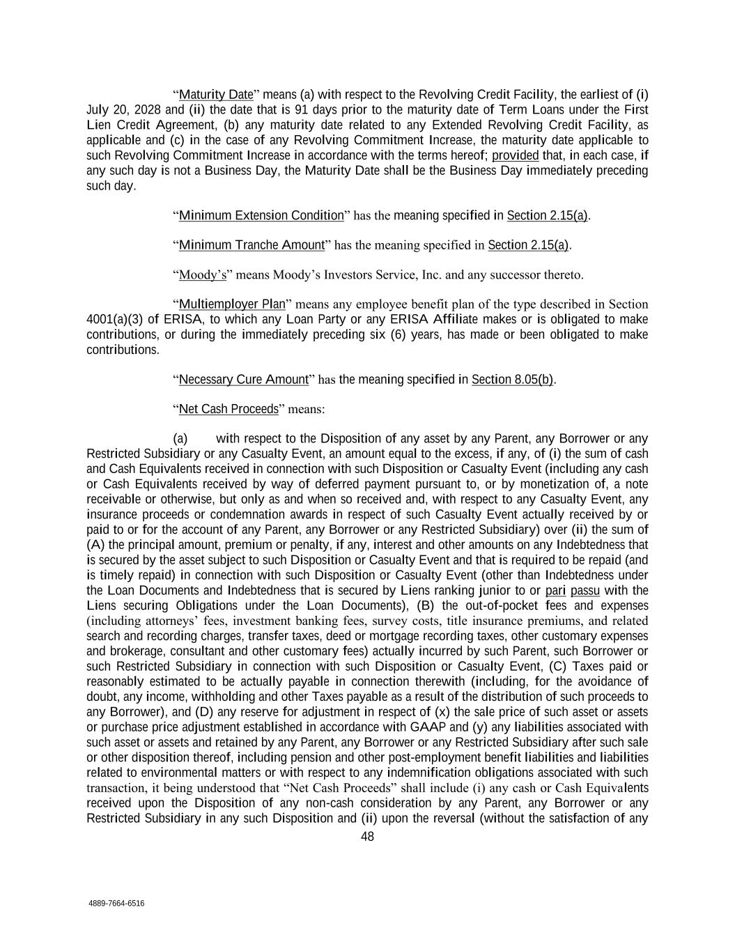 48 4889-7664-6516 “Maturity Date” means (a) with respect to the Revolving Credit Facility, the earliest of (i) July 20, 2028 and (ii) the date that is 91 days prior to the maturity date of Term Loans under the First Lien Credit Agreement, (b) any maturity date related to any Extended Revolving Credit Facility, as applicable and (c) in the case of any Revolving Commitment Increase, the maturity date applicable to such Revolving Commitment Increase in accordance with the terms hereof; provided that, in each case, if any such day is not a Business Day, the Maturity Date shall be the Business Day immediately preceding such day. “Minimum Extension Condition” has the meaning specified in Section 2.15(a). “Minimum Tranche Amount” has the meaning specified in Section 2.15(a). “Moody’s” means Moody’s Investors Service, Inc. and any successor thereto. “Multiemployer Plan” means any employee benefit plan of the type described in Section 4001(a)(3) of ERISA, to which any Loan Party or any ERISA Affiliate makes or is obligated to make contributions, or during the immediately preceding six (6) years, has made or been obligated to make contributions. “Necessary Cure Amount” has the meaning specified in Section 8.05(b). “Net Cash Proceeds” means: (a) with respect to the Disposition of any asset by any Parent, any Borrower or any Restricted Subsidiary or any Casualty Event, an amount equal to the excess, if any, of (i) the sum of cash and Cash Equivalents received in connection with such Disposition or Casualty Event (including any cash or Cash Equivalents received by way of deferred payment pursuant to, or by monetization of, a note receivable or otherwise, but only as and when so received and, with respect to any Casualty Event, any insurance proceeds or condemnation awards in respect of such Casualty Event actually received by or paid to or for the account of any Parent, any Borrower or any Restricted Subsidiary) over (ii) the sum of (A) the principal amount, premium or penalty, if any, interest and other amounts on any Indebtedness that is secured by the asset subject to such Disposition or Casualty Event and that is required to be repaid (and is timely repaid) in connection with such Disposition or Casualty Event (other than Indebtedness under the Loan Documents and Indebtedness that is secured by Liens ranking junior to or pari passu with the Liens securing Obligations under the Loan Documents), (B) the out-of-pocket fees and expenses (including attorneys’ fees, investment banking fees, survey costs, title insurance premiums, and related search and recording charges, transfer taxes, deed or mortgage recording taxes, other customary expenses and brokerage, consultant and other customary fees) actually incurred by such Parent, such Borrower or such Restricted Subsidiary in connection with such Disposition or Casualty Event, (C) Taxes paid or reasonably estimated to be actually payable in connection therewith (including, for the avoidance of doubt, any income, withholding and other Taxes payable as a result of the distribution of such proceeds to any Borrower), and (D) any reserve for adjustment in respect of (x) the sale price of such asset or assets or purchase price adjustment established in accordance with GAAP and (y) any liabilities associated with such asset or assets and retained by any Parent, any Borrower or any Restricted Subsidiary after such sale or other disposition thereof, including pension and other post-employment benefit liabilities and liabilities related to environmental matters or with respect to any indemnification obligations associated with such transaction, it being understood that “Net Cash Proceeds” shall include (i) any cash or Cash Equivalents received upon the Disposition of any non-cash consideration by any Parent, any Borrower or any Restricted Subsidiary in any such Disposition and (ii) upon the reversal (without the satisfaction of any