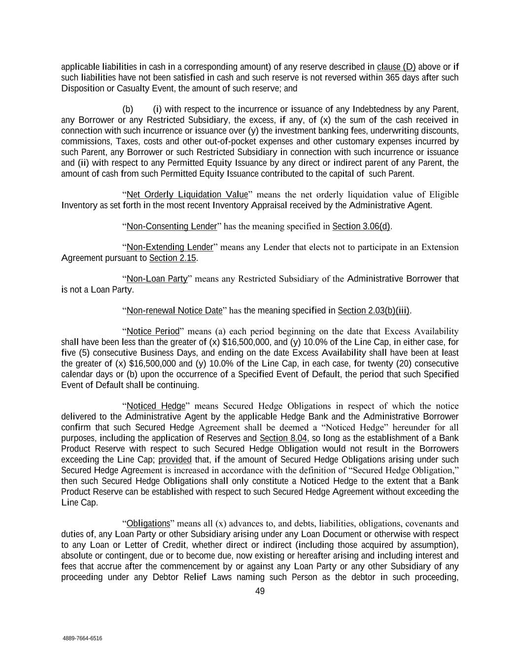 49 4889-7664-6516 applicable liabilities in cash in a corresponding amount) of any reserve described in clause (D) above or if such liabilities have not been satisfied in cash and such reserve is not reversed within 365 days after such Disposition or Casualty Event, the amount of such reserve; and (b) (i) with respect to the incurrence or issuance of any Indebtedness by any Parent, any Borrower or any Restricted Subsidiary, the excess, if any, of (x) the sum of the cash received in connection with such incurrence or issuance over (y) the investment banking fees, underwriting discounts, commissions, Taxes, costs and other out-of-pocket expenses and other customary expenses incurred by such Parent, any Borrower or such Restricted Subsidiary in connection with such incurrence or issuance and (ii) with respect to any Permitted Equity Issuance by any direct or indirect parent of any Parent, the amount of cash from such Permitted Equity Issuance contributed to the capital of such Parent. “Net Orderly Liquidation Value” means the net orderly liquidation value of Eligible Inventory as set forth in the most recent Inventory Appraisal received by the Administrative Agent. “Non-Consenting Lender” has the meaning specified in Section 3.06(d). “Non-Extending Lender” means any Lender that elects not to participate in an Extension Agreement pursuant to Section 2.15. “Non-Loan Party” means any Restricted Subsidiary of the Administrative Borrower that is not a Loan Party. “Non-renewal Notice Date” has the meaning specified in Section 2.03(b)(iii). “Notice Period” means (a) each period beginning on the date that Excess Availability shall have been less than the greater of (x) $16,500,000, and (y) 10.0% of the Line Cap, in either case, for five (5) consecutive Business Days, and ending on the date Excess Availability shall have been at least the greater of (x) $16,500,000 and (y) 10.0% of the Line Cap, in each case, for twenty (20) consecutive calendar days or (b) upon the occurrence of a Specified Event of Default, the period that such Specified Event of Default shall be continuing. “Noticed Hedge” means Secured Hedge Obligations in respect of which the notice delivered to the Administrative Agent by the applicable Hedge Bank and the Administrative Borrower confirm that such Secured Hedge Agreement shall be deemed a “Noticed Hedge” hereunder for all purposes, including the application of Reserves and Section 8.04, so long as the establishment of a Bank Product Reserve with respect to such Secured Hedge Obligation would not result in the Borrowers exceeding the Line Cap; provided that, if the amount of Secured Hedge Obligations arising under such Secured Hedge Agreement is increased in accordance with the definition of “Secured Hedge Obligation,” then such Secured Hedge Obligations shall only constitute a Noticed Hedge to the extent that a Bank Product Reserve can be established with respect to such Secured Hedge Agreement without exceeding the Line Cap. “Obligations” means all (x) advances to, and debts, liabilities, obligations, covenants and duties of, any Loan Party or other Subsidiary arising under any Loan Document or otherwise with respect to any Loan or Letter of Credit, whether direct or indirect (including those acquired by assumption), absolute or contingent, due or to become due, now existing or hereafter arising and including interest and fees that accrue after the commencement by or against any Loan Party or any other Subsidiary of any proceeding under any Debtor Relief Laws naming such Person as the debtor in such proceeding,
