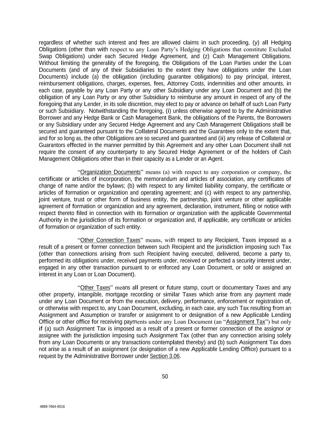 50 4889-7664-6516 regardless of whether such interest and fees are allowed claims in such proceeding, (y) all Hedging Obligations (other than with respect to any Loan Party’s Hedging Obligations that constitute Excluded Swap Obligations) under each Secured Hedge Agreement, and (z) Cash Management Obligations. Without limiting the generality of the foregoing, the Obligations of the Loan Parties under the Loan Documents (and of any of their Subsidiaries to the extent they have obligations under the Loan Documents) include (a) the obligation (including guarantee obligations) to pay principal, interest, reimbursement obligations, charges, expenses, fees, Attorney Costs, indemnities and other amounts, in each case, payable by any Loan Party or any other Subsidiary under any Loan Document and (b) the obligation of any Loan Party or any other Subsidiary to reimburse any amount in respect of any of the foregoing that any Lender, in its sole discretion, may elect to pay or advance on behalf of such Loan Party or such Subsidiary. Notwithstanding the foregoing, (i) unless otherwise agreed to by the Administrative Borrower and any Hedge Bank or Cash Management Bank, the obligations of the Parents, the Borrowers or any Subsidiary under any Secured Hedge Agreement and any Cash Management Obligations shall be secured and guaranteed pursuant to the Collateral Documents and the Guarantees only to the extent that, and for so long as, the other Obligations are so secured and guaranteed and (ii) any release of Collateral or Guarantors effected in the manner permitted by this Agreement and any other Loan Document shall not require the consent of any counterparty to any Secured Hedge Agreement or of the holders of Cash Management Obligations other than in their capacity as a Lender or an Agent. “Organization Documents” means (a) with respect to any corporation or company, the certificate or articles of incorporation, the memorandum and articles of association, any certificates of change of name and/or the bylaws; (b) with respect to any limited liability company, the certificate or articles of formation or organization and operating agreement; and (c) with respect to any partnership, joint venture, trust or other form of business entity, the partnership, joint venture or other applicable agreement of formation or organization and any agreement, declaration, instrument, filing or notice with respect thereto filed in connection with its formation or organization with the applicable Governmental Authority in the jurisdiction of its formation or organization and, if applicable, any certificate or articles of formation or organization of such entity. “Other Connection Taxes” means, with respect to any Recipient, Taxes imposed as a result of a present or former connection between such Recipient and the jurisdiction imposing such Tax (other than connections arising from such Recipient having executed, delivered, become a party to, performed its obligations under, received payments under, received or perfected a security interest under, engaged in any other transaction pursuant to or enforced any Loan Document, or sold or assigned an interest in any Loan or Loan Document). “Other Taxes” means all present or future stamp, court or documentary Taxes and any other property, intangible, mortgage recording or similar Taxes which arise from any payment made under any Loan Document or from the execution, delivery, performance, enforcement or registration of, or otherwise with respect to, any Loan Document, excluding, in each case, any such Tax resulting from an Assignment and Assumption or transfer or assignment to or designation of a new Applicable Lending Office or other office for receiving payments under any Loan Document (an “Assignment Tax”) but only if (a) such Assignment Tax is imposed as a result of a present or former connection of the assignor or assignee with the jurisdiction imposing such Assignment Tax (other than any connection arising solely from any Loan Documents or any transactions contemplated thereby) and (b) such Assignment Tax does not arise as a result of an assignment (or designation of a new Applicable Lending Office) pursuant to a request by the Administrative Borrower under Section 3.06.