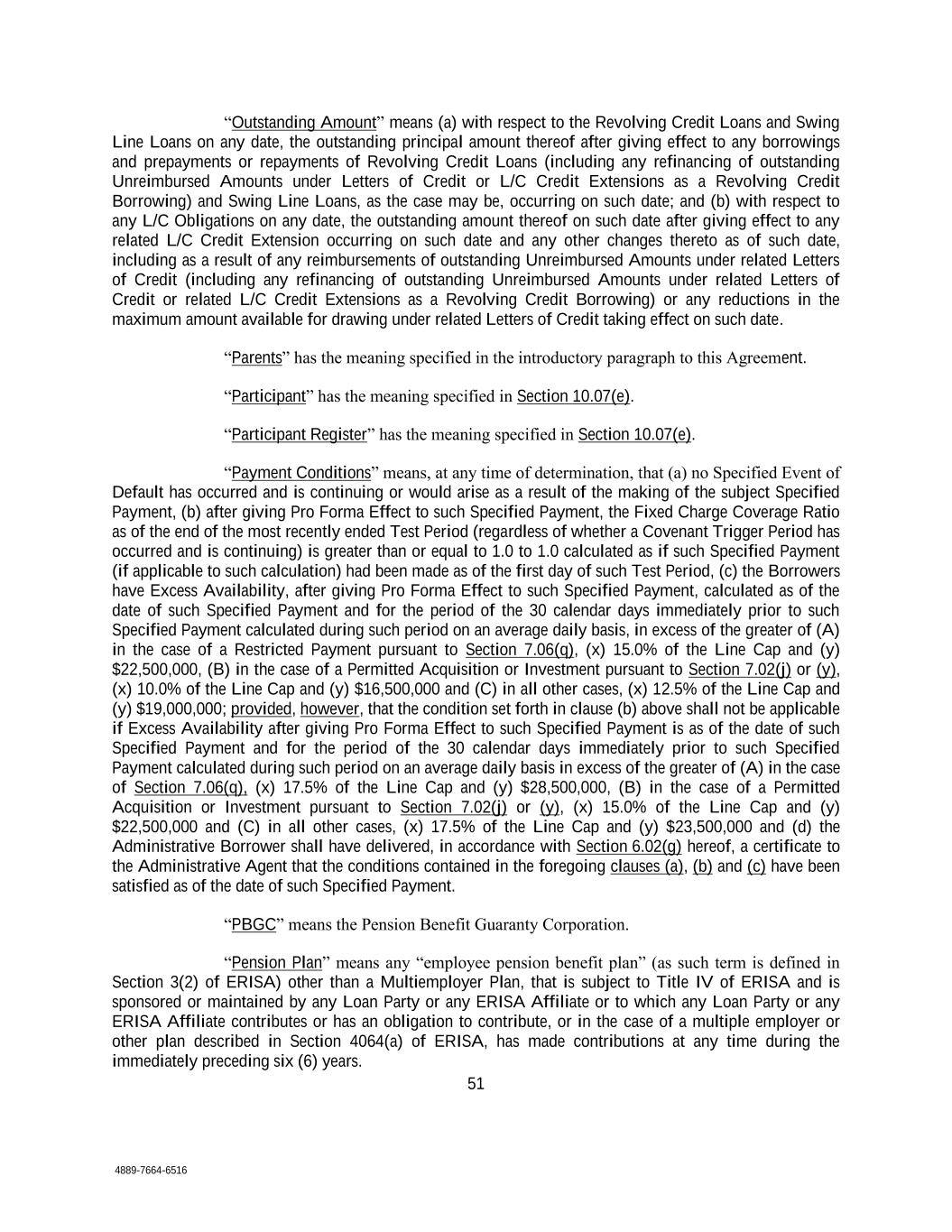 51 4889-7664-6516 “Outstanding Amount” means (a) with respect to the Revolving Credit Loans and Swing Line Loans on any date, the outstanding principal amount thereof after giving effect to any borrowings and prepayments or repayments of Revolving Credit Loans (including any refinancing of outstanding Unreimbursed Amounts under Letters of Credit or L/C Credit Extensions as a Revolving Credit Borrowing) and Swing Line Loans, as the case may be, occurring on such date; and (b) with respect to any L/C Obligations on any date, the outstanding amount thereof on such date after giving effect to any related L/C Credit Extension occurring on such date and any other changes thereto as of such date, including as a result of any reimbursements of outstanding Unreimbursed Amounts under related Letters of Credit (including any refinancing of outstanding Unreimbursed Amounts under related Letters of Credit or related L/C Credit Extensions as a Revolving Credit Borrowing) or any reductions in the maximum amount available for drawing under related Letters of Credit taking effect on such date. “Parents” has the meaning specified in the introductory paragraph to this Agreement. “Participant” has the meaning specified in Section 10.07(e). “Participant Register” has the meaning specified in Section 10.07(e). “Payment Conditions” means, at any time of determination, that (a) no Specified Event of Default has occurred and is continuing or would arise as a result of the making of the subject Specified Payment, (b) after giving Pro Forma Effect to such Specified Payment, the Fixed Charge Coverage Ratio as of the end of the most recently ended Test Period (regardless of whether a Covenant Trigger Period has occurred and is continuing) is greater than or equal to 1.0 to 1.0 calculated as if such Specified Payment (if applicable to such calculation) had been made as of the first day of such Test Period, (c) the Borrowers have Excess Availability, after giving Pro Forma Effect to such Specified Payment, calculated as of the date of such Specified Payment and for the period of the 30 calendar days immediately prior to such Specified Payment calculated during such period on an average daily basis, in excess of the greater of (A) in the case of a Restricted Payment pursuant to Section 7.06(q), (x) 15.0% of the Line Cap and (y) $22,500,000, (B) in the case of a Permitted Acquisition or Investment pursuant to Section 7.02(j) or (y), (x) 10.0% of the Line Cap and (y) $16,500,000 and (C) in all other cases, (x) 12.5% of the Line Cap and (y) $19,000,000; provided, however, that the condition set forth in clause (b) above shall not be applicable if Excess Availability after giving Pro Forma Effect to such Specified Payment is as of the date of such Specified Payment and for the period of the 30 calendar days immediately prior to such Specified Payment calculated during such period on an average daily basis in excess of the greater of (A) in the case of Section 7.06(q), (x) 17.5% of the Line Cap and (y) $28,500,000, (B) in the case of a Permitted Acquisition or Investment pursuant to Section 7.02(j) or (y), (x) 15.0% of the Line Cap and (y) $22,500,000 and (C) in all other cases, (x) 17.5% of the Line Cap and (y) $23,500,000 and (d) the Administrative Borrower shall have delivered, in accordance with Section 6.02(g) hereof, a certificate to the Administrative Agent that the conditions contained in the foregoing clauses (a), (b) and (c) have been satisfied as of the date of such Specified Payment. “PBGC” means the Pension Benefit Guaranty Corporation. “Pension Plan” means any “employee pension benefit plan” (as such term is defined in Section 3(2) of ERISA) other than a Multiemployer Plan, that is subject to Title IV of ERISA and is sponsored or maintained by any Loan Party or any ERISA Affiliate or to which any Loan Party or any ERISA Affiliate contributes or has an obligation to contribute, or in the case of a multiple employer or other plan described in Section 4064(a) of ERISA, has made contributions at any time during the immediately preceding six (6) years.