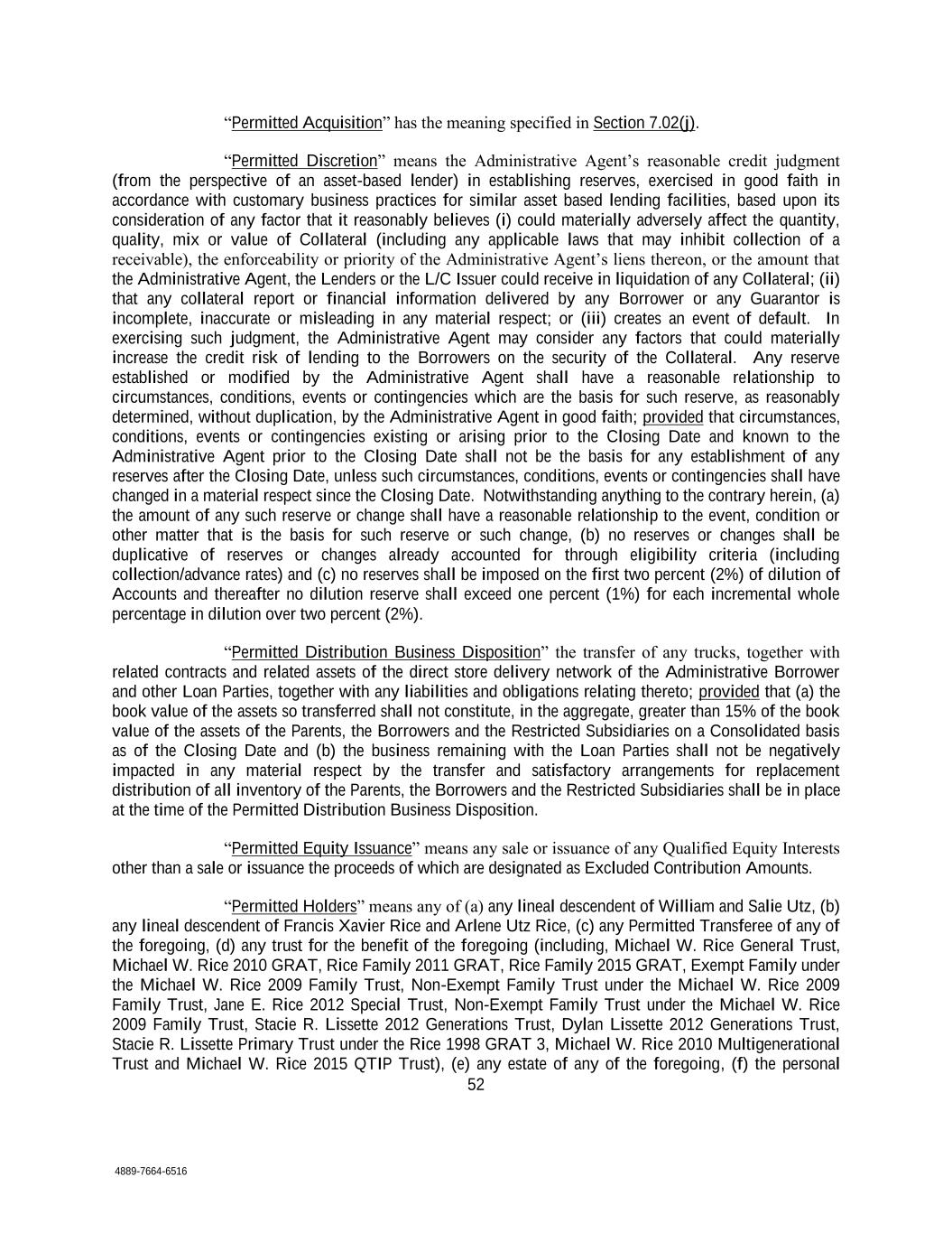 52 4889-7664-6516 “Permitted Acquisition” has the meaning specified in Section 7.02(j). “Permitted Discretion” means the Administrative Agent’s reasonable credit judgment (from the perspective of an asset-based lender) in establishing reserves, exercised in good faith in accordance with customary business practices for similar asset based lending facilities, based upon its consideration of any factor that it reasonably believes (i) could materially adversely affect the quantity, quality, mix or value of Collateral (including any applicable laws that may inhibit collection of a receivable), the enforceability or priority of the Administrative Agent’s liens thereon, or the amount that the Administrative Agent, the Lenders or the L/C Issuer could receive in liquidation of any Collateral; (ii) that any collateral report or financial information delivered by any Borrower or any Guarantor is incomplete, inaccurate or misleading in any material respect; or (iii) creates an event of default. In exercising such judgment, the Administrative Agent may consider any factors that could materially increase the credit risk of lending to the Borrowers on the security of the Collateral. Any reserve established or modified by the Administrative Agent shall have a reasonable relationship to circumstances, conditions, events or contingencies which are the basis for such reserve, as reasonably determined, without duplication, by the Administrative Agent in good faith; provided that circumstances, conditions, events or contingencies existing or arising prior to the Closing Date and known to the Administrative Agent prior to the Closing Date shall not be the basis for any establishment of any reserves after the Closing Date, unless such circumstances, conditions, events or contingencies shall have changed in a material respect since the Closing Date. Notwithstanding anything to the contrary herein, (a) the amount of any such reserve or change shall have a reasonable relationship to the event, condition or other matter that is the basis for such reserve or such change, (b) no reserves or changes shall be duplicative of reserves or changes already accounted for through eligibility criteria (including collection/advance rates) and (c) no reserves shall be imposed on the first two percent (2%) of dilution of Accounts and thereafter no dilution reserve shall exceed one percent (1%) for each incremental whole percentage in dilution over two percent (2%). “Permitted Distribution Business Disposition” the transfer of any trucks, together with related contracts and related assets of the direct store delivery network of the Administrative Borrower and other Loan Parties, together with any liabilities and obligations relating thereto; provided that (a) the book value of the assets so transferred shall not constitute, in the aggregate, greater than 15% of the book value of the assets of the Parents, the Borrowers and the Restricted Subsidiaries on a Consolidated basis as of the Closing Date and (b) the business remaining with the Loan Parties shall not be negatively impacted in any material respect by the transfer and satisfactory arrangements for replacement distribution of all inventory of the Parents, the Borrowers and the Restricted Subsidiaries shall be in place at the time of the Permitted Distribution Business Disposition. “Permitted Equity Issuance” means any sale or issuance of any Qualified Equity Interests other than a sale or issuance the proceeds of which are designated as Excluded Contribution Amounts. “Permitted Holders” means any of (a) any lineal descendent of William and Salie Utz, (b) any lineal descendent of Francis Xavier Rice and Arlene Utz Rice, (c) any Permitted Transferee of any of the foregoing, (d) any trust for the benefit of the foregoing (including, Michael W. Rice General Trust, Michael W. Rice 2010 GRAT, Rice Family 2011 GRAT, Rice Family 2015 GRAT, Exempt Family under the Michael W. Rice 2009 Family Trust, Non-Exempt Family Trust under the Michael W. Rice 2009 Family Trust, Jane E. Rice 2012 Special Trust, Non-Exempt Family Trust under the Michael W. Rice 2009 Family Trust, Stacie R. Lissette 2012 Generations Trust, Dylan Lissette 2012 Generations Trust, Stacie R. Lissette Primary Trust under the Rice 1998 GRAT 3, Michael W. Rice 2010 Multigenerational Trust and Michael W. Rice 2015 QTIP Trust), (e) any estate of any of the foregoing, (f) the personal