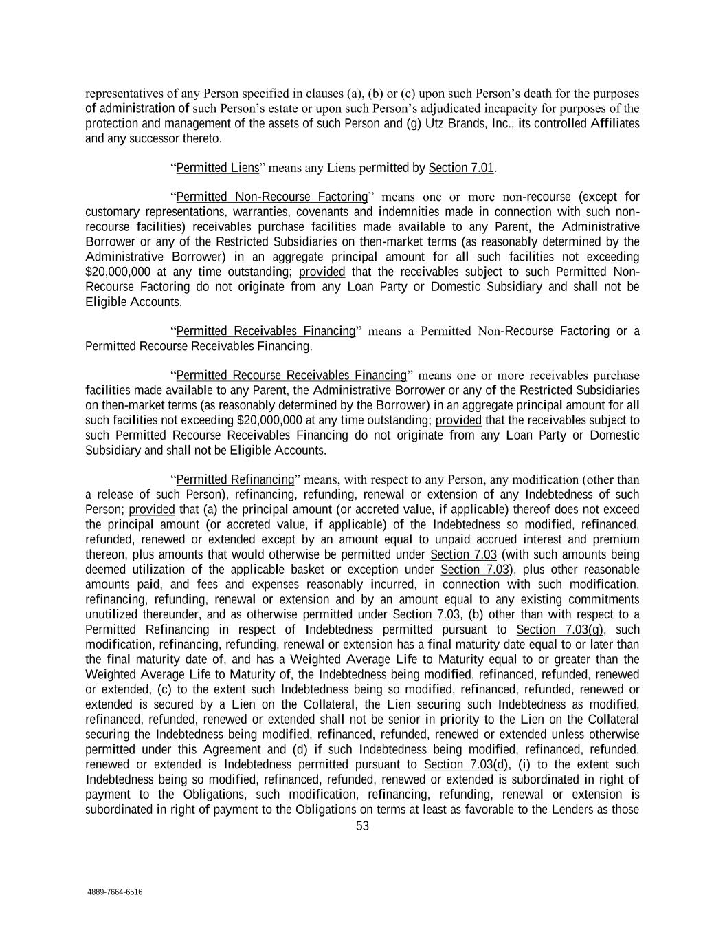 53 4889-7664-6516 representatives of any Person specified in clauses (a), (b) or (c) upon such Person’s death for the purposes of administration of such Person’s estate or upon such Person’s adjudicated incapacity for purposes of the protection and management of the assets of such Person and (g) Utz Brands, Inc., its controlled Affiliates and any successor thereto. “Permitted Liens” means any Liens permitted by Section 7.01. “Permitted Non-Recourse Factoring” means one or more non-recourse (except for customary representations, warranties, covenants and indemnities made in connection with such non- recourse facilities) receivables purchase facilities made available to any Parent, the Administrative Borrower or any of the Restricted Subsidiaries on then-market terms (as reasonably determined by the Administrative Borrower) in an aggregate principal amount for all such facilities not exceeding $20,000,000 at any time outstanding; provided that the receivables subject to such Permitted Non- Recourse Factoring do not originate from any Loan Party or Domestic Subsidiary and shall not be Eligible Accounts. “Permitted Receivables Financing” means a Permitted Non-Recourse Factoring or a Permitted Recourse Receivables Financing. “Permitted Recourse Receivables Financing” means one or more receivables purchase facilities made available to any Parent, the Administrative Borrower or any of the Restricted Subsidiaries on then-market terms (as reasonably determined by the Borrower) in an aggregate principal amount for all such facilities not exceeding $20,000,000 at any time outstanding; provided that the receivables subject to such Permitted Recourse Receivables Financing do not originate from any Loan Party or Domestic Subsidiary and shall not be Eligible Accounts. “Permitted Refinancing” means, with respect to any Person, any modification (other than a release of such Person), refinancing, refunding, renewal or extension of any Indebtedness of such Person; provided that (a) the principal amount (or accreted value, if applicable) thereof does not exceed the principal amount (or accreted value, if applicable) of the Indebtedness so modified, refinanced, refunded, renewed or extended except by an amount equal to unpaid accrued interest and premium thereon, plus amounts that would otherwise be permitted under Section 7.03 (with such amounts being deemed utilization of the applicable basket or exception under Section 7.03), plus other reasonable amounts paid, and fees and expenses reasonably incurred, in connection with such modification, refinancing, refunding, renewal or extension and by an amount equal to any existing commitments unutilized thereunder, and as otherwise permitted under Section 7.03, (b) other than with respect to a Permitted Refinancing in respect of Indebtedness permitted pursuant to Section 7.03(g), such modification, refinancing, refunding, renewal or extension has a final maturity date equal to or later than the final maturity date of, and has a Weighted Average Life to Maturity equal to or greater than the Weighted Average Life to Maturity of, the Indebtedness being modified, refinanced, refunded, renewed or extended, (c) to the extent such Indebtedness being so modified, refinanced, refunded, renewed or extended is secured by a Lien on the Collateral, the Lien securing such Indebtedness as modified, refinanced, refunded, renewed or extended shall not be senior in priority to the Lien on the Collateral securing the Indebtedness being modified, refinanced, refunded, renewed or extended unless otherwise permitted under this Agreement and (d) if such Indebtedness being modified, refinanced, refunded, renewed or extended is Indebtedness permitted pursuant to Section 7.03(d), (i) to the extent such Indebtedness being so modified, refinanced, refunded, renewed or extended is subordinated in right of payment to the Obligations, such modification, refinancing, refunding, renewal or extension is subordinated in right of payment to the Obligations on terms at least as favorable to the Lenders as those