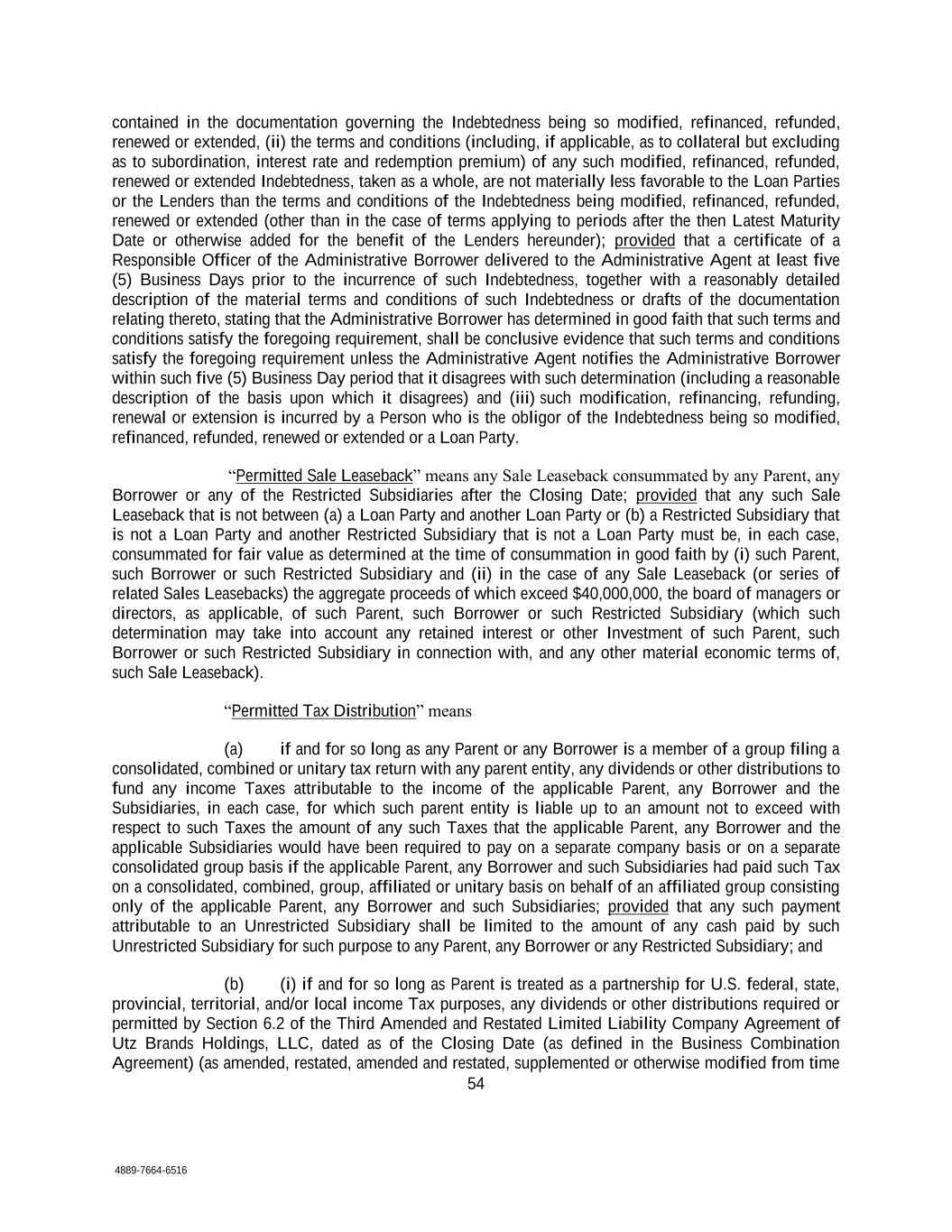 54 4889-7664-6516 contained in the documentation governing the Indebtedness being so modified, refinanced, refunded, renewed or extended, (ii) the terms and conditions (including, if applicable, as to collateral but excluding as to subordination, interest rate and redemption premium) of any such modified, refinanced, refunded, renewed or extended Indebtedness, taken as a whole, are not materially less favorable to the Loan Parties or the Lenders than the terms and conditions of the Indebtedness being modified, refinanced, refunded, renewed or extended (other than in the case of terms applying to periods after the then Latest Maturity Date or otherwise added for the benefit of the Lenders hereunder); provided that a certificate of a Responsible Officer of the Administrative Borrower delivered to the Administrative Agent at least five (5) Business Days prior to the incurrence of such Indebtedness, together with a reasonably detailed description of the material terms and conditions of such Indebtedness or drafts of the documentation relating thereto, stating that the Administrative Borrower has determined in good faith that such terms and conditions satisfy the foregoing requirement, shall be conclusive evidence that such terms and conditions satisfy the foregoing requirement unless the Administrative Agent notifies the Administrative Borrower within such five (5) Business Day period that it disagrees with such determination (including a reasonable description of the basis upon which it disagrees) and (iii) such modification, refinancing, refunding, renewal or extension is incurred by a Person who is the obligor of the Indebtedness being so modified, refinanced, refunded, renewed or extended or a Loan Party. “Permitted Sale Leaseback” means any Sale Leaseback consummated by any Parent, any Borrower or any of the Restricted Subsidiaries after the Closing Date; provided that any such Sale Leaseback that is not between (a) a Loan Party and another Loan Party or (b) a Restricted Subsidiary that is not a Loan Party and another Restricted Subsidiary that is not a Loan Party must be, in each case, consummated for fair value as determined at the time of consummation in good faith by (i) such Parent, such Borrower or such Restricted Subsidiary and (ii) in the case of any Sale Leaseback (or series of related Sales Leasebacks) the aggregate proceeds of which exceed $40,000,000, the board of managers or directors, as applicable, of such Parent, such Borrower or such Restricted Subsidiary (which such determination may take into account any retained interest or other Investment of such Parent, such Borrower or such Restricted Subsidiary in connection with, and any other material economic terms of, such Sale Leaseback). “Permitted Tax Distribution” means (a) if and for so long as any Parent or any Borrower is a member of a group filing a consolidated, combined or unitary tax return with any parent entity, any dividends or other distributions to fund any income Taxes attributable to the income of the applicable Parent, any Borrower and the Subsidiaries, in each case, for which such parent entity is liable up to an amount not to exceed with respect to such Taxes the amount of any such Taxes that the applicable Parent, any Borrower and the applicable Subsidiaries would have been required to pay on a separate company basis or on a separate consolidated group basis if the applicable Parent, any Borrower and such Subsidiaries had paid such Tax on a consolidated, combined, group, affiliated or unitary basis on behalf of an affiliated group consisting only of the applicable Parent, any Borrower and such Subsidiaries; provided that any such payment attributable to an Unrestricted Subsidiary shall be limited to the amount of any cash paid by such Unrestricted Subsidiary for such purpose to any Parent, any Borrower or any Restricted Subsidiary; and (b) (i) if and for so long as Parent is treated as a partnership for U.S. federal, state, provincial, territorial, and/or local income Tax purposes, any dividends or other distributions required or permitted by Section 6.2 of the Third Amended and Restated Limited Liability Company Agreement of Utz Brands Holdings, LLC, dated as of the Closing Date (as defined in the Business Combination Agreement) (as amended, restated, amended and restated, supplemented or otherwise modified from time