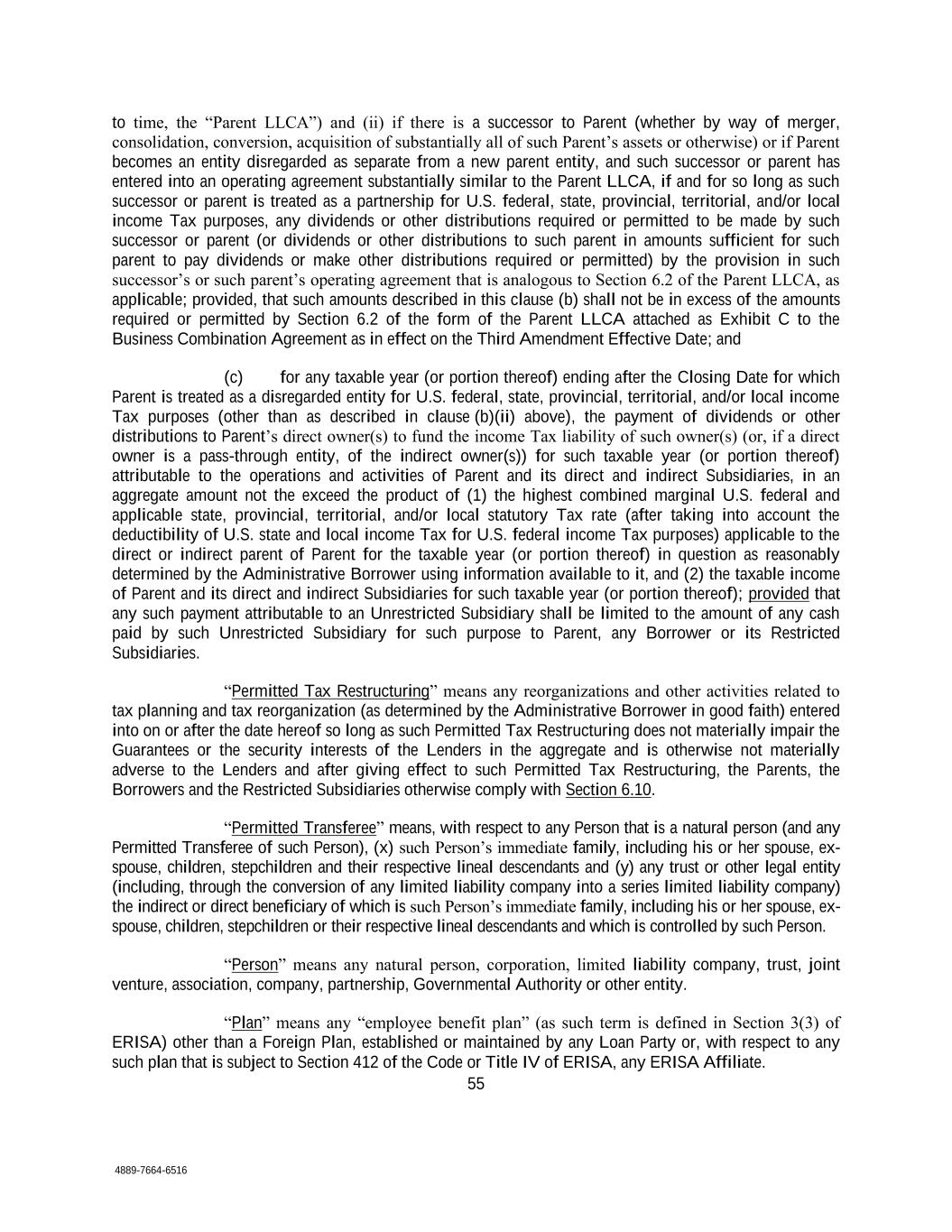 55 4889-7664-6516 to time, the “Parent LLCA”) and (ii) if there is a successor to Parent (whether by way of merger, consolidation, conversion, acquisition of substantially all of such Parent’s assets or otherwise) or if Parent becomes an entity disregarded as separate from a new parent entity, and such successor or parent has entered into an operating agreement substantially similar to the Parent LLCA, if and for so long as such successor or parent is treated as a partnership for U.S. federal, state, provincial, territorial, and/or local income Tax purposes, any dividends or other distributions required or permitted to be made by such successor or parent (or dividends or other distributions to such parent in amounts sufficient for such parent to pay dividends or make other distributions required or permitted) by the provision in such successor’s or such parent’s operating agreement that is analogous to Section 6.2 of the Parent LLCA, as applicable; provided, that such amounts described in this clause (b) shall not be in excess of the amounts required or permitted by Section 6.2 of the form of the Parent LLCA attached as Exhibit C to the Business Combination Agreement as in effect on the Third Amendment Effective Date; and (c) for any taxable year (or portion thereof) ending after the Closing Date for which Parent is treated as a disregarded entity for U.S. federal, state, provincial, territorial, and/or local income Tax purposes (other than as described in clause (b)(ii) above), the payment of dividends or other distributions to Parent’s direct owner(s) to fund the income Tax liability of such owner(s) (or, if a direct owner is a pass-through entity, of the indirect owner(s)) for such taxable year (or portion thereof) attributable to the operations and activities of Parent and its direct and indirect Subsidiaries, in an aggregate amount not the exceed the product of (1) the highest combined marginal U.S. federal and applicable state, provincial, territorial, and/or local statutory Tax rate (after taking into account the deductibility of U.S. state and local income Tax for U.S. federal income Tax purposes) applicable to the direct or indirect parent of Parent for the taxable year (or portion thereof) in question as reasonably determined by the Administrative Borrower using information available to it, and (2) the taxable income of Parent and its direct and indirect Subsidiaries for such taxable year (or portion thereof); provided that any such payment attributable to an Unrestricted Subsidiary shall be limited to the amount of any cash paid by such Unrestricted Subsidiary for such purpose to Parent, any Borrower or its Restricted Subsidiaries. “Permitted Tax Restructuring” means any reorganizations and other activities related to tax planning and tax reorganization (as determined by the Administrative Borrower in good faith) entered into on or after the date hereof so long as such Permitted Tax Restructuring does not materially impair the Guarantees or the security interests of the Lenders in the aggregate and is otherwise not materially adverse to the Lenders and after giving effect to such Permitted Tax Restructuring, the Parents, the Borrowers and the Restricted Subsidiaries otherwise comply with Section 6.10. “Permitted Transferee” means, with respect to any Person that is a natural person (and any Permitted Transferee of such Person), (x) such Person’s immediate family, including his or her spouse, ex- spouse, children, stepchildren and their respective lineal descendants and (y) any trust or other legal entity (including, through the conversion of any limited liability company into a series limited liability company) the indirect or direct beneficiary of which is such Person’s immediate family, including his or her spouse, ex- spouse, children, stepchildren or their respective lineal descendants and which is controlled by such Person. “Person” means any natural person, corporation, limited liability company, trust, joint venture, association, company, partnership, Governmental Authority or other entity. “Plan” means any “employee benefit plan” (as such term is defined in Section 3(3) of ERISA) other than a Foreign Plan, established or maintained by any Loan Party or, with respect to any such plan that is subject to Section 412 of the Code or Title IV of ERISA, any ERISA Affiliate.