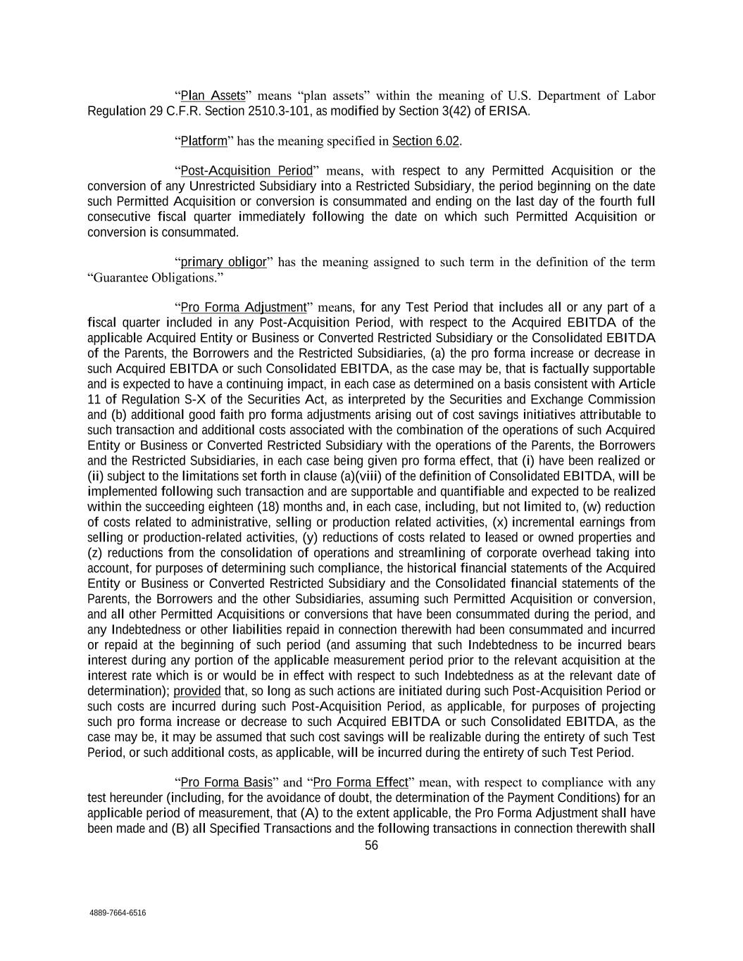 56 4889-7664-6516 “Plan Assets” means “plan assets” within the meaning of U.S. Department of Labor Regulation 29 C.F.R. Section 2510.3-101, as modified by Section 3(42) of ERISA. “Platform” has the meaning specified in Section 6.02. “Post-Acquisition Period” means, with respect to any Permitted Acquisition or the conversion of any Unrestricted Subsidiary into a Restricted Subsidiary, the period beginning on the date such Permitted Acquisition or conversion is consummated and ending on the last day of the fourth full consecutive fiscal quarter immediately following the date on which such Permitted Acquisition or conversion is consummated. “primary obligor” has the meaning assigned to such term in the definition of the term “Guarantee Obligations.” “Pro Forma Adjustment” means, for any Test Period that includes all or any part of a fiscal quarter included in any Post-Acquisition Period, with respect to the Acquired EBITDA of the applicable Acquired Entity or Business or Converted Restricted Subsidiary or the Consolidated EBITDA of the Parents, the Borrowers and the Restricted Subsidiaries, (a) the pro forma increase or decrease in such Acquired EBITDA or such Consolidated EBITDA, as the case may be, that is factually supportable and is expected to have a continuing impact, in each case as determined on a basis consistent with Article 11 of Regulation S-X of the Securities Act, as interpreted by the Securities and Exchange Commission and (b) additional good faith pro forma adjustments arising out of cost savings initiatives attributable to such transaction and additional costs associated with the combination of the operations of such Acquired Entity or Business or Converted Restricted Subsidiary with the operations of the Parents, the Borrowers and the Restricted Subsidiaries, in each case being given pro forma effect, that (i) have been realized or (ii) subject to the limitations set forth in clause (a)(viii) of the definition of Consolidated EBITDA, will be implemented following such transaction and are supportable and quantifiable and expected to be realized within the succeeding eighteen (18) months and, in each case, including, but not limited to, (w) reduction of costs related to administrative, selling or production related activities, (x) incremental earnings from selling or production-related activities, (y) reductions of costs related to leased or owned properties and (z) reductions from the consolidation of operations and streamlining of corporate overhead taking into account, for purposes of determining such compliance, the historical financial statements of the Acquired Entity or Business or Converted Restricted Subsidiary and the Consolidated financial statements of the Parents, the Borrowers and the other Subsidiaries, assuming such Permitted Acquisition or conversion, and all other Permitted Acquisitions or conversions that have been consummated during the period, and any Indebtedness or other liabilities repaid in connection therewith had been consummated and incurred or repaid at the beginning of such period (and assuming that such Indebtedness to be incurred bears interest during any portion of the applicable measurement period prior to the relevant acquisition at the interest rate which is or would be in effect with respect to such Indebtedness as at the relevant date of determination); provided that, so long as such actions are initiated during such Post-Acquisition Period or such costs are incurred during such Post-Acquisition Period, as applicable, for purposes of projecting such pro forma increase or decrease to such Acquired EBITDA or such Consolidated EBITDA, as the case may be, it may be assumed that such cost savings will be realizable during the entirety of such Test Period, or such additional costs, as applicable, will be incurred during the entirety of such Test Period. “Pro Forma Basis” and “Pro Forma Effect” mean, with respect to compliance with any test hereunder (including, for the avoidance of doubt, the determination of the Payment Conditions) for an applicable period of measurement, that (A) to the extent applicable, the Pro Forma Adjustment shall have been made and (B) all Specified Transactions and the following transactions in connection therewith shall