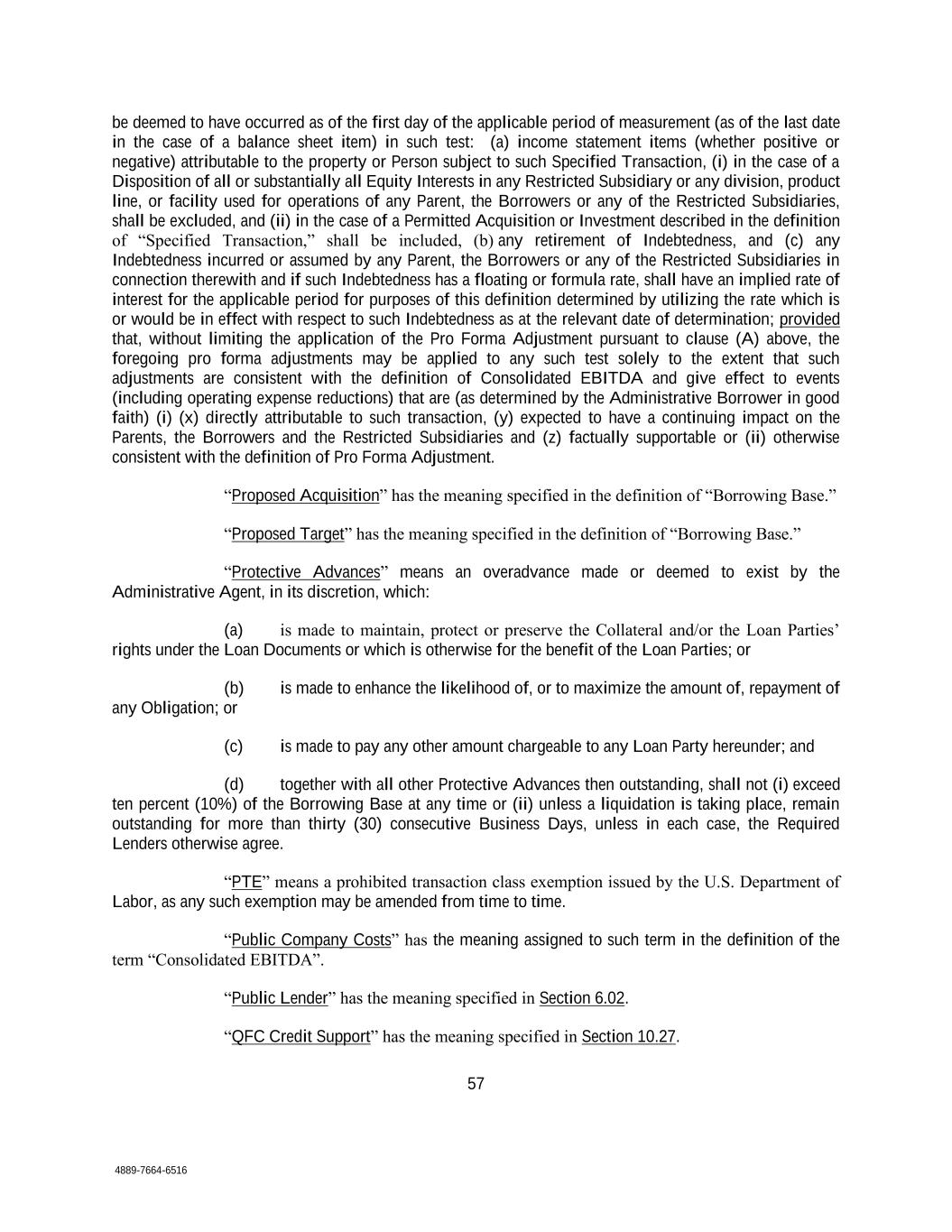 57 4889-7664-6516 be deemed to have occurred as of the first day of the applicable period of measurement (as of the last date in the case of a balance sheet item) in such test: (a) income statement items (whether positive or negative) attributable to the property or Person subject to such Specified Transaction, (i) in the case of a Disposition of all or substantially all Equity Interests in any Restricted Subsidiary or any division, product line, or facility used for operations of any Parent, the Borrowers or any of the Restricted Subsidiaries, shall be excluded, and (ii) in the case of a Permitted Acquisition or Investment described in the definition of “Specified Transaction,” shall be included, (b) any retirement of Indebtedness, and (c) any Indebtedness incurred or assumed by any Parent, the Borrowers or any of the Restricted Subsidiaries in connection therewith and if such Indebtedness has a floating or formula rate, shall have an implied rate of interest for the applicable period for purposes of this definition determined by utilizing the rate which is or would be in effect with respect to such Indebtedness as at the relevant date of determination; provided that, without limiting the application of the Pro Forma Adjustment pursuant to clause (A) above, the foregoing pro forma adjustments may be applied to any such test solely to the extent that such adjustments are consistent with the definition of Consolidated EBITDA and give effect to events (including operating expense reductions) that are (as determined by the Administrative Borrower in good faith) (i) (x) directly attributable to such transaction, (y) expected to have a continuing impact on the Parents, the Borrowers and the Restricted Subsidiaries and (z) factually supportable or (ii) otherwise consistent with the definition of Pro Forma Adjustment. “Proposed Acquisition” has the meaning specified in the definition of “Borrowing Base.” “Proposed Target” has the meaning specified in the definition of “Borrowing Base.” “Protective Advances” means an overadvance made or deemed to exist by the Administrative Agent, in its discretion, which: (a) is made to maintain, protect or preserve the Collateral and/or the Loan Parties’ rights under the Loan Documents or which is otherwise for the benefit of the Loan Parties; or (b) is made to enhance the likelihood of, or to maximize the amount of, repayment of any Obligation; or (c) is made to pay any other amount chargeable to any Loan Party hereunder; and (d) together with all other Protective Advances then outstanding, shall not (i) exceed ten percent (10%) of the Borrowing Base at any time or (ii) unless a liquidation is taking place, remain outstanding for more than thirty (30) consecutive Business Days, unless in each case, the Required Lenders otherwise agree. “PTE” means a prohibited transaction class exemption issued by the U.S. Department of Labor, as any such exemption may be amended from time to time. “Public Company Costs” has the meaning assigned to such term in the definition of the term “Consolidated EBITDA”. “Public Lender” has the meaning specified in Section 6.02. “QFC Credit Support” has the meaning specified in Section 10.27.