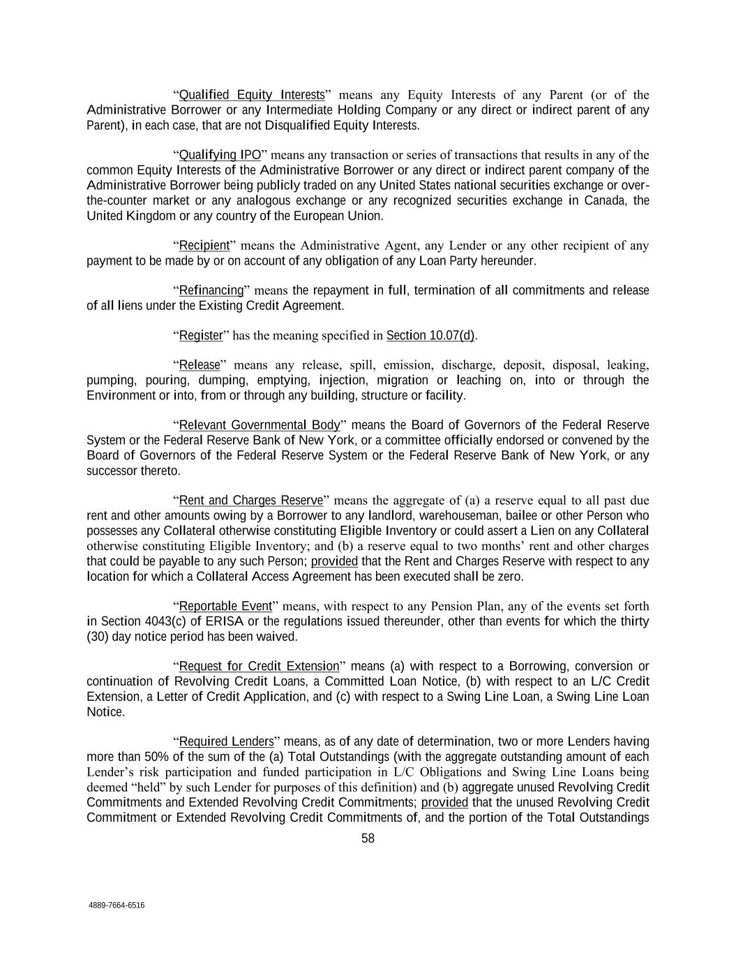 58 4889-7664-6516 “Qualified Equity Interests” means any Equity Interests of any Parent (or of the Administrative Borrower or any Intermediate Holding Company or any direct or indirect parent of any Parent), in each case, that are not Disqualified Equity Interests. “Qualifying IPO” means any transaction or series of transactions that results in any of the common Equity Interests of the Administrative Borrower or any direct or indirect parent company of the Administrative Borrower being publicly traded on any United States national securities exchange or over- the-counter market or any analogous exchange or any recognized securities exchange in Canada, the United Kingdom or any country of the European Union. “Recipient” means the Administrative Agent, any Lender or any other recipient of any payment to be made by or on account of any obligation of any Loan Party hereunder. “Refinancing” means the repayment in full, termination of all commitments and release of all liens under the Existing Credit Agreement. “Register” has the meaning specified in Section 10.07(d). “Release” means any release, spill, emission, discharge, deposit, disposal, leaking, pumping, pouring, dumping, emptying, injection, migration or leaching on, into or through the Environment or into, from or through any building, structure or facility. “Relevant Governmental Body” means the Board of Governors of the Federal Reserve System or the Federal Reserve Bank of New York, or a committee officially endorsed or convened by the Board of Governors of the Federal Reserve System or the Federal Reserve Bank of New York, or any successor thereto. “Rent and Charges Reserve” means the aggregate of (a) a reserve equal to all past due rent and other amounts owing by a Borrower to any landlord, warehouseman, bailee or other Person who possesses any Collateral otherwise constituting Eligible Inventory or could assert a Lien on any Collateral otherwise constituting Eligible Inventory; and (b) a reserve equal to two months’ rent and other charges that could be payable to any such Person; provided that the Rent and Charges Reserve with respect to any location for which a Collateral Access Agreement has been executed shall be zero. “Reportable Event” means, with respect to any Pension Plan, any of the events set forth in Section 4043(c) of ERISA or the regulations issued thereunder, other than events for which the thirty (30) day notice period has been waived. “Request for Credit Extension” means (a) with respect to a Borrowing, conversion or continuation of Revolving Credit Loans, a Committed Loan Notice, (b) with respect to an L/C Credit Extension, a Letter of Credit Application, and (c) with respect to a Swing Line Loan, a Swing Line Loan Notice. “Required Lenders” means, as of any date of determination, two or more Lenders having more than 50% of the sum of the (a) Total Outstandings (with the aggregate outstanding amount of each Lender’s risk participation and funded participation in L/C Obligations and Swing Line Loans being deemed “held” by such Lender for purposes of this definition) and (b) aggregate unused Revolving Credit Commitments and Extended Revolving Credit Commitments; provided that the unused Revolving Credit Commitment or Extended Revolving Credit Commitments of, and the portion of the Total Outstandings