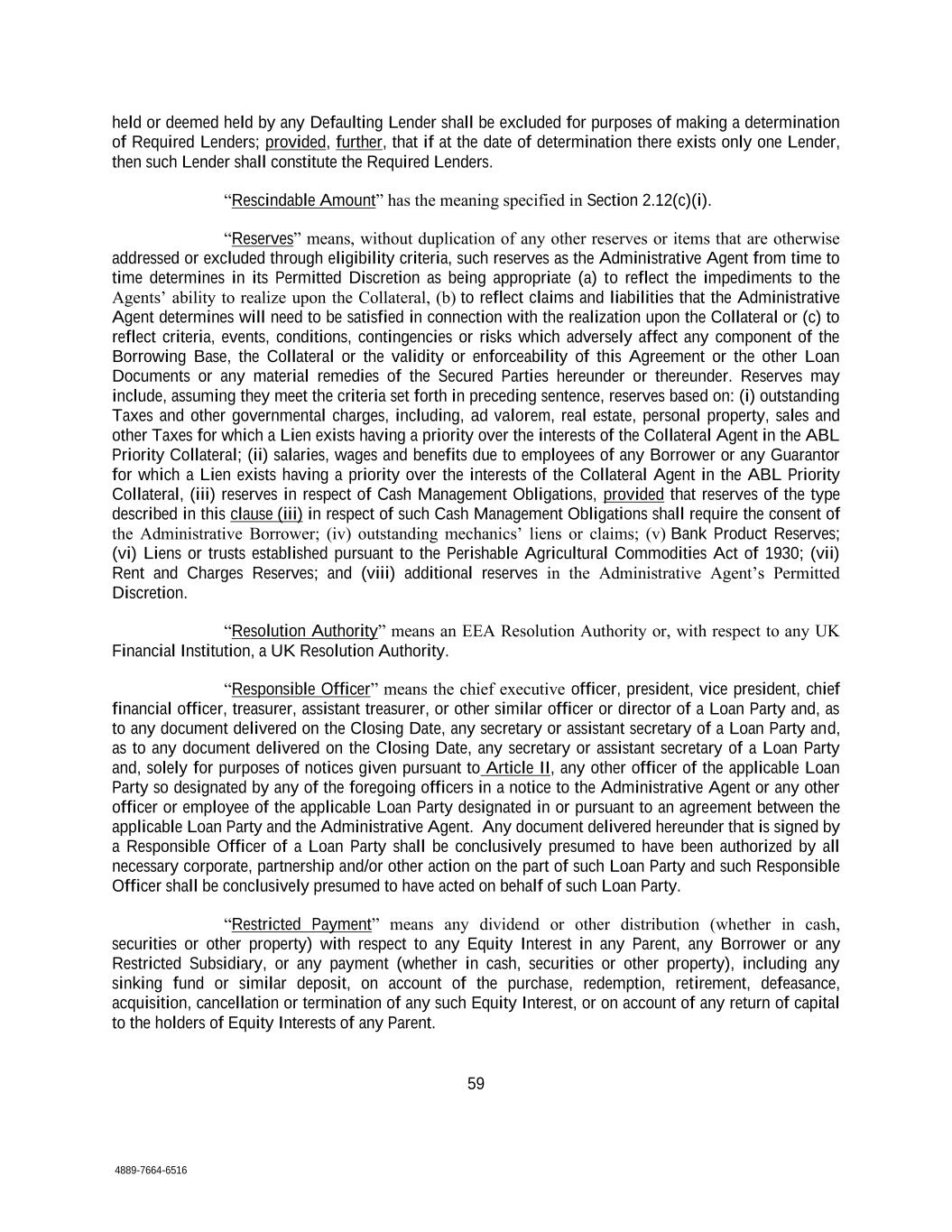 59 4889-7664-6516 held or deemed held by any Defaulting Lender shall be excluded for purposes of making a determination of Required Lenders; provided, further, that if at the date of determination there exists only one Lender, then such Lender shall constitute the Required Lenders. “Rescindable Amount” has the meaning specified in Section 2.12(c)(i). “Reserves” means, without duplication of any other reserves or items that are otherwise addressed or excluded through eligibility criteria, such reserves as the Administrative Agent from time to time determines in its Permitted Discretion as being appropriate (a) to reflect the impediments to the Agents’ ability to realize upon the Collateral, (b) to reflect claims and liabilities that the Administrative Agent determines will need to be satisfied in connection with the realization upon the Collateral or (c) to reflect criteria, events, conditions, contingencies or risks which adversely affect any component of the Borrowing Base, the Collateral or the validity or enforceability of this Agreement or the other Loan Documents or any material remedies of the Secured Parties hereunder or thereunder. Reserves may include, assuming they meet the criteria set forth in preceding sentence, reserves based on: (i) outstanding Taxes and other governmental charges, including, ad valorem, real estate, personal property, sales and other Taxes for which a Lien exists having a priority over the interests of the Collateral Agent in the ABL Priority Collateral; (ii) salaries, wages and benefits due to employees of any Borrower or any Guarantor for which a Lien exists having a priority over the interests of the Collateral Agent in the ABL Priority Collateral, (iii) reserves in respect of Cash Management Obligations, provided that reserves of the type described in this clause (iii) in respect of such Cash Management Obligations shall require the consent of the Administrative Borrower; (iv) outstanding mechanics’ liens or claims; (v) Bank Product Reserves; (vi) Liens or trusts established pursuant to the Perishable Agricultural Commodities Act of 1930; (vii) Rent and Charges Reserves; and (viii) additional reserves in the Administrative Agent’s Permitted Discretion. “Resolution Authority” means an EEA Resolution Authority or, with respect to any UK Financial Institution, a UK Resolution Authority. “Responsible Officer” means the chief executive officer, president, vice president, chief financial officer, treasurer, assistant treasurer, or other similar officer or director of a Loan Party and, as to any document delivered on the Closing Date, any secretary or assistant secretary of a Loan Party and, as to any document delivered on the Closing Date, any secretary or assistant secretary of a Loan Party and, solely for purposes of notices given pursuant to Article II, any other officer of the applicable Loan Party so designated by any of the foregoing officers in a notice to the Administrative Agent or any other officer or employee of the applicable Loan Party designated in or pursuant to an agreement between the applicable Loan Party and the Administrative Agent. Any document delivered hereunder that is signed by a Responsible Officer of a Loan Party shall be conclusively presumed to have been authorized by all necessary corporate, partnership and/or other action on the part of such Loan Party and such Responsible Officer shall be conclusively presumed to have acted on behalf of such Loan Party. “Restricted Payment” means any dividend or other distribution (whether in cash, securities or other property) with respect to any Equity Interest in any Parent, any Borrower or any Restricted Subsidiary, or any payment (whether in cash, securities or other property), including any sinking fund or similar deposit, on account of the purchase, redemption, retirement, defeasance, acquisition, cancellation or termination of any such Equity Interest, or on account of any return of capital to the holders of Equity Interests of any Parent.