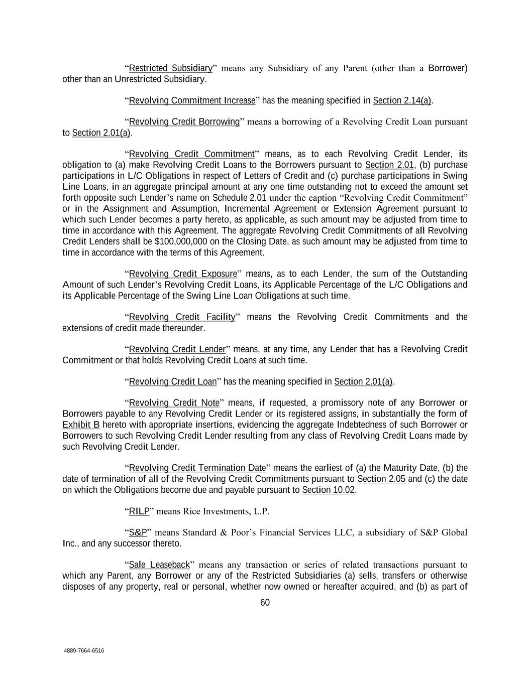 60 4889-7664-6516 “Restricted Subsidiary” means any Subsidiary of any Parent (other than a Borrower) other than an Unrestricted Subsidiary. “Revolving Commitment Increase” has the meaning specified in Section 2.14(a). “Revolving Credit Borrowing” means a borrowing of a Revolving Credit Loan pursuant to Section 2.01(a). “Revolving Credit Commitment” means, as to each Revolving Credit Lender, its obligation to (a) make Revolving Credit Loans to the Borrowers pursuant to Section 2.01, (b) purchase participations in L/C Obligations in respect of Letters of Credit and (c) purchase participations in Swing Line Loans, in an aggregate principal amount at any one time outstanding not to exceed the amount set forth opposite such Lender’s name on Schedule 2.01 under the caption “Revolving Credit Commitment” or in the Assignment and Assumption, Incremental Agreement or Extension Agreement pursuant to which such Lender becomes a party hereto, as applicable, as such amount may be adjusted from time to time in accordance with this Agreement. The aggregate Revolving Credit Commitments of all Revolving Credit Lenders shall be $100,000,000 on the Closing Date, as such amount may be adjusted from time to time in accordance with the terms of this Agreement. “Revolving Credit Exposure” means, as to each Lender, the sum of the Outstanding Amount of such Lender’s Revolving Credit Loans, its Applicable Percentage of the L/C Obligations and its Applicable Percentage of the Swing Line Loan Obligations at such time. “Revolving Credit Facility” means the Revolving Credit Commitments and the extensions of credit made thereunder. “Revolving Credit Lender” means, at any time, any Lender that has a Revolving Credit Commitment or that holds Revolving Credit Loans at such time. “Revolving Credit Loan” has the meaning specified in Section 2.01(a). “Revolving Credit Note” means, if requested, a promissory note of any Borrower or Borrowers payable to any Revolving Credit Lender or its registered assigns, in substantially the form of Exhibit B hereto with appropriate insertions, evidencing the aggregate Indebtedness of such Borrower or Borrowers to such Revolving Credit Lender resulting from any class of Revolving Credit Loans made by such Revolving Credit Lender. “Revolving Credit Termination Date” means the earliest of (a) the Maturity Date, (b) the date of termination of all of the Revolving Credit Commitments pursuant to Section 2.05 and (c) the date on which the Obligations become due and payable pursuant to Section 10.02. “RILP” means Rice Investments, L.P. “S&P” means Standard & Poor’s Financial Services LLC, a subsidiary of S&P Global Inc., and any successor thereto. “Sale Leaseback” means any transaction or series of related transactions pursuant to which any Parent, any Borrower or any of the Restricted Subsidiaries (a) sells, transfers or otherwise disposes of any property, real or personal, whether now owned or hereafter acquired, and (b) as part of