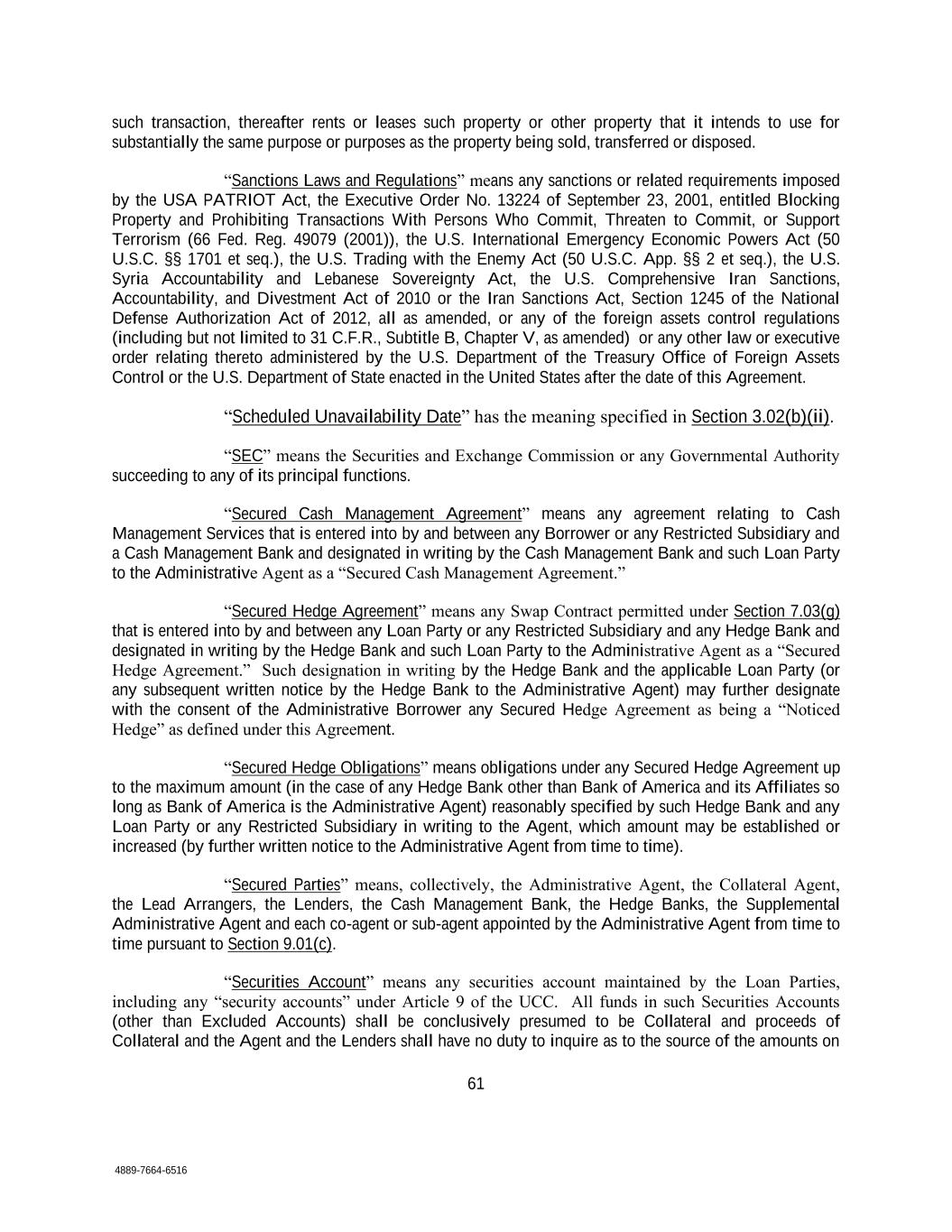 61 4889-7664-6516 such transaction, thereafter rents or leases such property or other property that it intends to use for substantially the same purpose or purposes as the property being sold, transferred or disposed. “Sanctions Laws and Regulations” means any sanctions or related requirements imposed by the USA PATRIOT Act, the Executive Order No. 13224 of September 23, 2001, entitled Blocking Property and Prohibiting Transactions With Persons Who Commit, Threaten to Commit, or Support Terrorism (66 Fed. Reg. 49079 (2001)), the U.S. International Emergency Economic Powers Act (50 U.S.C. §§ 1701 et seq.), the U.S. Trading with the Enemy Act (50 U.S.C. App. §§ 2 et seq.), the U.S. Syria Accountability and Lebanese Sovereignty Act, the U.S. Comprehensive Iran Sanctions, Accountability, and Divestment Act of 2010 or the Iran Sanctions Act, Section 1245 of the National Defense Authorization Act of 2012, all as amended, or any of the foreign assets control regulations (including but not limited to 31 C.F.R., Subtitle B, Chapter V, as amended) or any other law or executive order relating thereto administered by the U.S. Department of the Treasury Office of Foreign Assets Control or the U.S. Department of State enacted in the United States after the date of this Agreement. “Scheduled Unavailability Date” has the meaning specified in Section 3.02(b)(ii). “SEC” means the Securities and Exchange Commission or any Governmental Authority succeeding to any of its principal functions. “Secured Cash Management Agreement” means any agreement relating to Cash Management Services that is entered into by and between any Borrower or any Restricted Subsidiary and a Cash Management Bank and designated in writing by the Cash Management Bank and such Loan Party to the Administrative Agent as a “Secured Cash Management Agreement.” “Secured Hedge Agreement” means any Swap Contract permitted under Section 7.03(g) that is entered into by and between any Loan Party or any Restricted Subsidiary and any Hedge Bank and designated in writing by the Hedge Bank and such Loan Party to the Administrative Agent as a “Secured Hedge Agreement.” Such designation in writing by the Hedge Bank and the applicable Loan Party (or any subsequent written notice by the Hedge Bank to the Administrative Agent) may further designate with the consent of the Administrative Borrower any Secured Hedge Agreement as being a “Noticed Hedge” as defined under this Agreement. “Secured Hedge Obligations” means obligations under any Secured Hedge Agreement up to the maximum amount (in the case of any Hedge Bank other than Bank of America and its Affiliates so long as Bank of America is the Administrative Agent) reasonably specified by such Hedge Bank and any Loan Party or any Restricted Subsidiary in writing to the Agent, which amount may be established or increased (by further written notice to the Administrative Agent from time to time). “Secured Parties” means, collectively, the Administrative Agent, the Collateral Agent, the Lead Arrangers, the Lenders, the Cash Management Bank, the Hedge Banks, the Supplemental Administrative Agent and each co-agent or sub-agent appointed by the Administrative Agent from time to time pursuant to Section 9.01(c). “Securities Account” means any securities account maintained by the Loan Parties, including any “security accounts” under Article 9 of the UCC. All funds in such Securities Accounts (other than Excluded Accounts) shall be conclusively presumed to be Collateral and proceeds of Collateral and the Agent and the Lenders shall have no duty to inquire as to the source of the amounts on