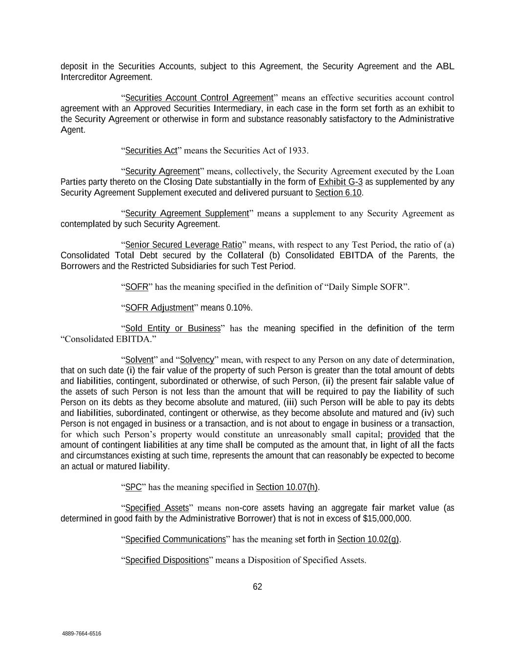 62 4889-7664-6516 deposit in the Securities Accounts, subject to this Agreement, the Security Agreement and the ABL Intercreditor Agreement. “Securities Account Control Agreement” means an effective securities account control agreement with an Approved Securities Intermediary, in each case in the form set forth as an exhibit to the Security Agreement or otherwise in form and substance reasonably satisfactory to the Administrative Agent. “Securities Act” means the Securities Act of 1933. “Security Agreement” means, collectively, the Security Agreement executed by the Loan Parties party thereto on the Closing Date substantially in the form of Exhibit G-3 as supplemented by any Security Agreement Supplement executed and delivered pursuant to Section 6.10. “Security Agreement Supplement” means a supplement to any Security Agreement as contemplated by such Security Agreement. “Senior Secured Leverage Ratio” means, with respect to any Test Period, the ratio of (a) Consolidated Total Debt secured by the Collateral (b) Consolidated EBITDA of the Parents, the Borrowers and the Restricted Subsidiaries for such Test Period. “SOFR” has the meaning specified in the definition of “Daily Simple SOFR”. “SOFR Adjustment” means 0.10%. “Sold Entity or Business” has the meaning specified in the definition of the term “Consolidated EBITDA.” “Solvent” and “Solvency” mean, with respect to any Person on any date of determination, that on such date (i) the fair value of the property of such Person is greater than the total amount of debts and liabilities, contingent, subordinated or otherwise, of such Person, (ii) the present fair salable value of the assets of such Person is not less than the amount that will be required to pay the liability of such Person on its debts as they become absolute and matured, (iii) such Person will be able to pay its debts and liabilities, subordinated, contingent or otherwise, as they become absolute and matured and (iv) such Person is not engaged in business or a transaction, and is not about to engage in business or a transaction, for which such Person’s property would constitute an unreasonably small capital; provided that the amount of contingent liabilities at any time shall be computed as the amount that, in light of all the facts and circumstances existing at such time, represents the amount that can reasonably be expected to become an actual or matured liability. “SPC” has the meaning specified in Section 10.07(h). “Specified Assets” means non-core assets having an aggregate fair market value (as determined in good faith by the Administrative Borrower) that is not in excess of $15,000,000. “Specified Communications” has the meaning set forth in Section 10.02(g). “Specified Dispositions” means a Disposition of Specified Assets.
