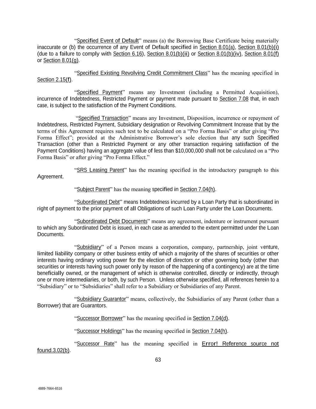63 4889-7664-6516 “Specified Event of Default” means (a) the Borrowing Base Certificate being materially inaccurate or (b) the occurrence of any Event of Default specified in Section 8.01(a), Section 8.01(b)(i) (due to a failure to comply with Section 6.16), Section 8.01(b)(ii) or Section 8.01(b)(iv), Section 8.01(f) or Section 8.01(g). “Specified Existing Revolving Credit Commitment Class” has the meaning specified in Section 2.15(f). “Specified Payment” means any Investment (including a Permitted Acquisition), incurrence of Indebtedness, Restricted Payment or payment made pursuant to Section 7.08 that, in each case, is subject to the satisfaction of the Payment Conditions. “Specified Transaction” means any Investment, Disposition, incurrence or repayment of Indebtedness, Restricted Payment, Subsidiary designation or Revolving Commitment Increase that by the terms of this Agreement requires such test to be calculated on a “Pro Forma Basis” or after giving “Pro Forma Effect”; provided at the Administrative Borrower’s sole election that any such Specified Transaction (other than a Restricted Payment or any other transaction requiring satisfaction of the Payment Conditions) having an aggregate value of less than $10,000,000 shall not be calculated on a “Pro Forma Basis” or after giving “Pro Forma Effect.” “SRS Leasing Parent” has the meaning specified in the introductory paragraph to this Agreement. “Subject Parent” has the meaning specified in Section 7.04(h). “Subordinated Debt” means Indebtedness incurred by a Loan Party that is subordinated in right of payment to the prior payment of all Obligations of such Loan Party under the Loan Documents. “Subordinated Debt Documents” means any agreement, indenture or instrument pursuant to which any Subordinated Debt is issued, in each case as amended to the extent permitted under the Loan Documents. “Subsidiary” of a Person means a corporation, company, partnership, joint venture, limited liability company or other business entity of which a majority of the shares of securities or other interests having ordinary voting power for the election of directors or other governing body (other than securities or interests having such power only by reason of the happening of a contingency) are at the time beneficially owned, or the management of which is otherwise controlled, directly or indirectly, through one or more intermediaries, or both, by such Person. Unless otherwise specified, all references herein to a “Subsidiary” or to “Subsidiaries” shall refer to a Subsidiary or Subsidiaries of any Parent. “Subsidiary Guarantor” means, collectively, the Subsidiaries of any Parent (other than a Borrower) that are Guarantors. “Successor Borrower” has the meaning specified in Section 7.04(d). “Successor Holdings” has the meaning specified in Section 7.04(h). “Successor Rate” has the meaning specified in Error! Reference source not found.3.02(b).
