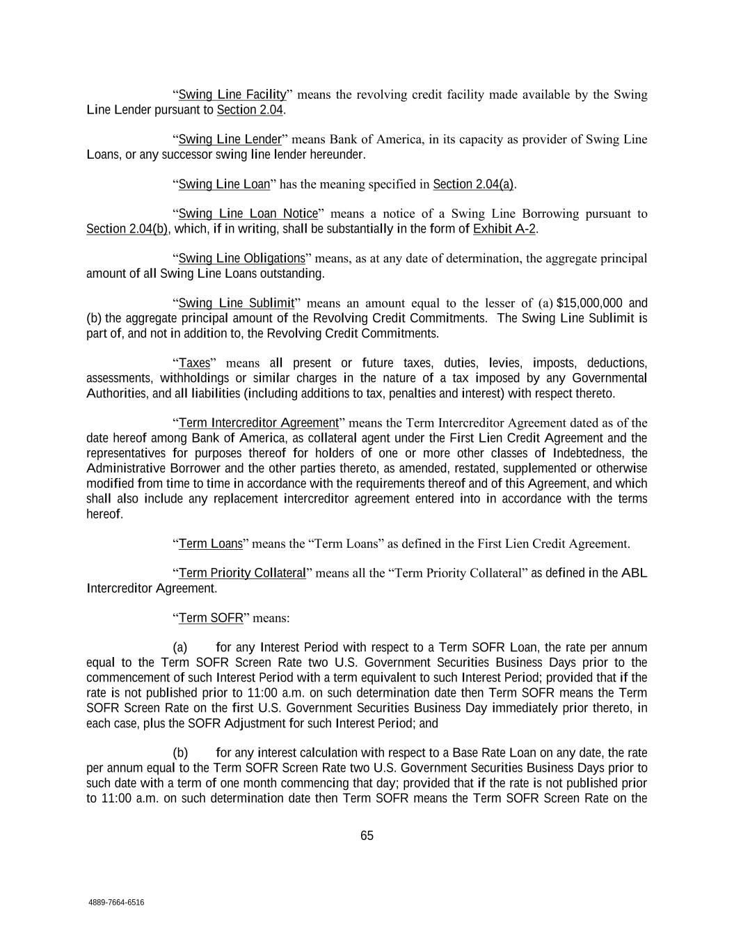 65 4889-7664-6516 “Swing Line Facility” means the revolving credit facility made available by the Swing Line Lender pursuant to Section 2.04. “Swing Line Lender” means Bank of America, in its capacity as provider of Swing Line Loans, or any successor swing line lender hereunder. “Swing Line Loan” has the meaning specified in Section 2.04(a). “Swing Line Loan Notice” means a notice of a Swing Line Borrowing pursuant to Section 2.04(b), which, if in writing, shall be substantially in the form of Exhibit A-2. “Swing Line Obligations” means, as at any date of determination, the aggregate principal amount of all Swing Line Loans outstanding. “Swing Line Sublimit” means an amount equal to the lesser of (a) $15,000,000 and (b) the aggregate principal amount of the Revolving Credit Commitments. The Swing Line Sublimit is part of, and not in addition to, the Revolving Credit Commitments. “Taxes” means all present or future taxes, duties, levies, imposts, deductions, assessments, withholdings or similar charges in the nature of a tax imposed by any Governmental Authorities, and all liabilities (including additions to tax, penalties and interest) with respect thereto. “Term Intercreditor Agreement” means the Term Intercreditor Agreement dated as of the date hereof among Bank of America, as collateral agent under the First Lien Credit Agreement and the representatives for purposes thereof for holders of one or more other classes of Indebtedness, the Administrative Borrower and the other parties thereto, as amended, restated, supplemented or otherwise modified from time to time in accordance with the requirements thereof and of this Agreement, and which shall also include any replacement intercreditor agreement entered into in accordance with the terms hereof. “Term Loans” means the “Term Loans” as defined in the First Lien Credit Agreement. “Term Priority Collateral” means all the “Term Priority Collateral” as defined in the ABL Intercreditor Agreement. “Term SOFR” means: (a) for any Interest Period with respect to a Term SOFR Loan, the rate per annum equal to the Term SOFR Screen Rate two U.S. Government Securities Business Days prior to the commencement of such Interest Period with a term equivalent to such Interest Period; provided that if the rate is not published prior to 11:00 a.m. on such determination date then Term SOFR means the Term SOFR Screen Rate on the first U.S. Government Securities Business Day immediately prior thereto, in each case, plus the SOFR Adjustment for such Interest Period; and (b) for any interest calculation with respect to a Base Rate Loan on any date, the rate per annum equal to the Term SOFR Screen Rate two U.S. Government Securities Business Days prior to such date with a term of one month commencing that day; provided that if the rate is not published prior to 11:00 a.m. on such determination date then Term SOFR means the Term SOFR Screen Rate on the